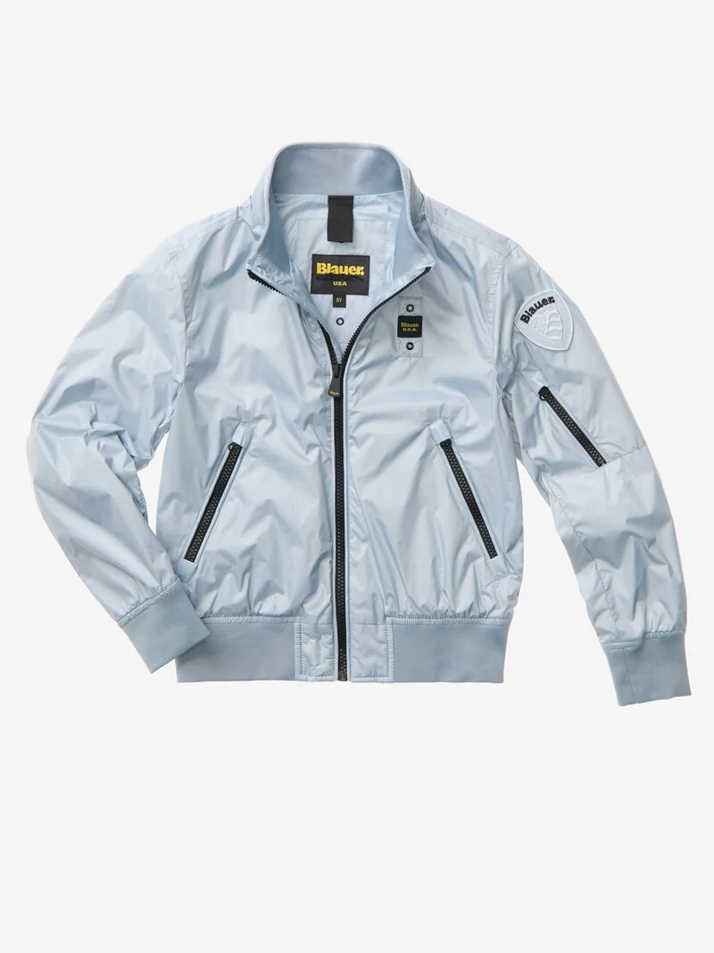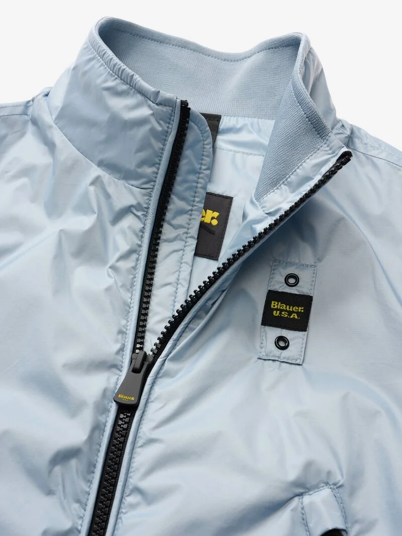 Bomber dal collo alto con tessuto dai riflessi unici ed eleganti. Ulteriore taschina con zip sulla manica sinistra. Comodo e versatile questo capo può essere utile soprattutto nelle fresche serate estive.