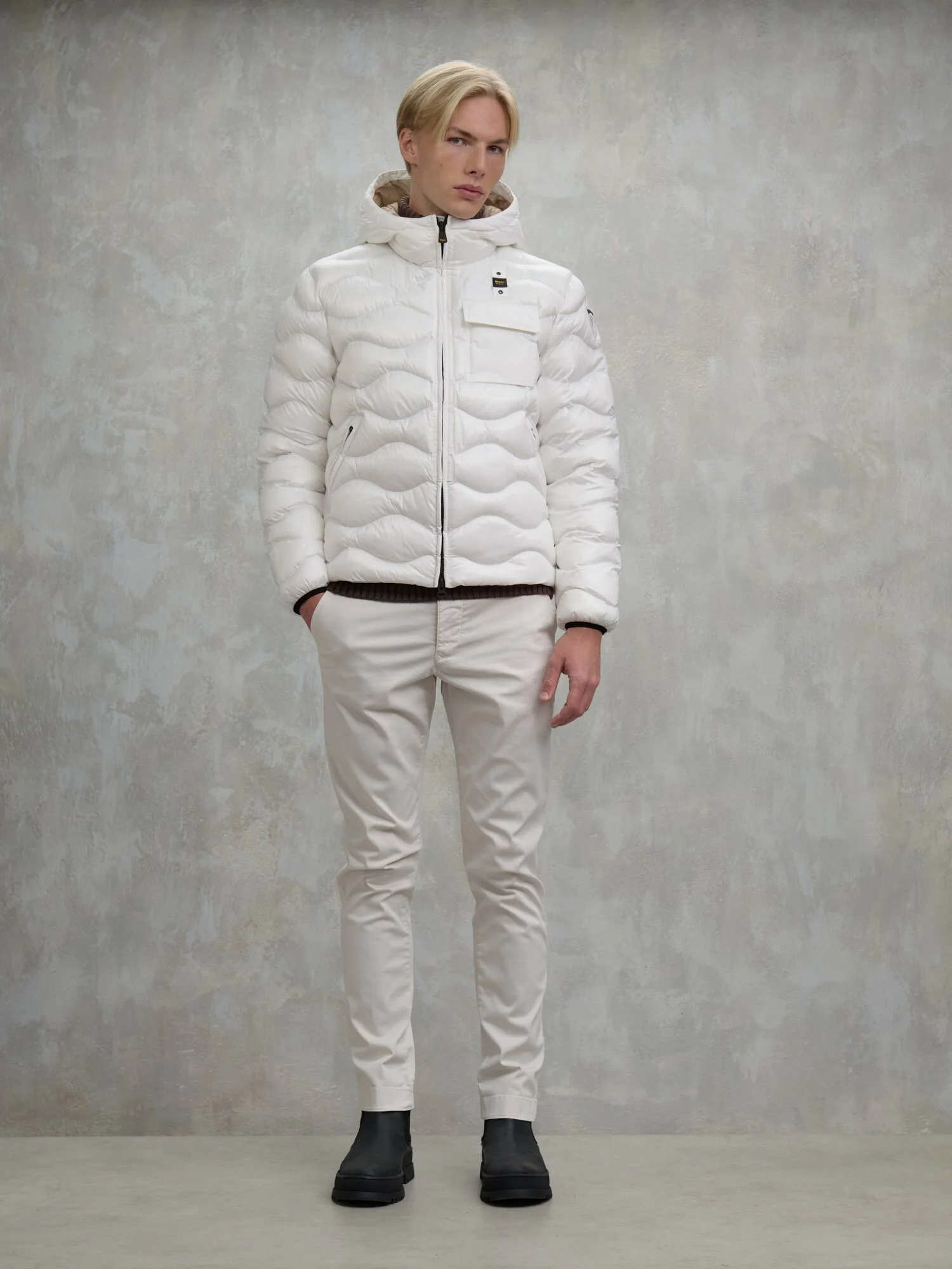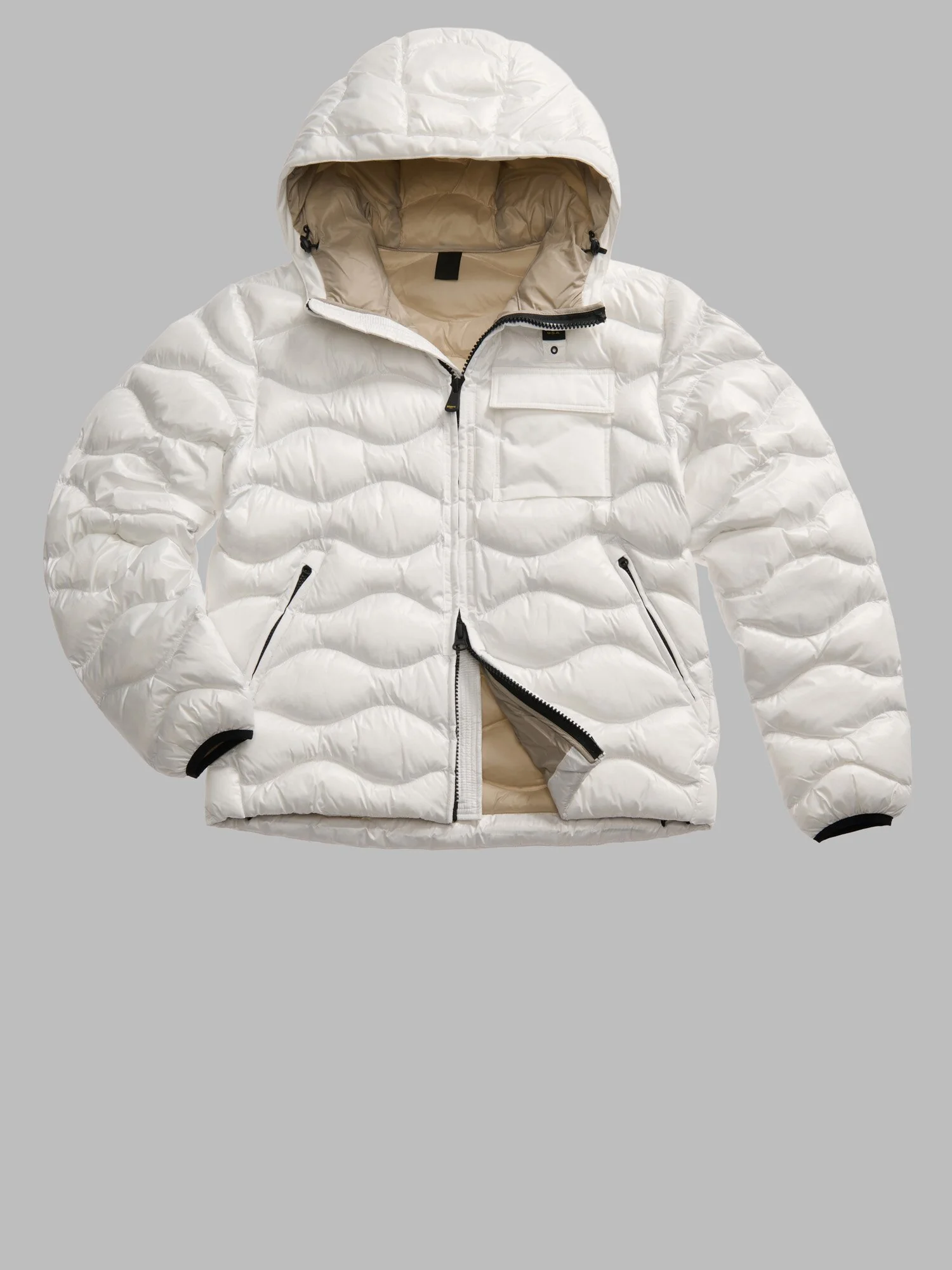 Inserti in taslan in tono sul profilo del cappuccio e delle zip e nel taschino applicato sul petto.