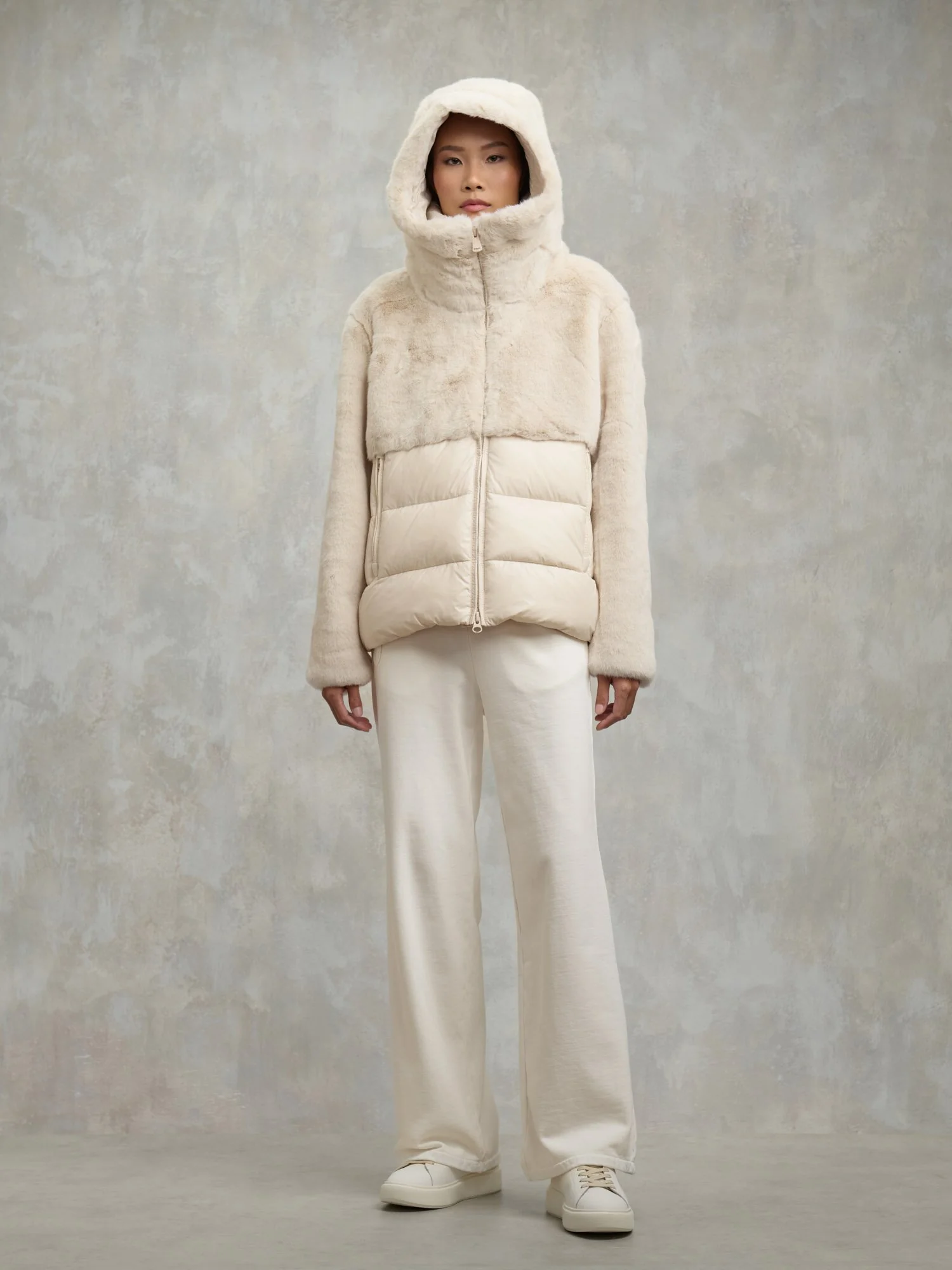 Giubbetto in ecopelliccia nella parte superiore e in nylon lucido nella parte inferiore. Caldo cappuccio ed impuntura sotto a righe orizzontali; capo pensato per proteggere dagli inverni più rigidi senza rinunciare allo stile.