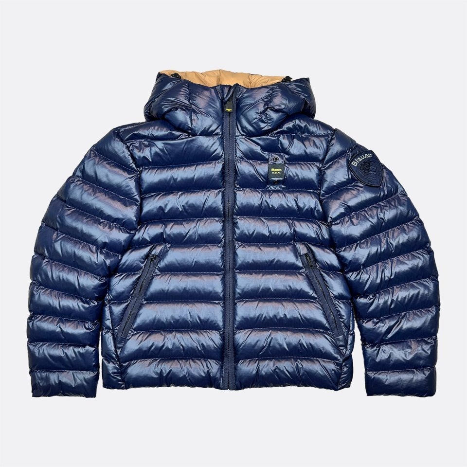 Giubbino Blauer, chiusura con zip frontale, tasche laterali con chiusura a zip, cappuccio fisso e imbottito, sulla manica sinistra cè una patch con un logo.