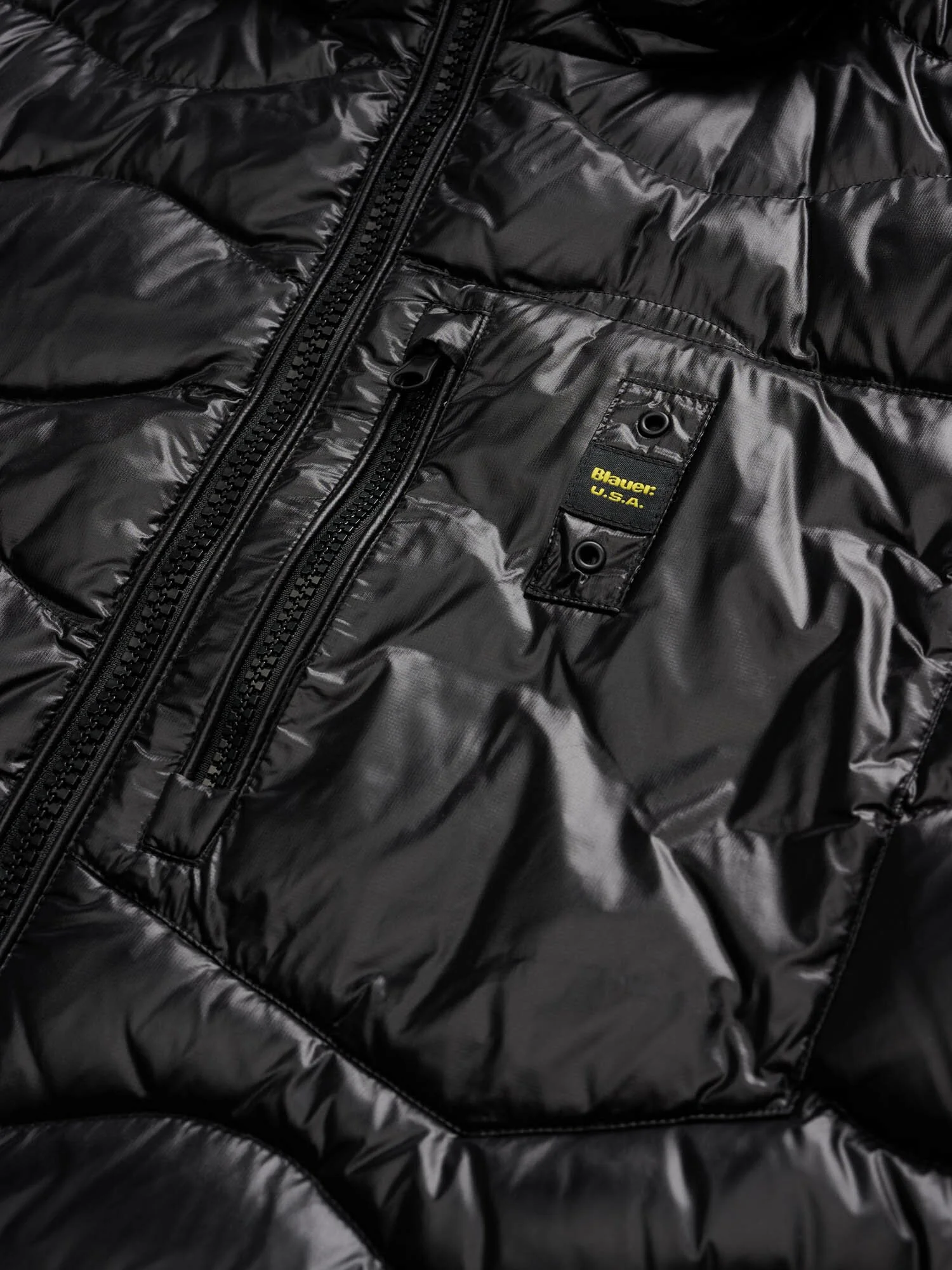 Piumino trapuntato ad onde orizzontali. Taschina applicata sul petto a sinistra per donare al capo iconico Blauer un tocco più funzionale. Imbottitura naturale in piuma, calda e non ingombrante; dedicato a chi vuole essere sempre alla moda in ogni occasione.