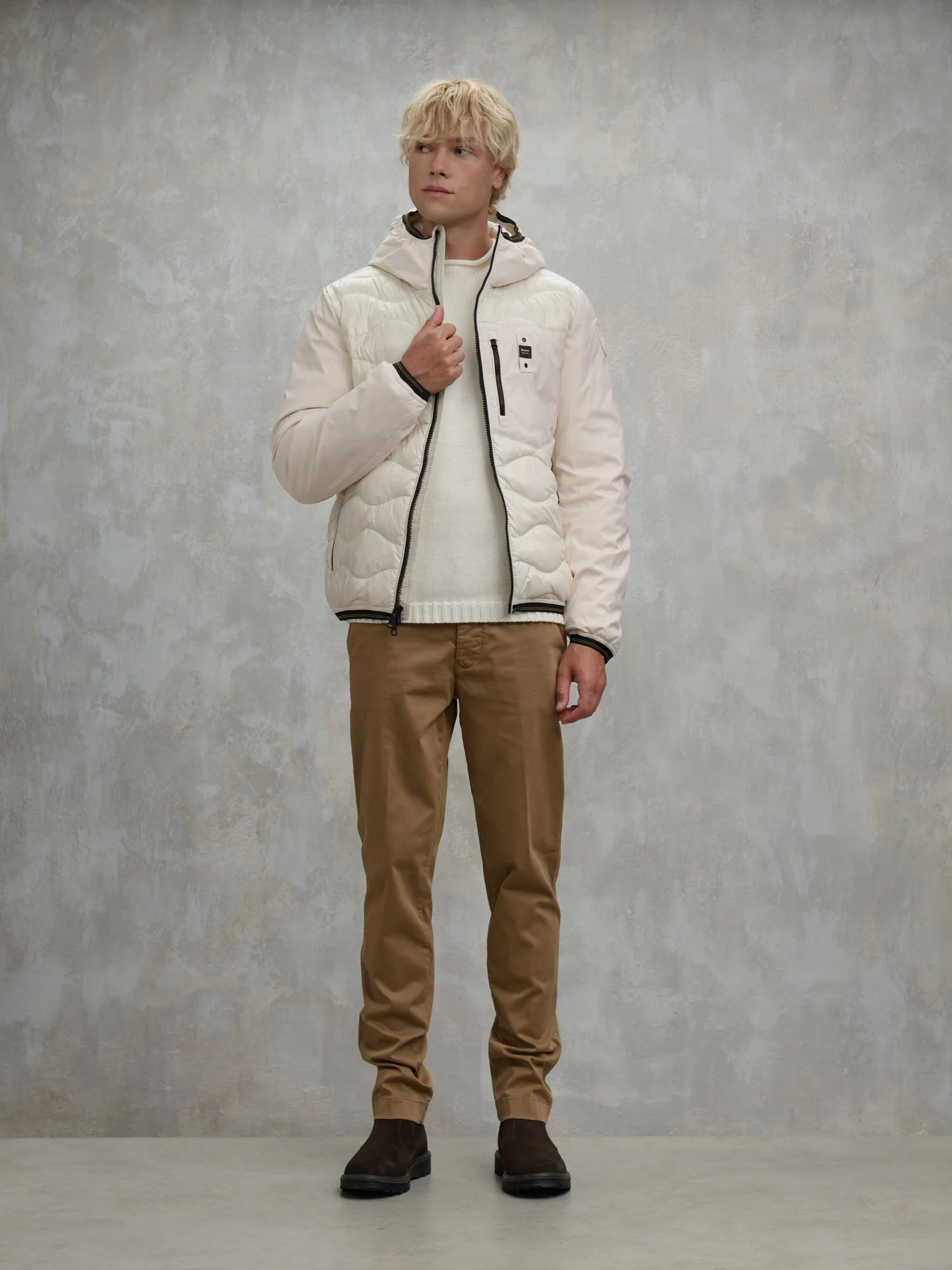 Piumino monocromatico in neoprene leggero e liscio sulle maniche e in nylon lucido impunturato ad onde sul corpo. Imbottitura mista per avere caldo anche in condizioni meteo avverse.