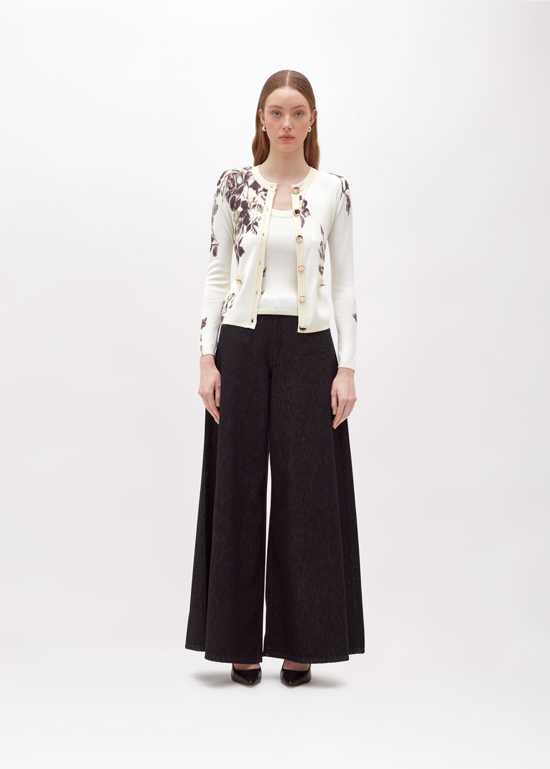 Stampa floreale piazzata a rose per il completo in maglia unita di viscosa stretch. il cardigan ha scollo tondo, chiusura con bottoni gioiello in metallo, pattine con bottoni, maniche lunghe, finiture leggermente a contrasto, spalline imbottite. il top è aderente e senza maniche con ampio scollo tondo. diverse opzioni di stile per un item versatile del guardaroba.