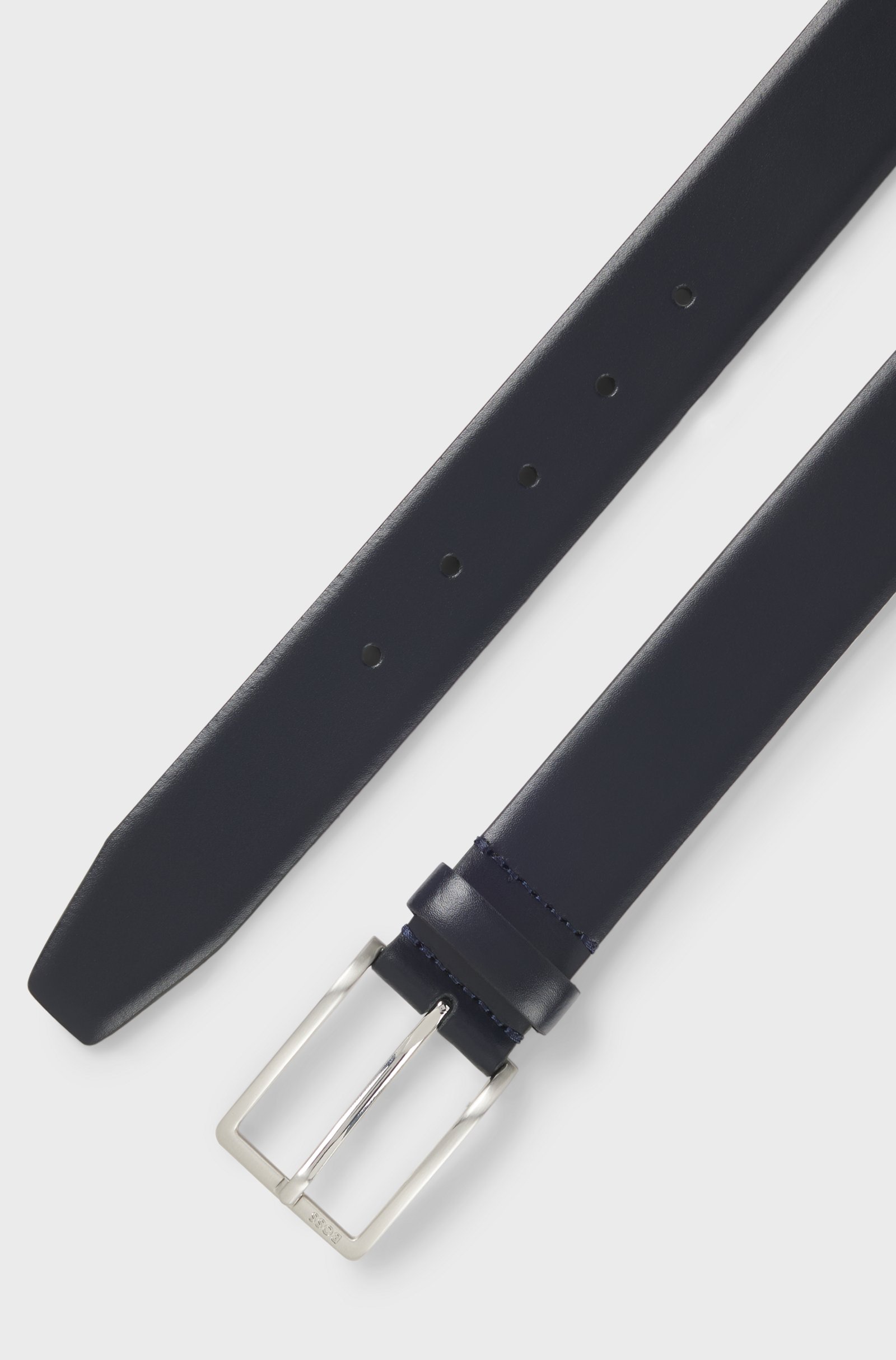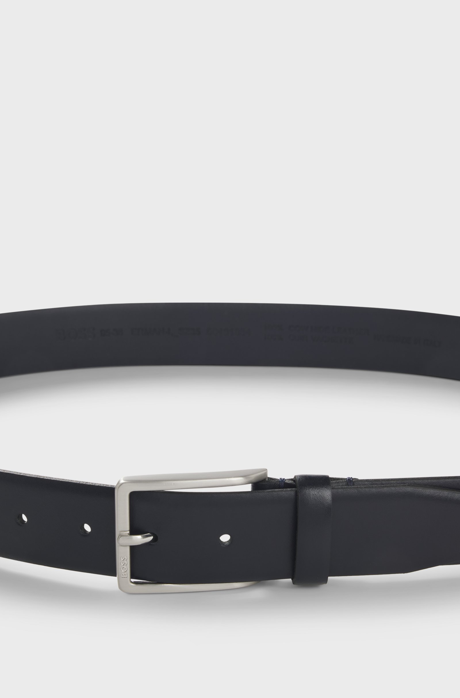 Una raffinata cintura business BOSS Uomo. Realizzata in ricca pelle italiana, con accessori in argento spazzolato e logo in rilievo per un tocco sofisticato. Per un fit perfetto, consigliamo di ordinare la cintura di una taglia in più rispetto alla misura della vita. Questo prodotto contiene almeno l'80% di materie prime di qualità superiore. La pelle usata per realizzare questo prodotto proviene da concerie certificate Gold dal Leather Working Group.