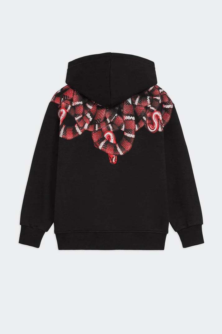 Felpa in 100% cotone dal fit morbido con cappuccio e tasca a marsupio. Stampa continua fronte e retro con iconico motivo Snake County of Milan.