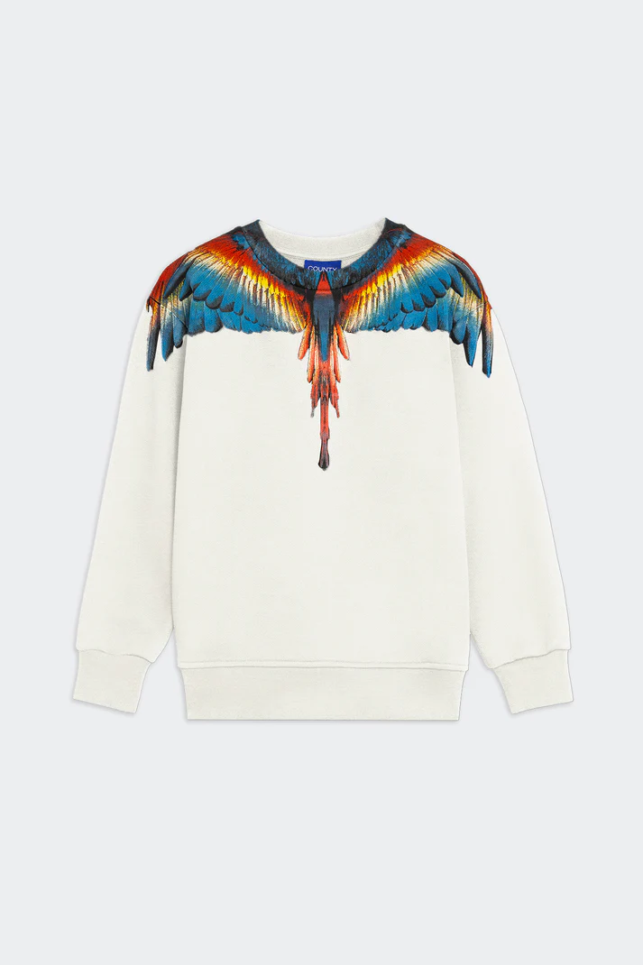 Felpa girocollo in 100% cotone dal fit morbido. Stampa continua fronte e retro con motivo grafico iconico con ali e piumaggio multicolore. Polsini e fondo in costina.
