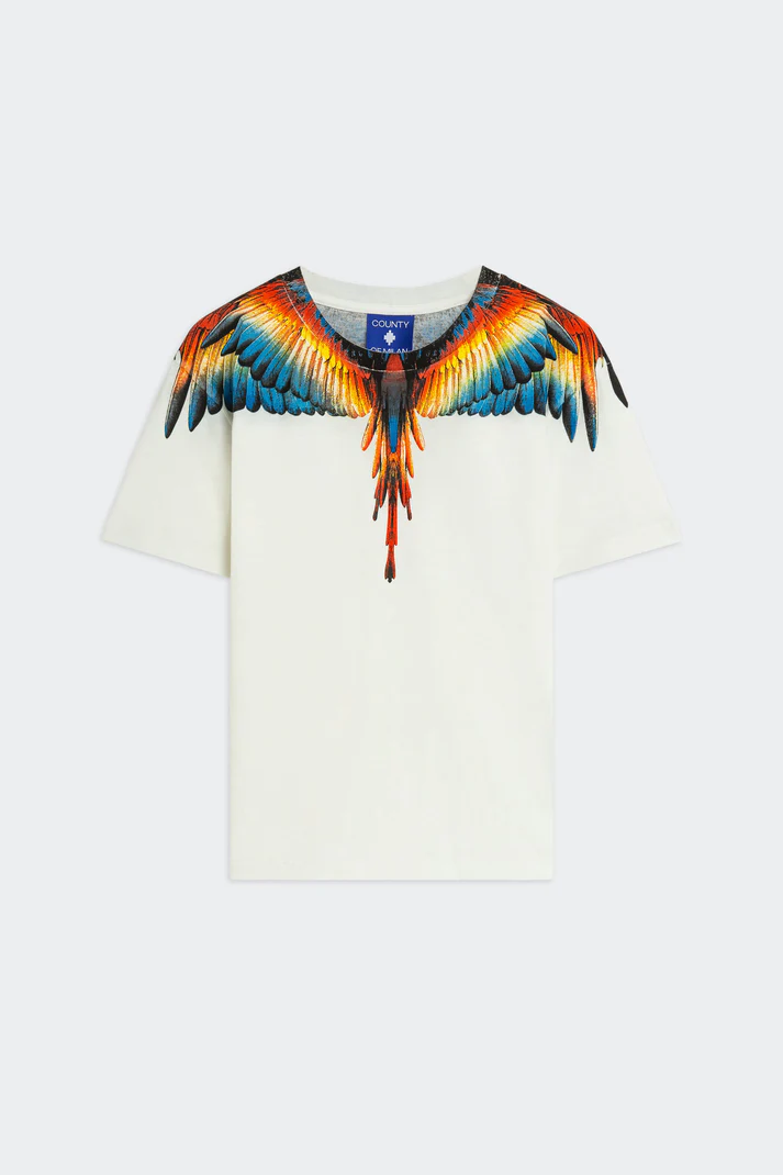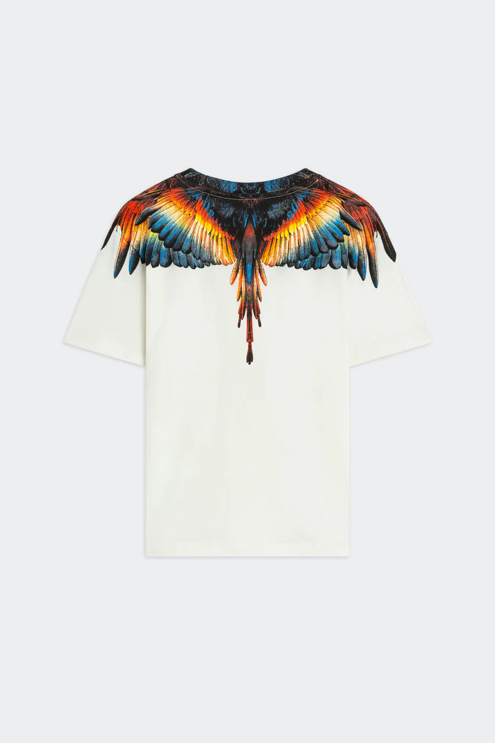 T-shirt in 100% cotone dal fit morbido. Stampa continua fronte e retro con motivo grafico iconico con ali e piumaggio multicolore.
