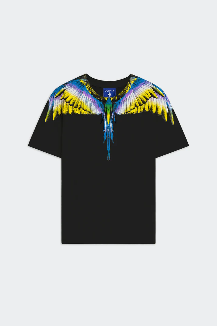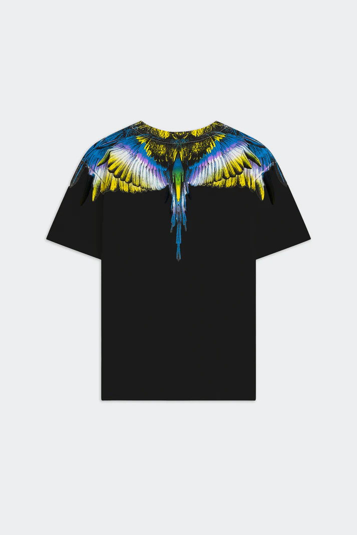 T-shirt in 100% cotone dal fit morbido. Stampa continua fronte e retro con motivo grafico iconico con ali e piumaggio multicolore.