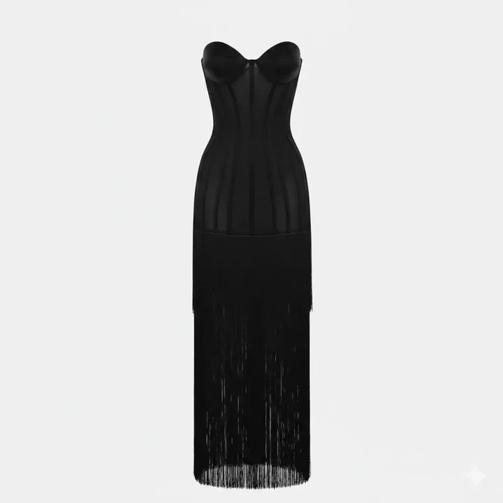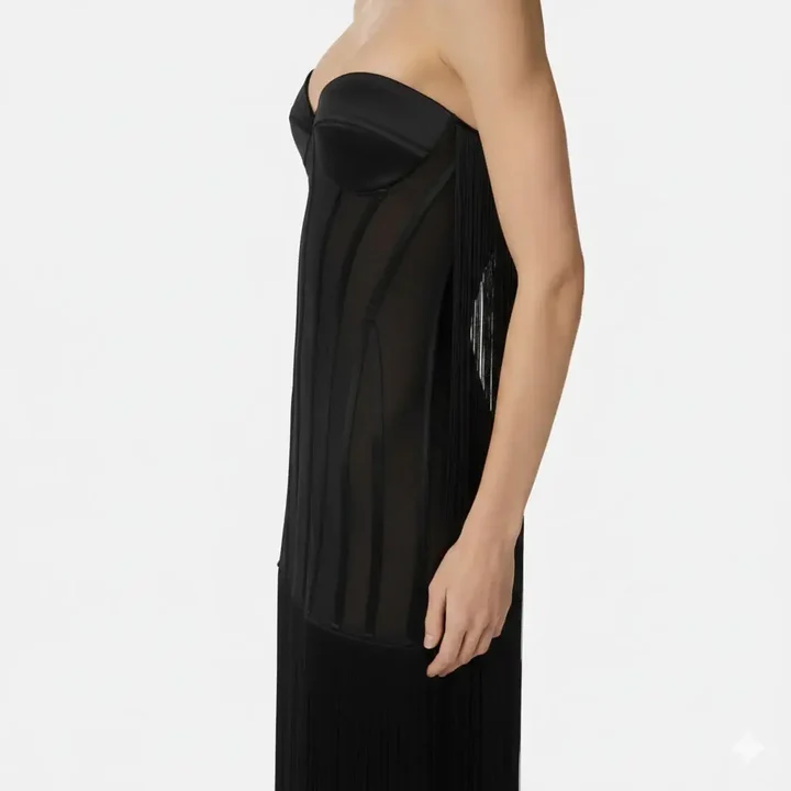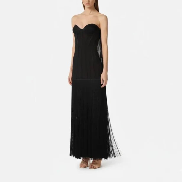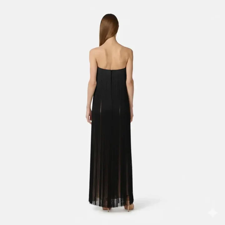 Abito lungo nero da donna dallo stile sensuale e sofisticato, perfetto per occasioni serali ed eventi eleganti. Il bustino strutturato senza spalline valorizza il décolleté grazie alle coppe sagomate e alle impunture verticali che slanciano la figura. La parte inferiore è impreziosita da lunghe frange fluide che donano movimento e un tocco scenografico ad ogni passo. Vestibilità aderente nella parte superiore e più morbida sul fondo, per un effetto femminile e raffinato. Ideale da abbinare a sandali gioiello o décolleté minimal per un look d'impatto.