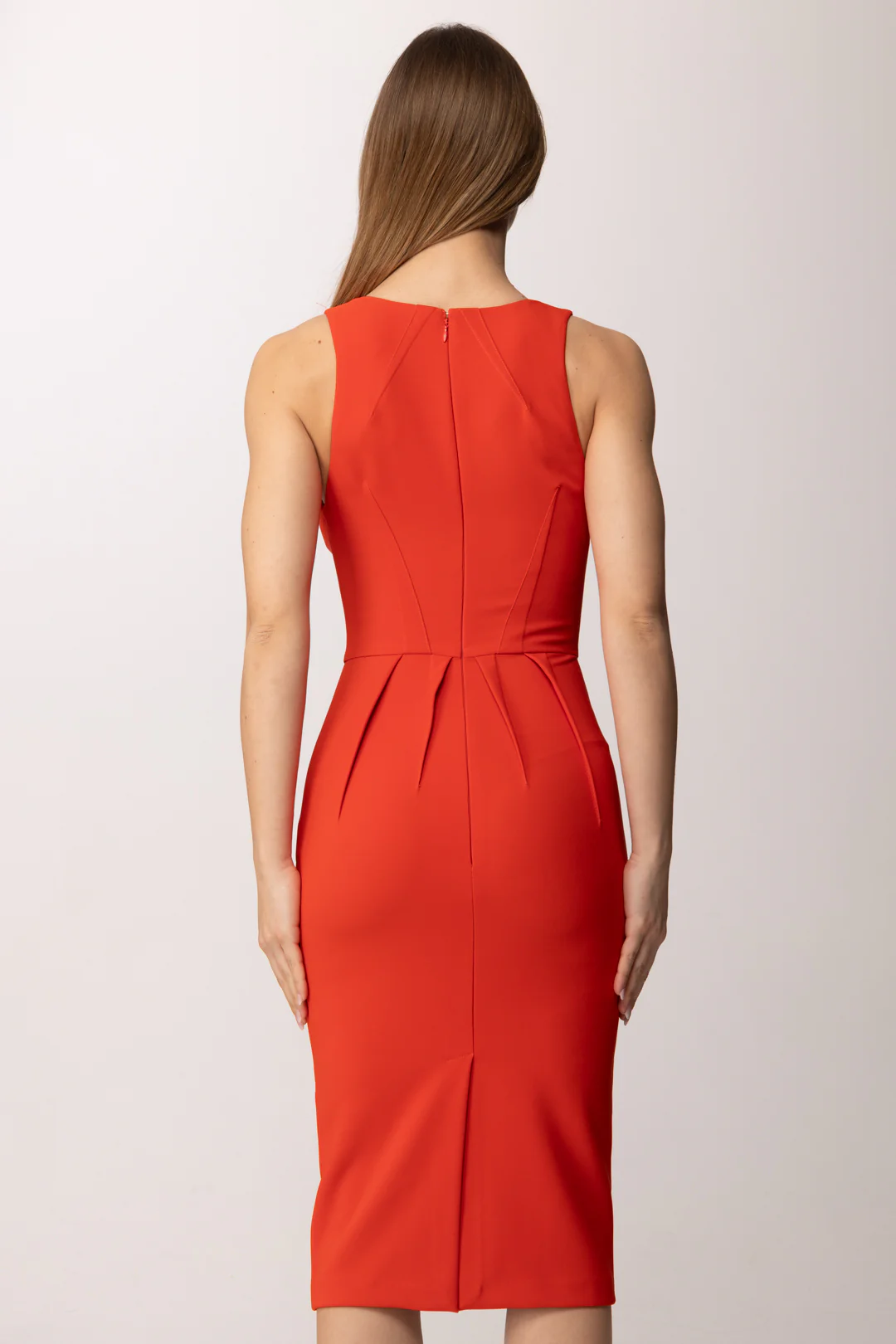 Abito in crêpe leggero. Il vestito è smanicato e ha scollo a V. Si distingue per le pinces cucite e riportate esternamente che creano pieghe ispirate alla costruzione degli origami. A completare, logo ricamato sul fascione. Vestibilità aderente.
