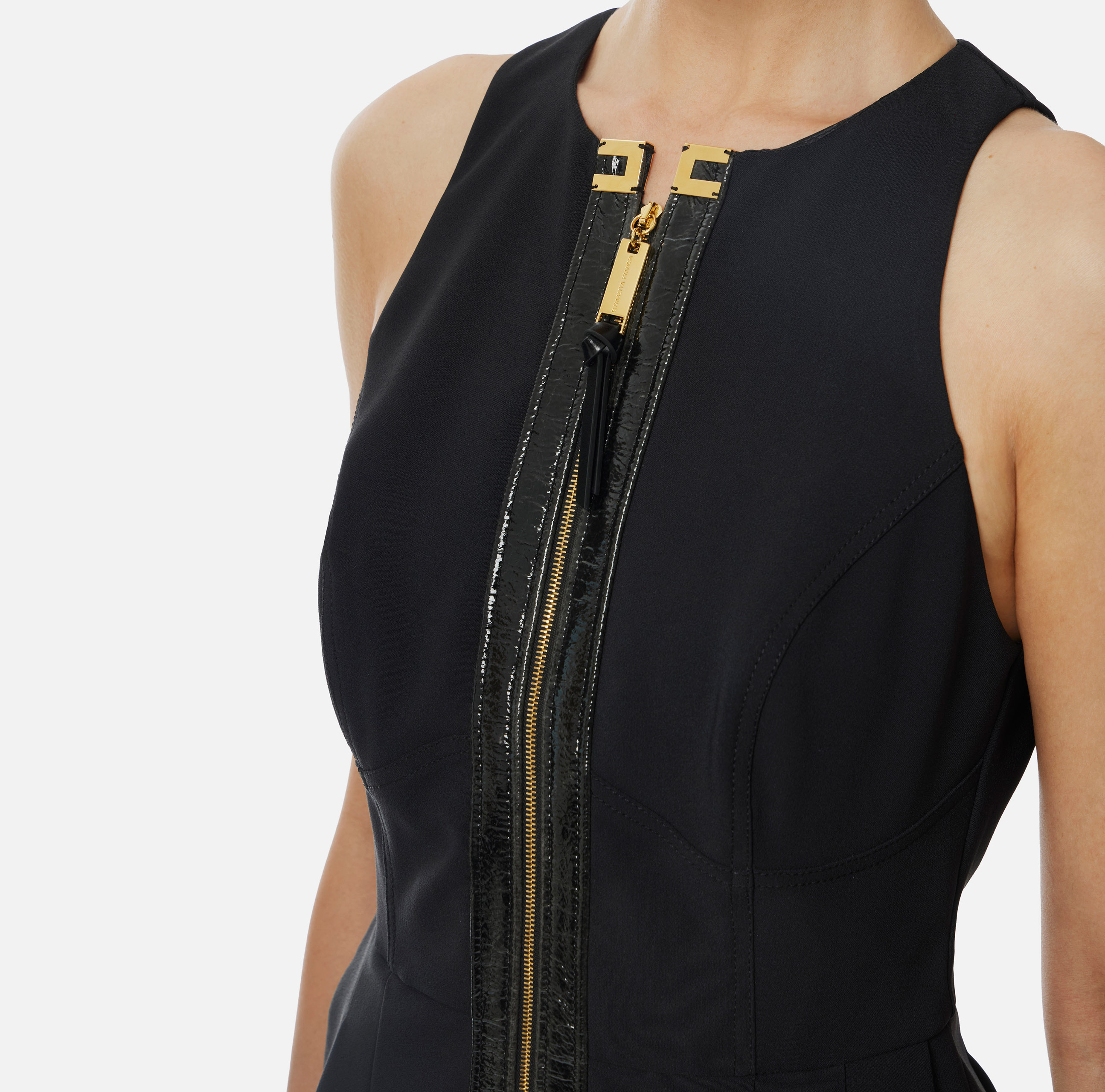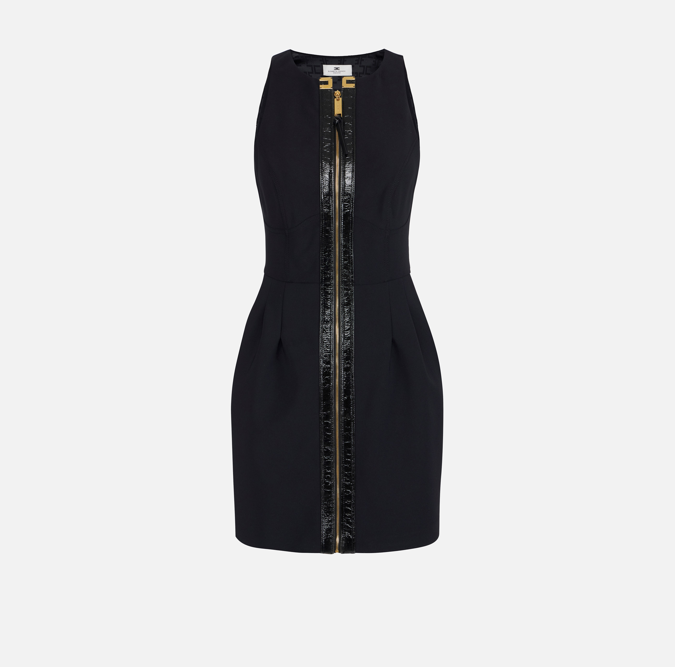 Abito in doppio crêpe stretch dalla vestibilità aderente. Il vestito ha scollo all'americana con cannoncino realizzato in craquelé che incornicia la zip anteriore. Tagli e pinces definiscono una armoniosa linea ad anfora. Note luminose coi dettagli logo in metallo dorato.