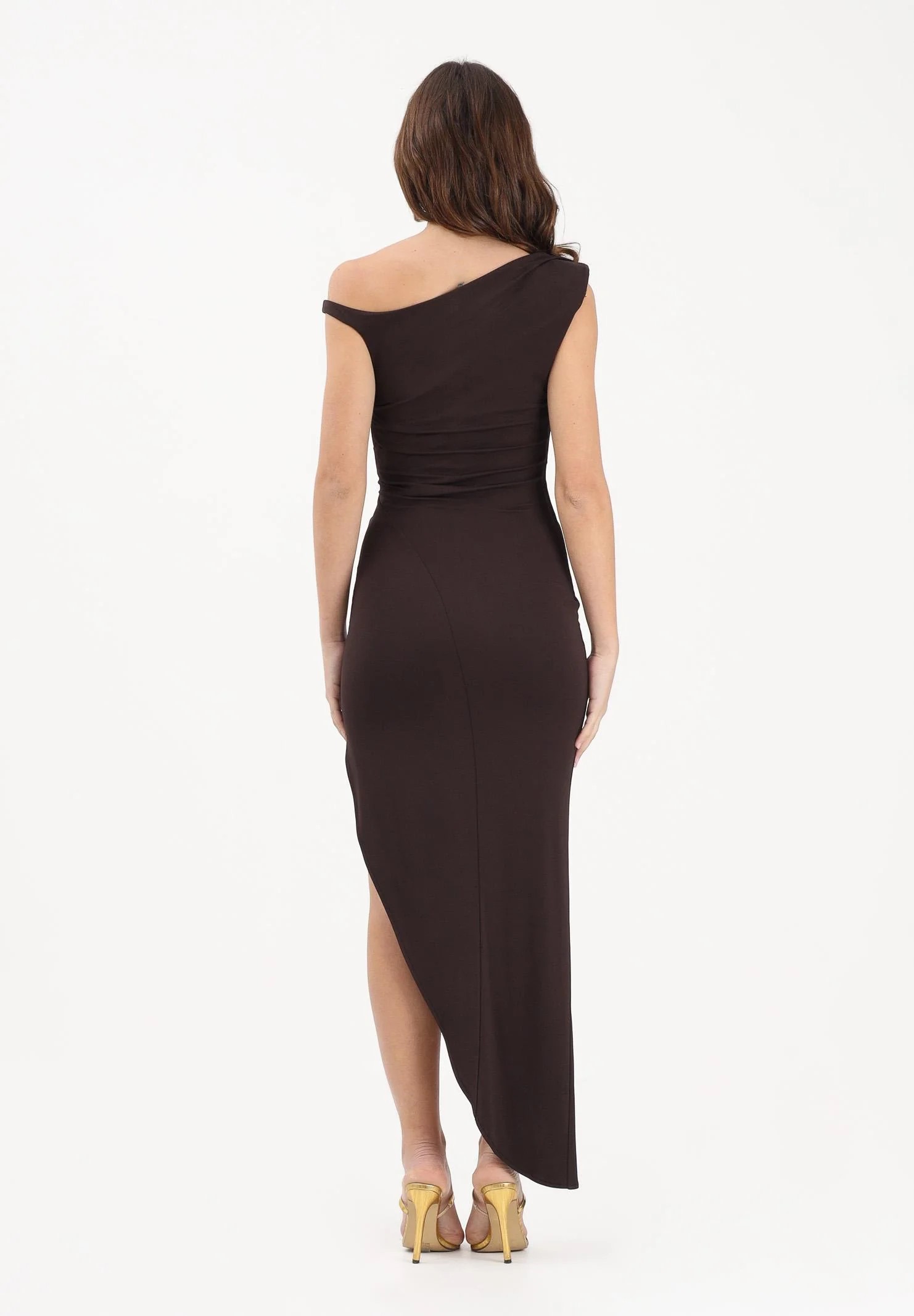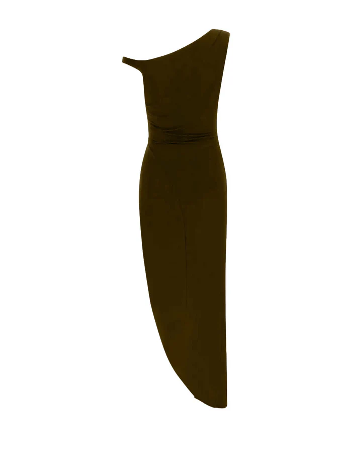 Abito in jersey crêpe dalla vestibilità aderente. Il vestito ha design monospalla, strutturata e chiusa dalla mezzaluna in metallo dorato che aggiunge luce. La gonna ha taglio asimmetrico, esaltato dal profondo spacco laterale per una nota seducente.