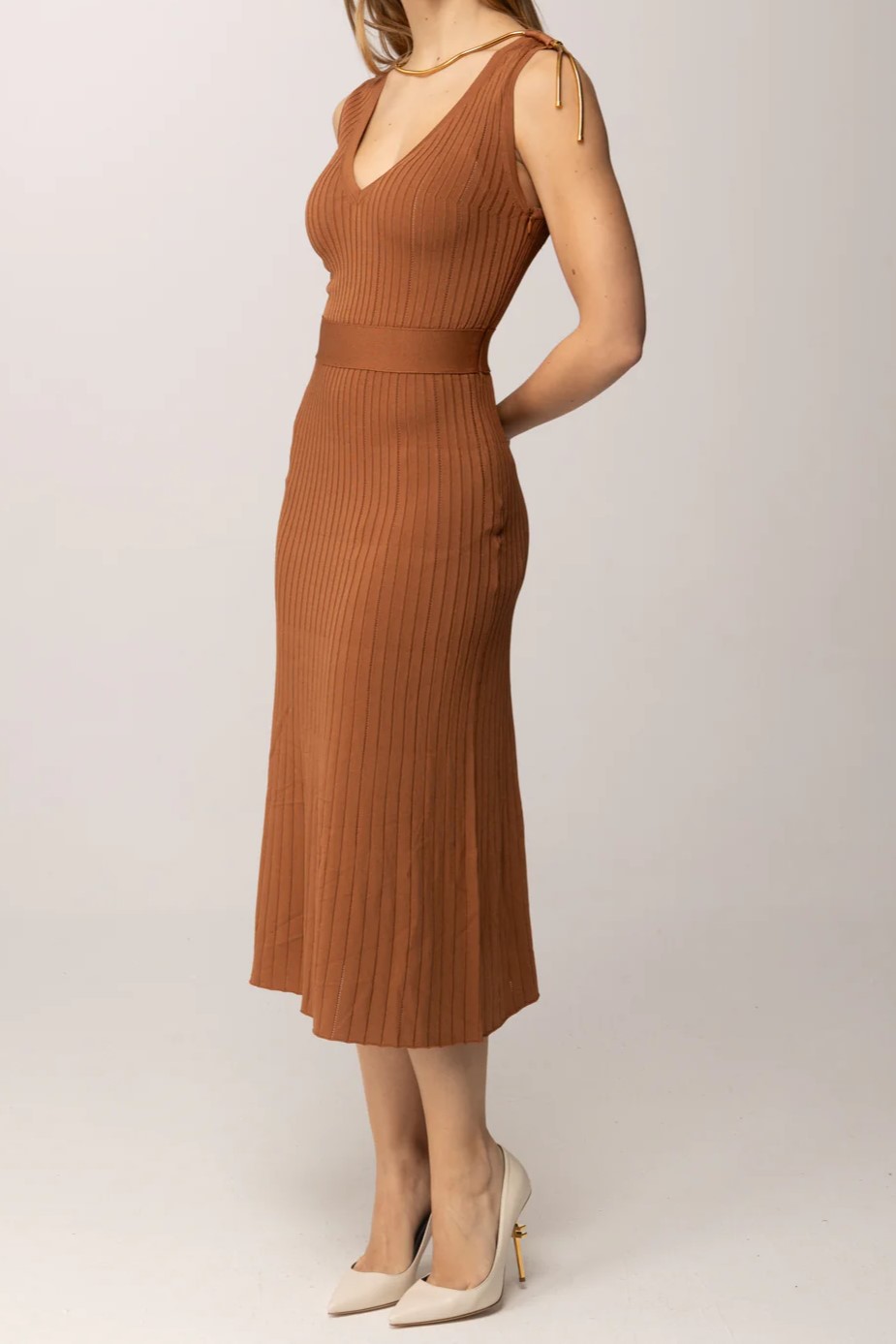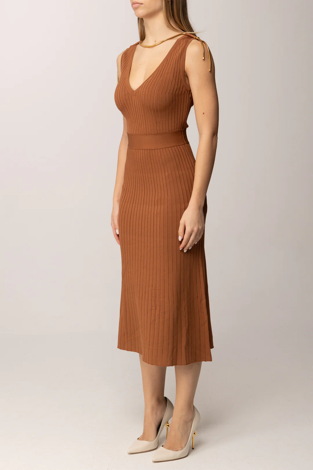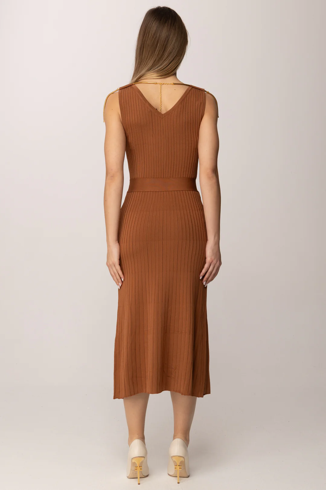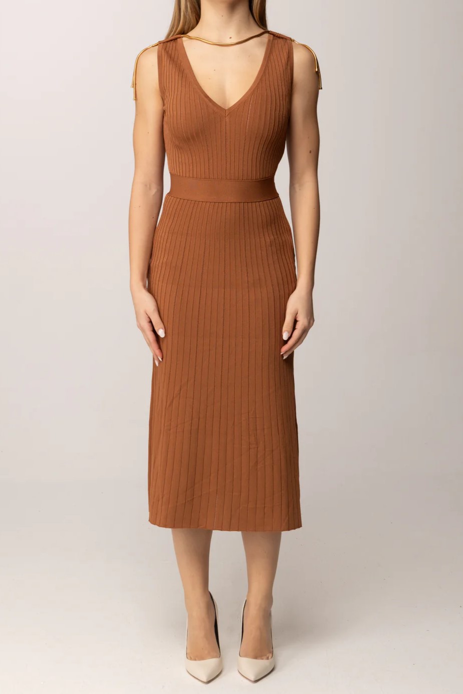 Abito in maglia dalla vestibilità slim. Il vestito è smanicato e si distingue per lo scollo a V trattenuto da una luminosa collana tubolare in metallo dorato, rifinita da logo pendente sul retro. Focus sulle lavorazioni: la trama a costine lisce si alterna a quella con traforatura à jour, creando un equilibrato ritmo visivo.