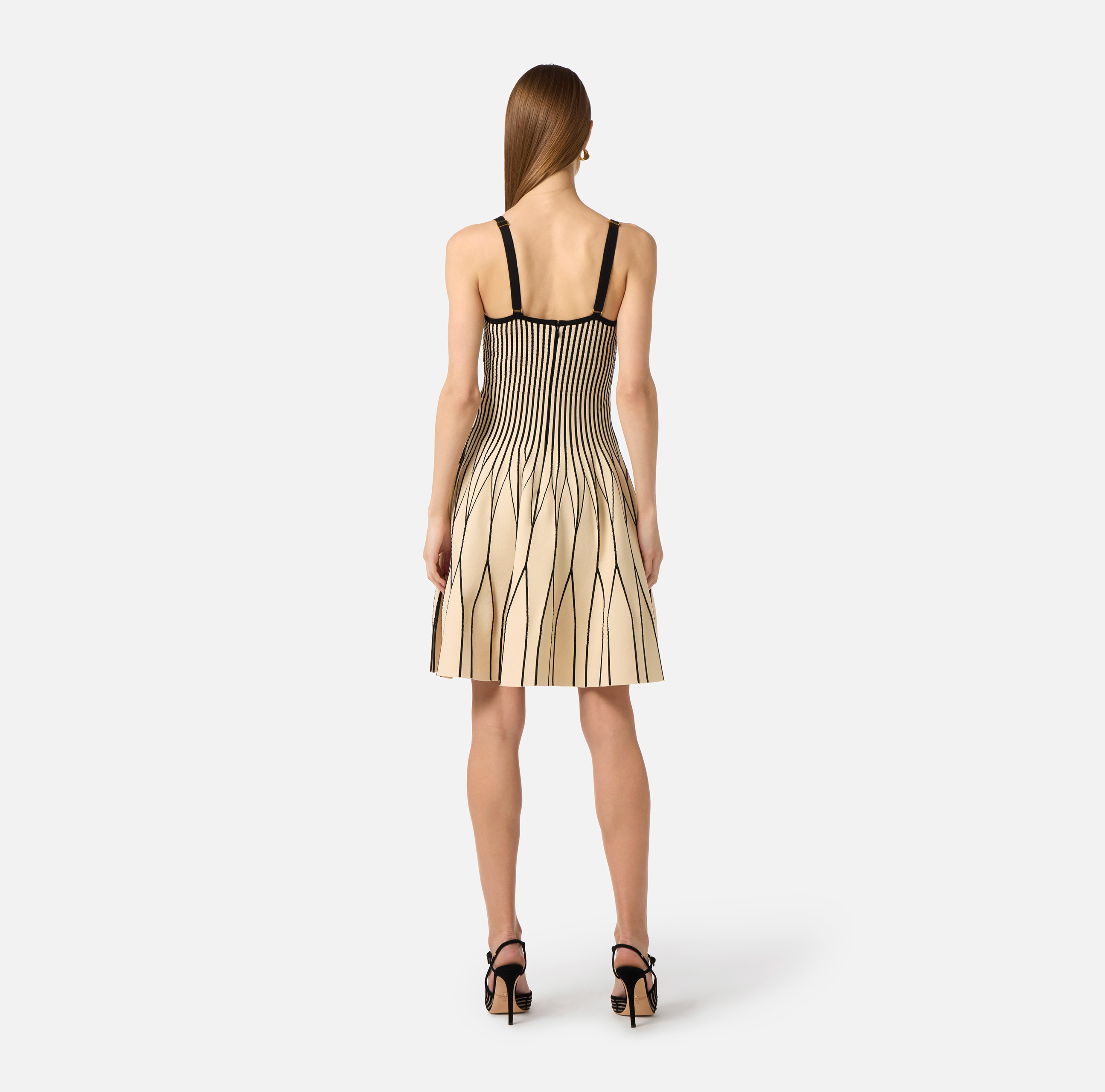 Abito in maglia. Si distingue per la texture in puntostoffa che si apre in un movimento plissé sulla gonna. Le punzonature e la trama bicolore esaltano i disegni geometrici del capo, per un deciso e armonioso contrasto grafico. Le spalline sono impreziosite da dettagli smaltati con logo. Vestibilità aderente.