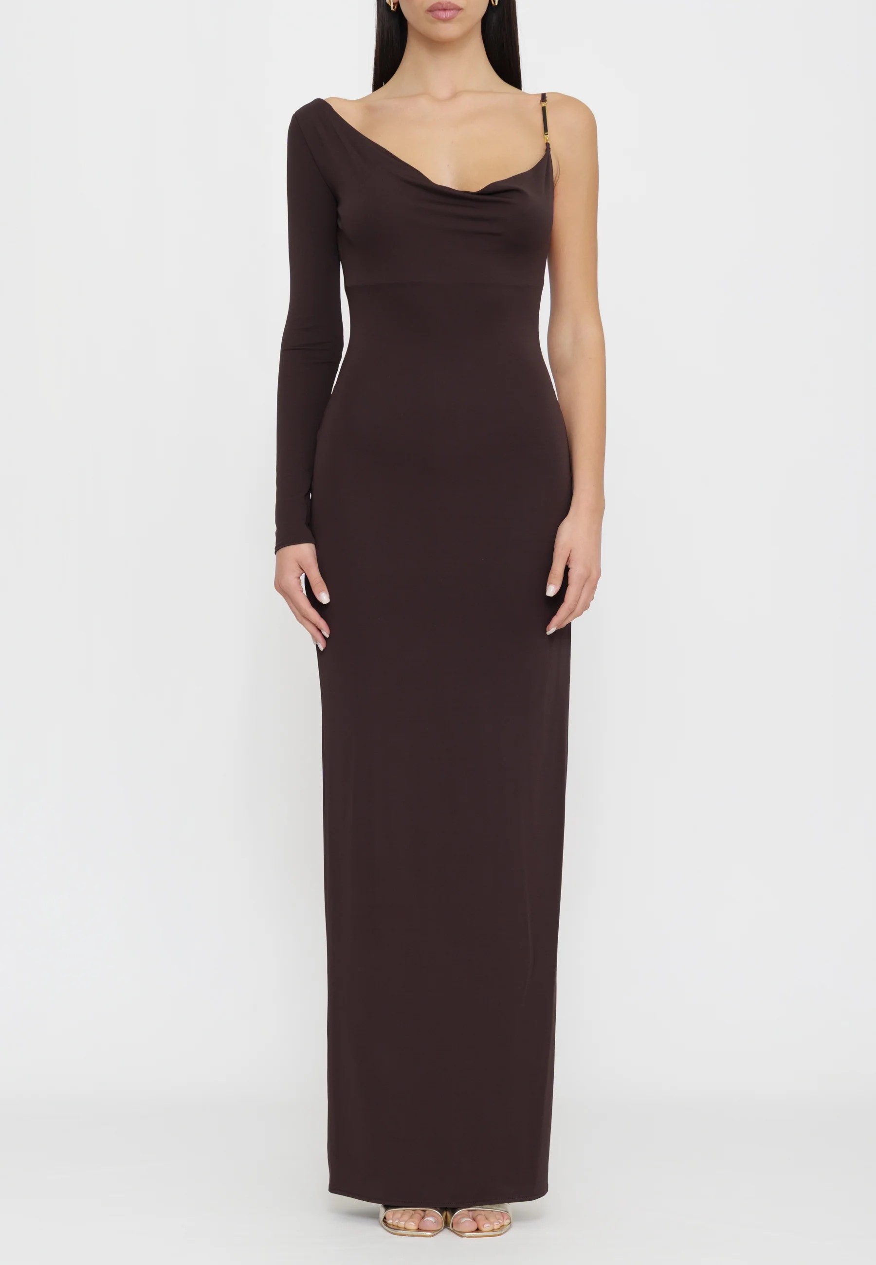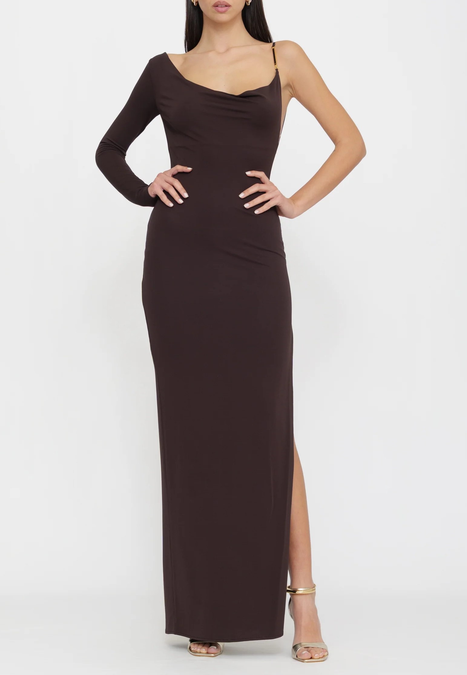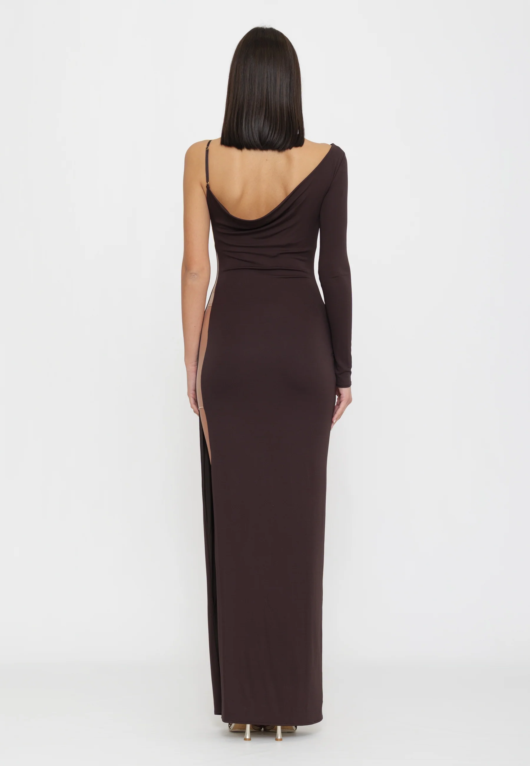 Abito da sera in jersey crêpe dalla vestibilità aderente. Il vestito si distingue per il suo design inedito, con manica lunga su un lato e spallina decorata con morsetto gioiello sull'altro. Il taglio laterale si apre in un profondo spacco sulla gonna e lascia intravvedere un body in tulle.