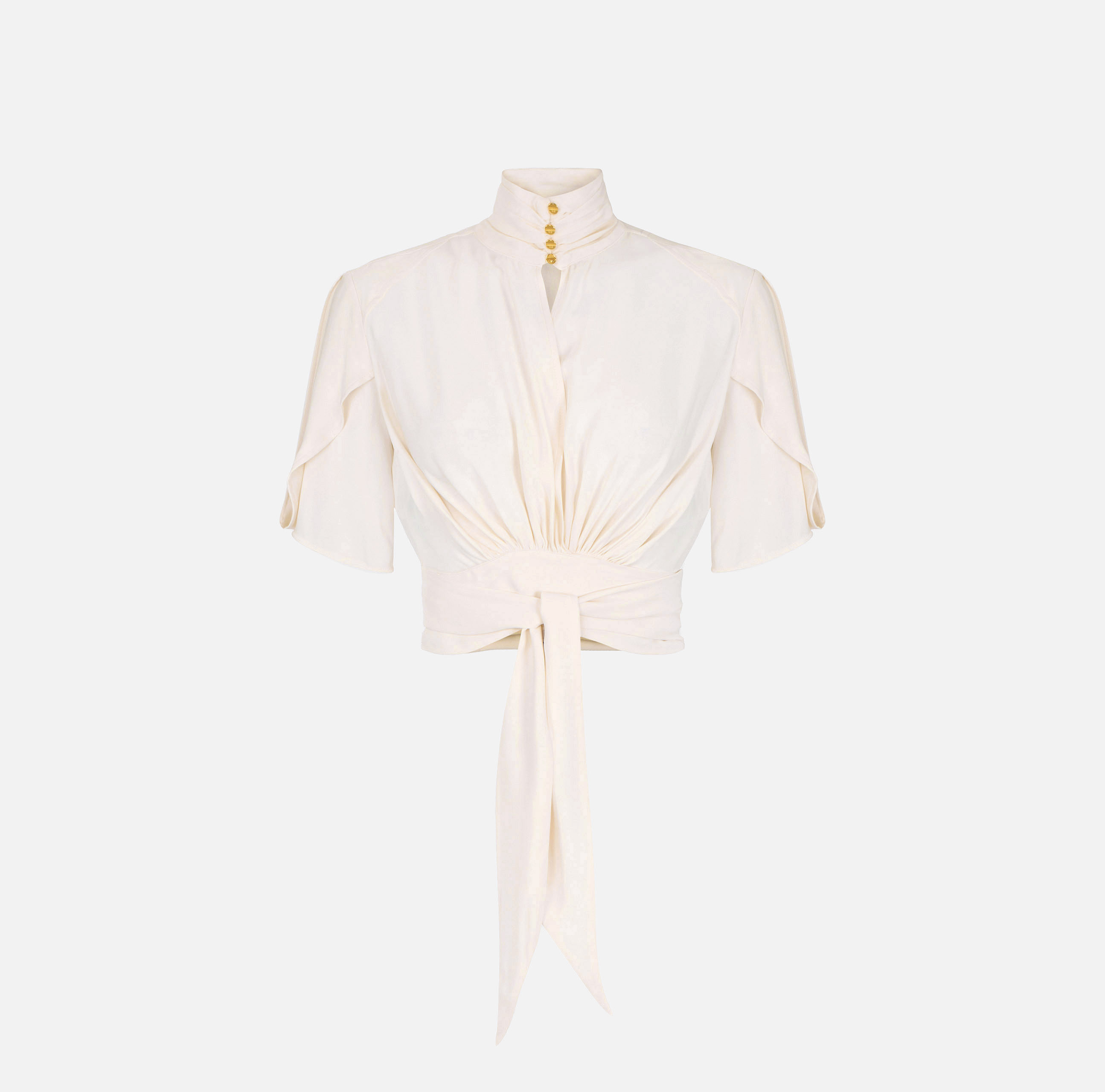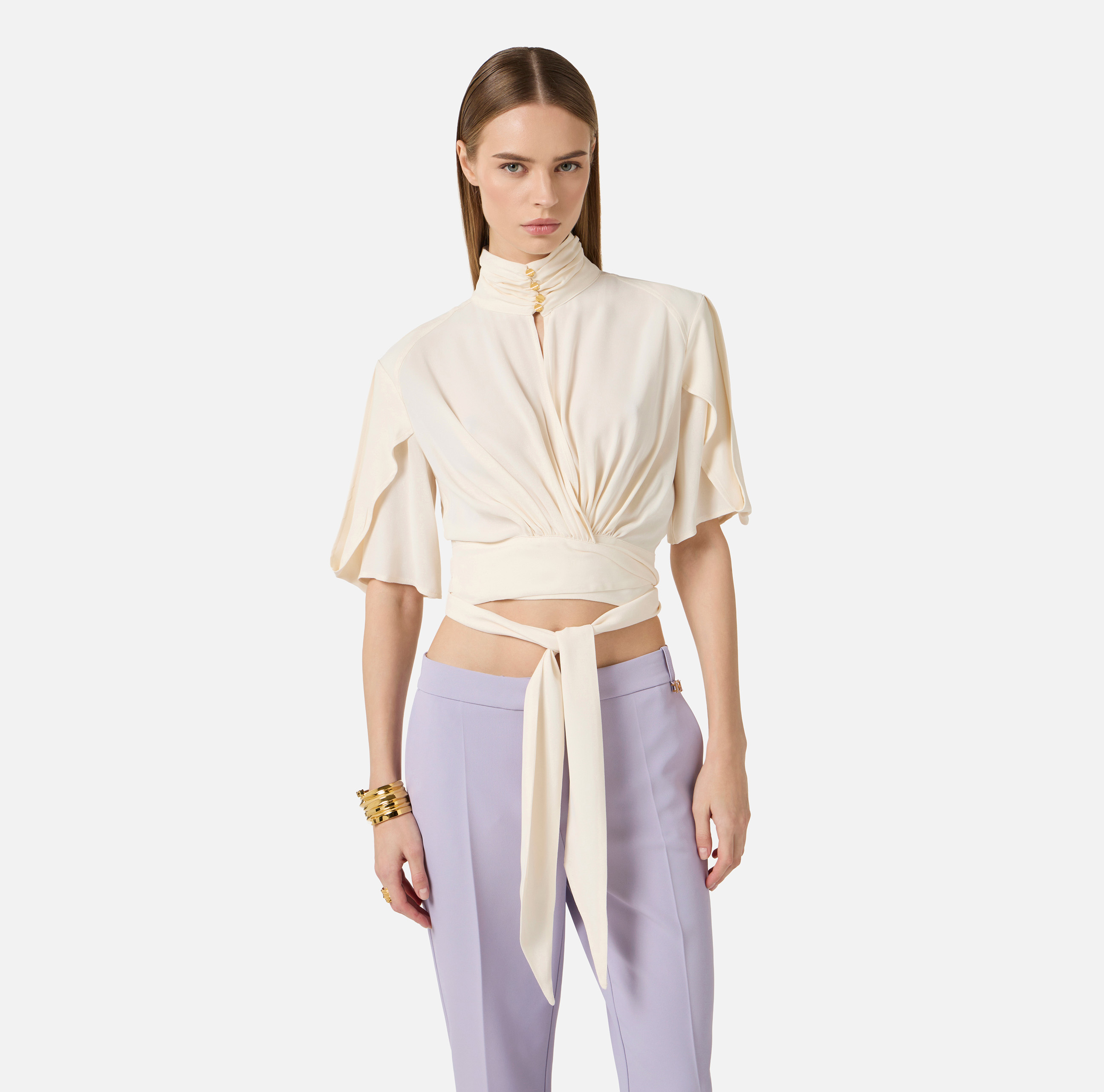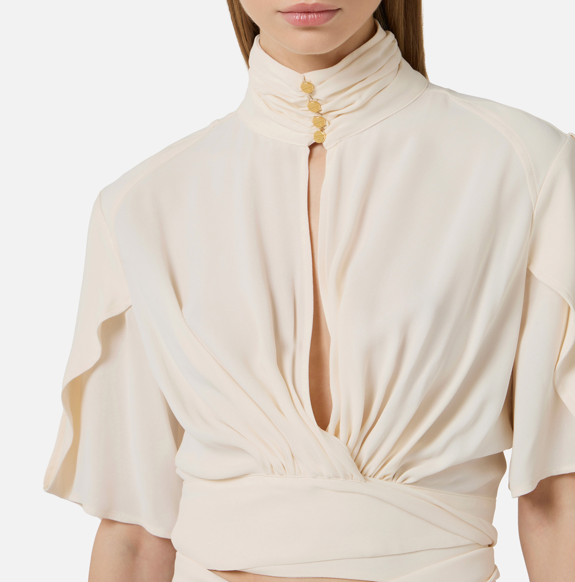 Blusa in georgette di viscosa. Si distingue per i volumi fluidi, esaltati dalle maniche corte con volant sulle spalle e dal drappeggio centrale con fusciacca sul davanti. Il collo alto è illuminato da bottoncini in metallo dorato, per una nota preziosa. Vestibilità regular.