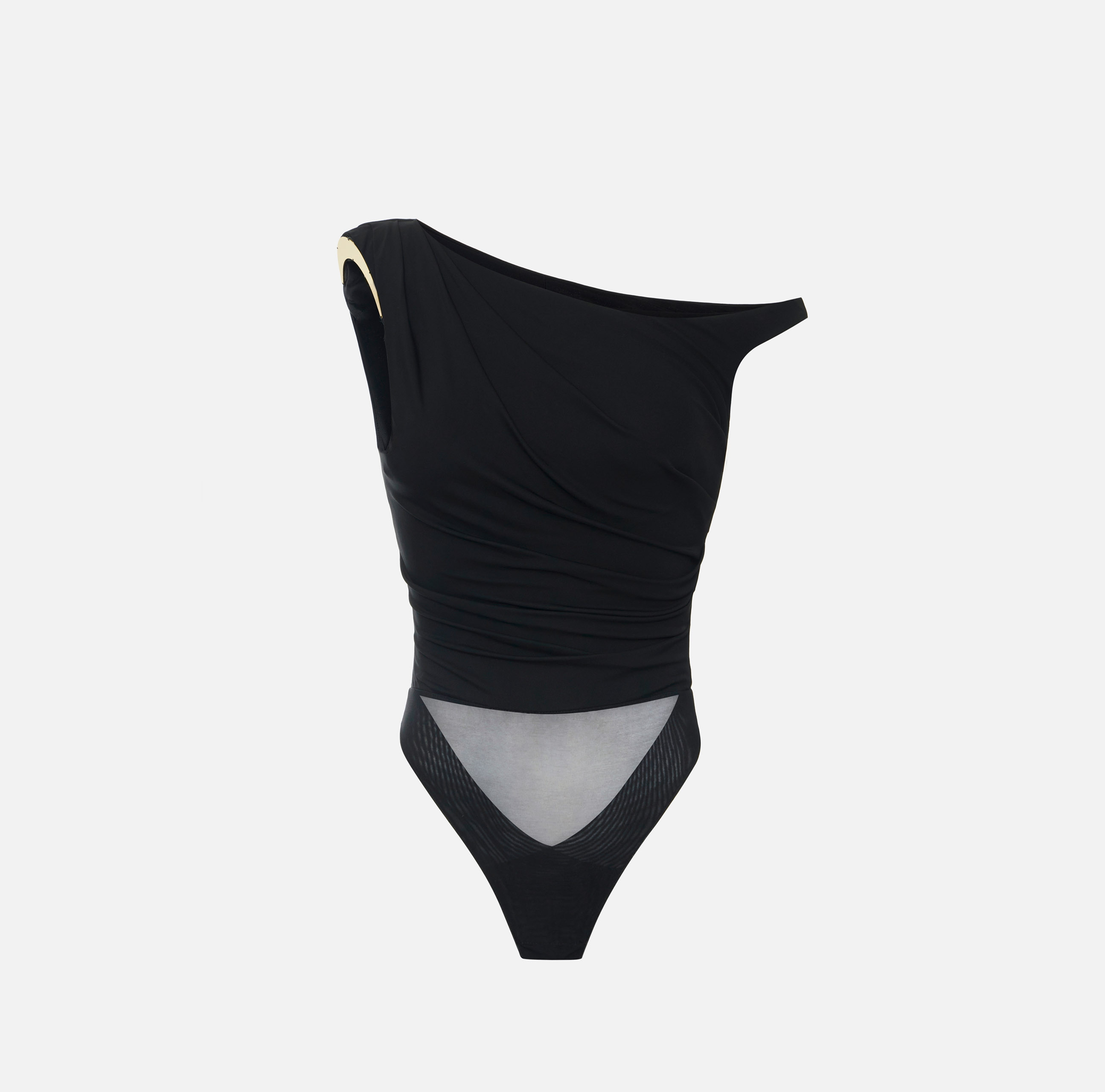 Body in jersey dalla vestibilità aderente. Focus sul design monospalla, strutturata e chiusa dalla mezzaluna in metallo dorato per una nota luminosa. I drappeggi creano volume e definizione.