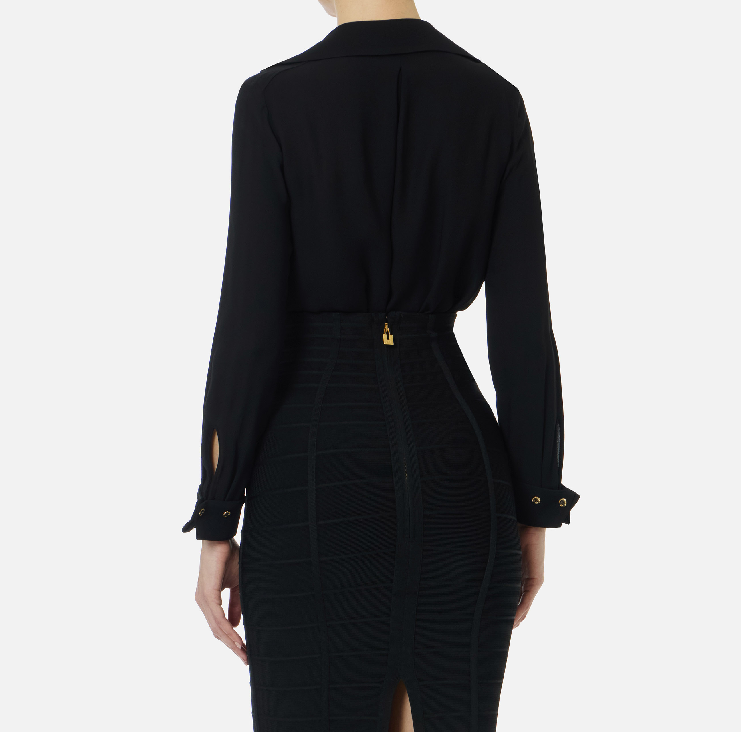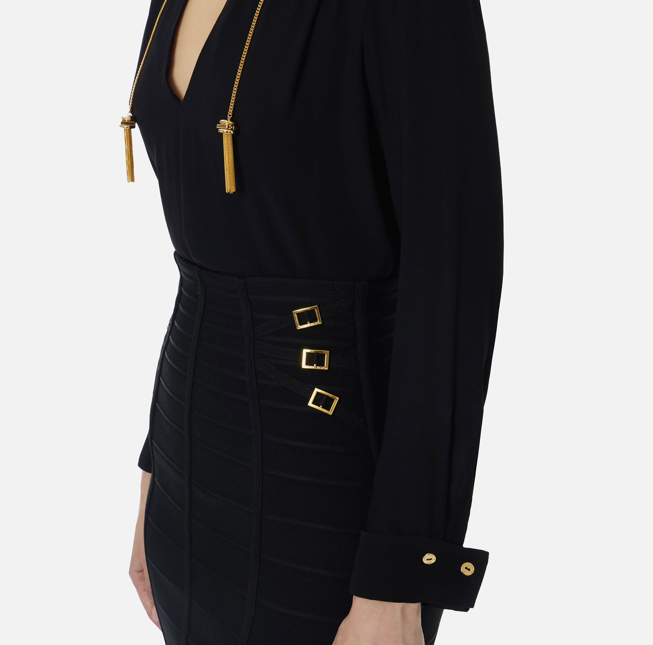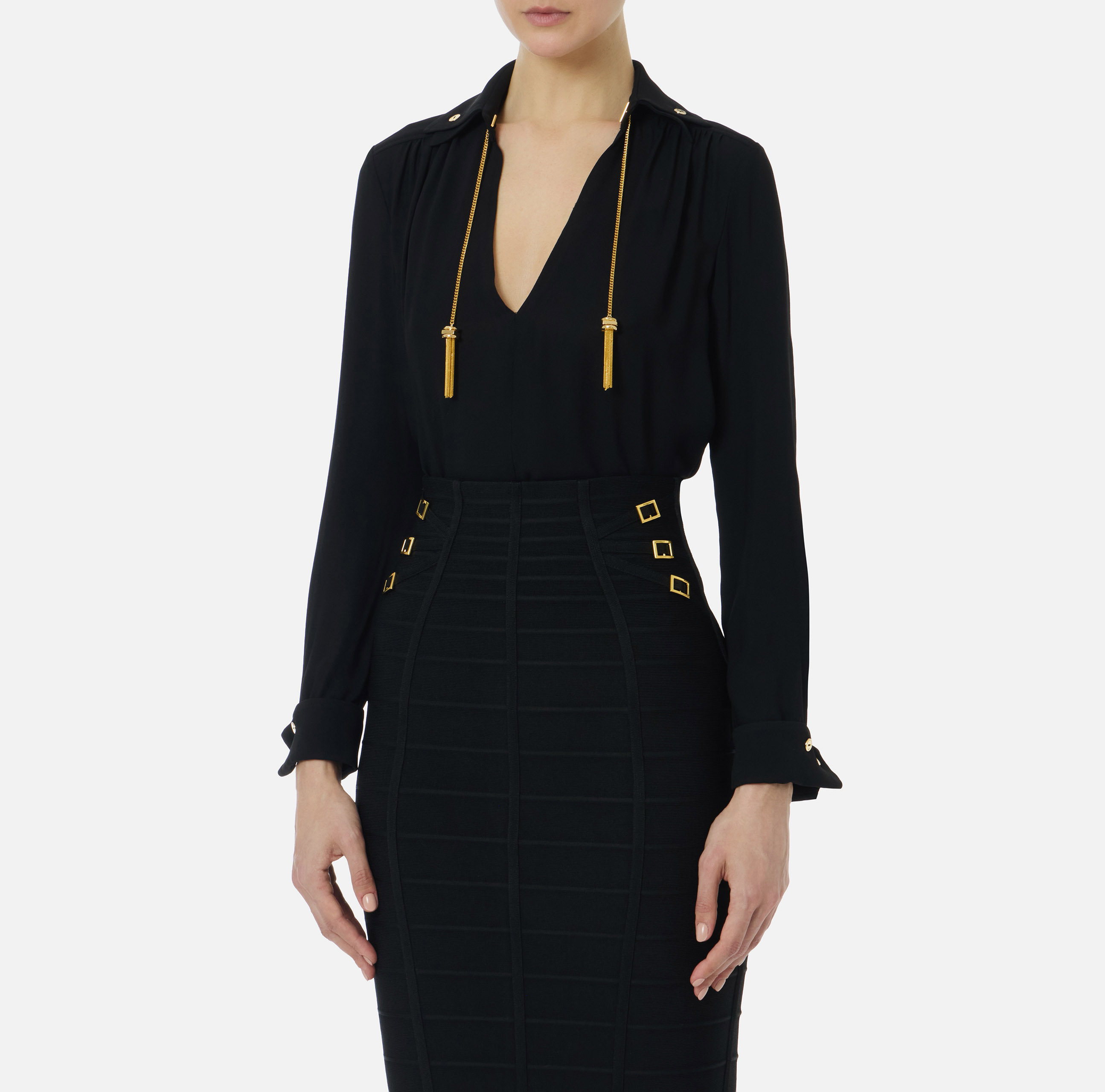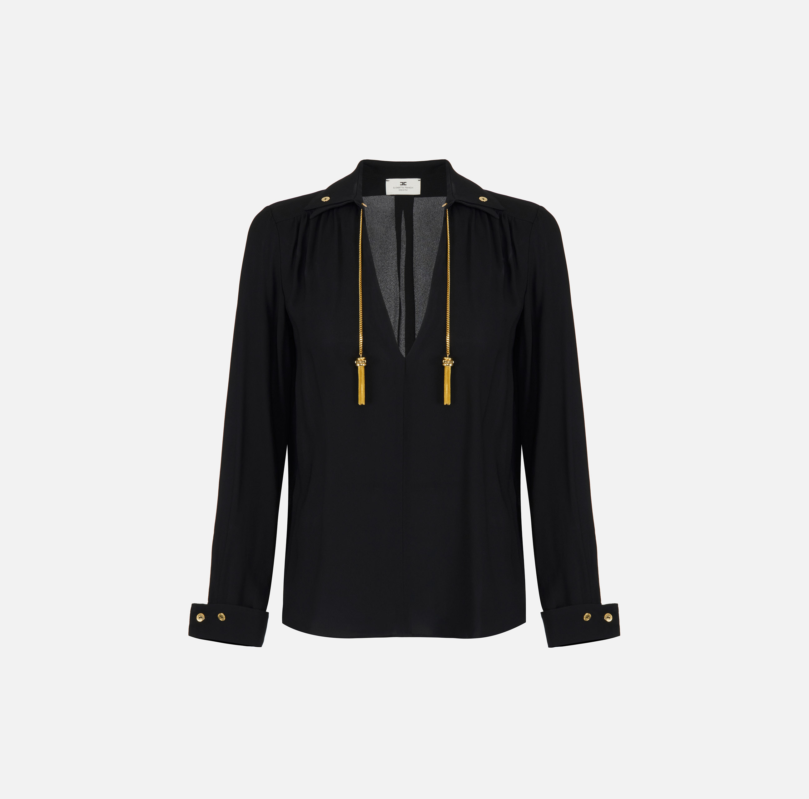 Camicia in georgette. Si distingue per il doppio colletto, arricchito dall'aggiunta di nappine gioiello per un gioco di luce e movimento. Le maniche sono impreziosite da bottoni in metallo dorato ispirati ai classici gemelli. Vestibilità regular.