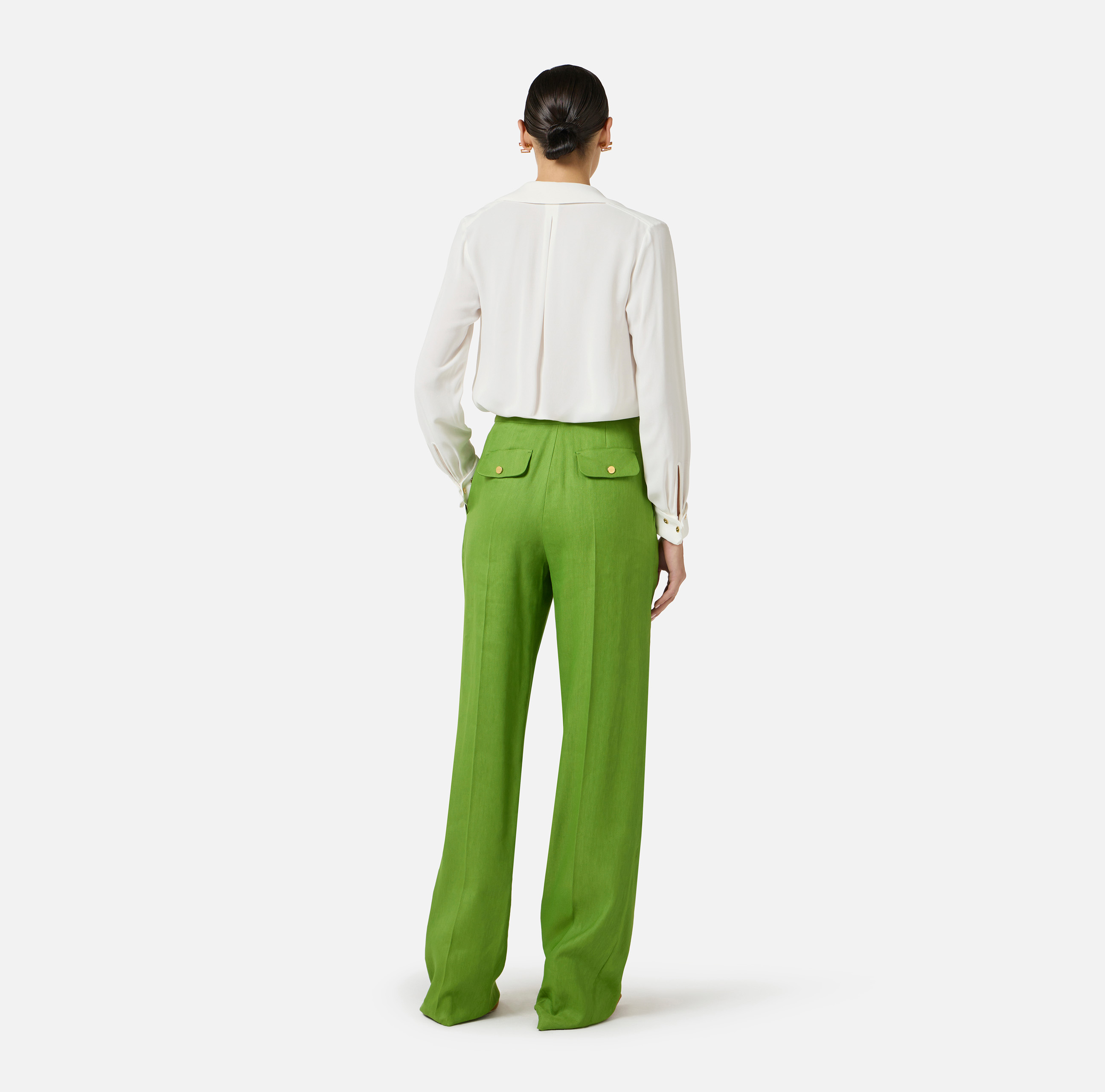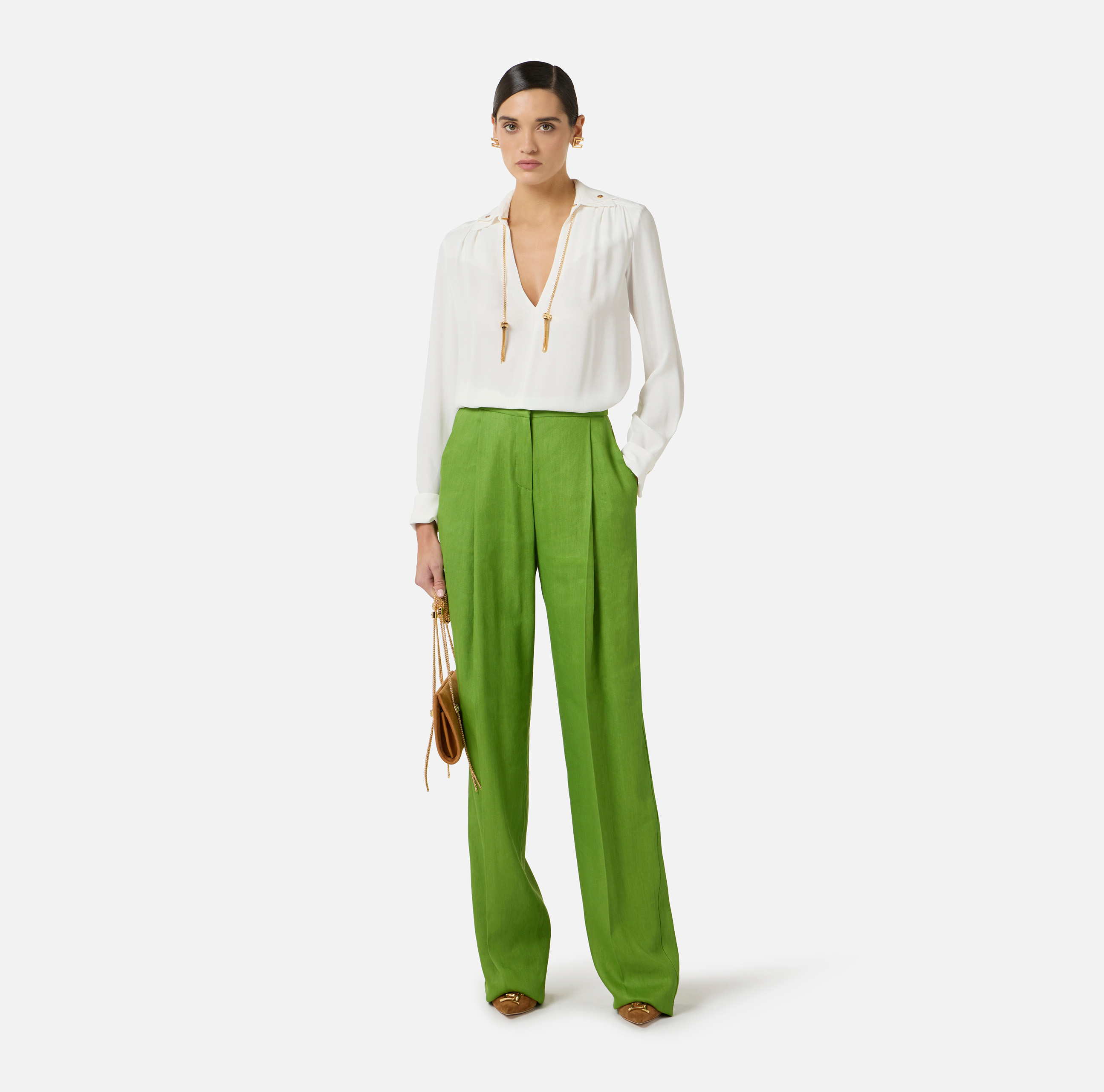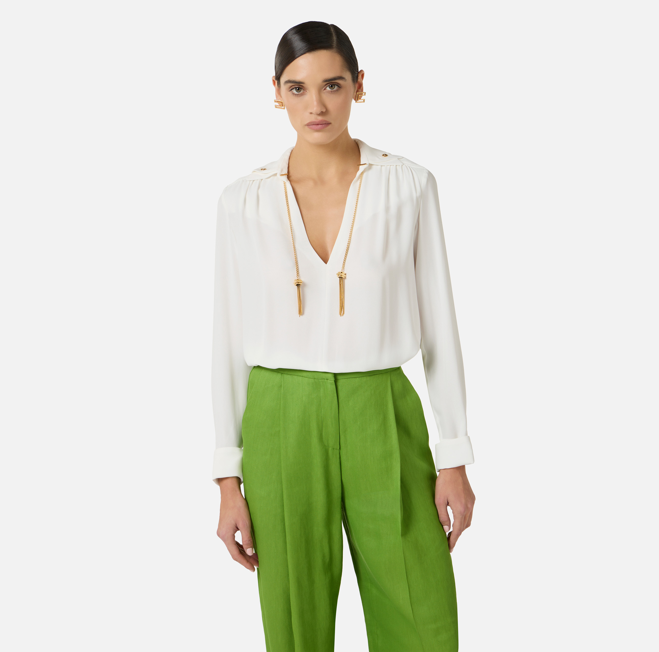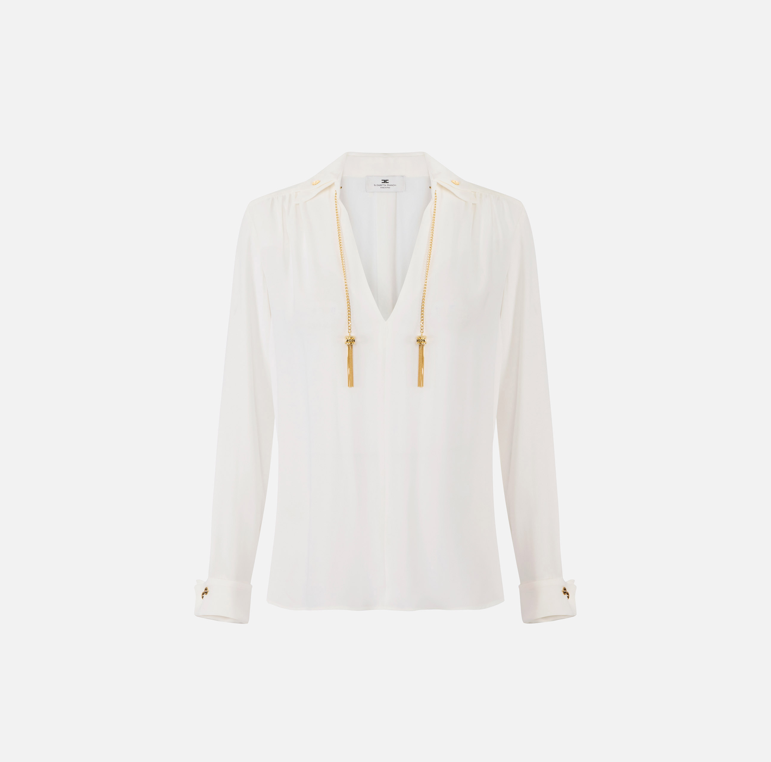 Camicia in georgette. Si distingue per il doppio colletto, arricchito dall'aggiunta di nappine gioiello per un gioco di luce e movimento. Le maniche sono impreziosite da bottoni in metallo dorato ispirati ai classici gemelli. Vestibilità regular.