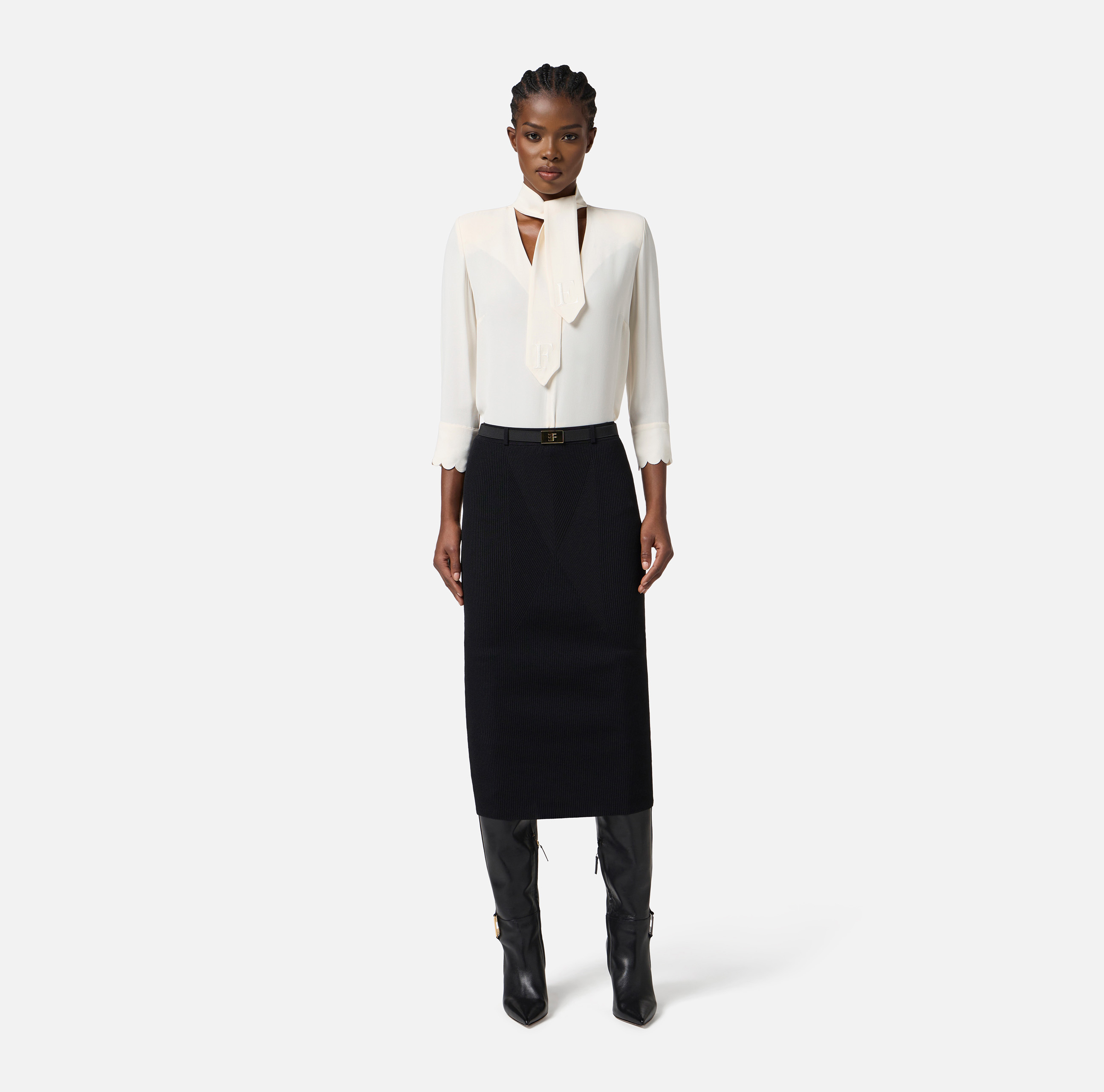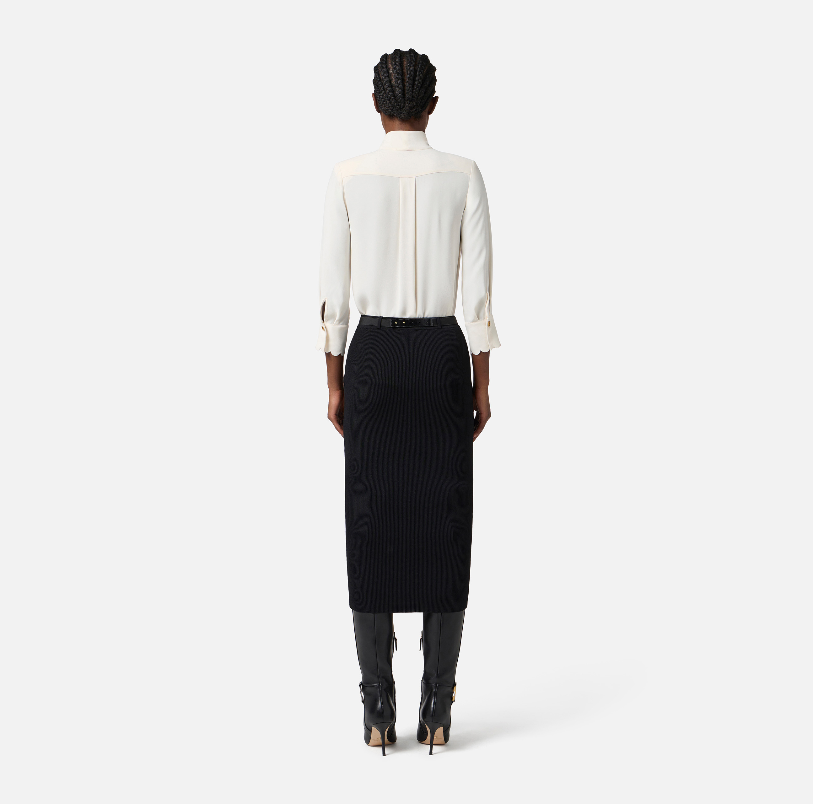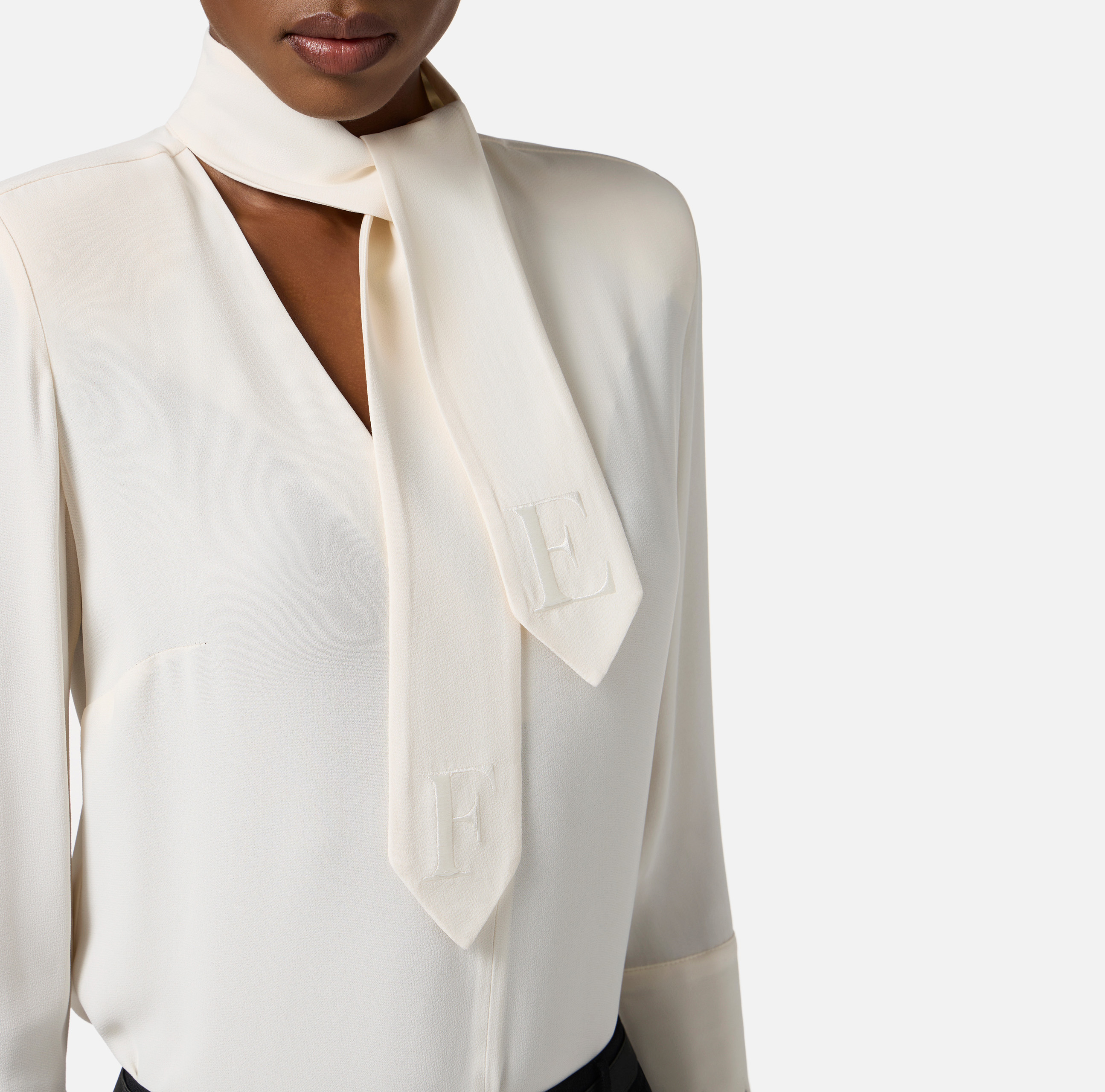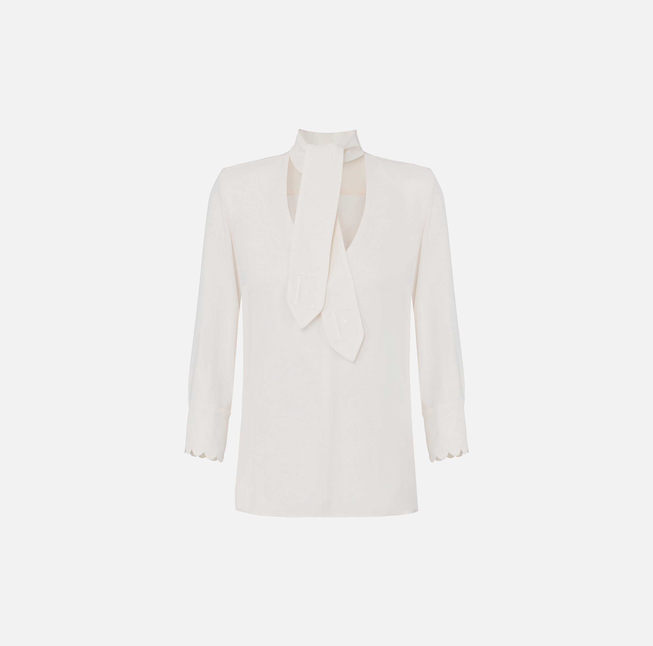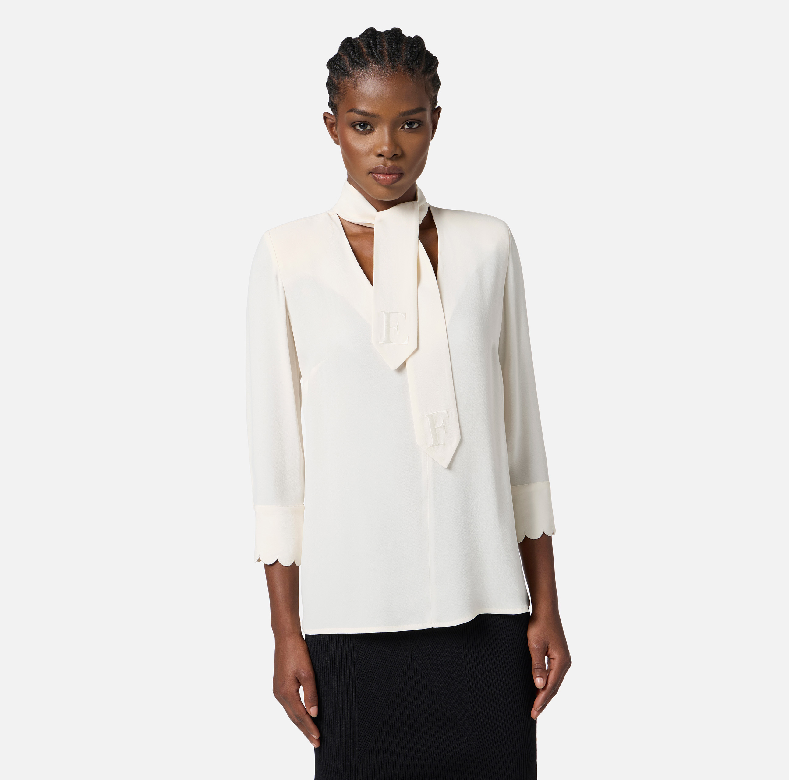 Camicia in georgette dalla vestibilità regular. Si distingue per lo scollo con fusciacca in tono e ricamata con logo alle estremità. I polsi con smerlo aggiungono una nota delicata. Bottoni in metallo dorato con logo.