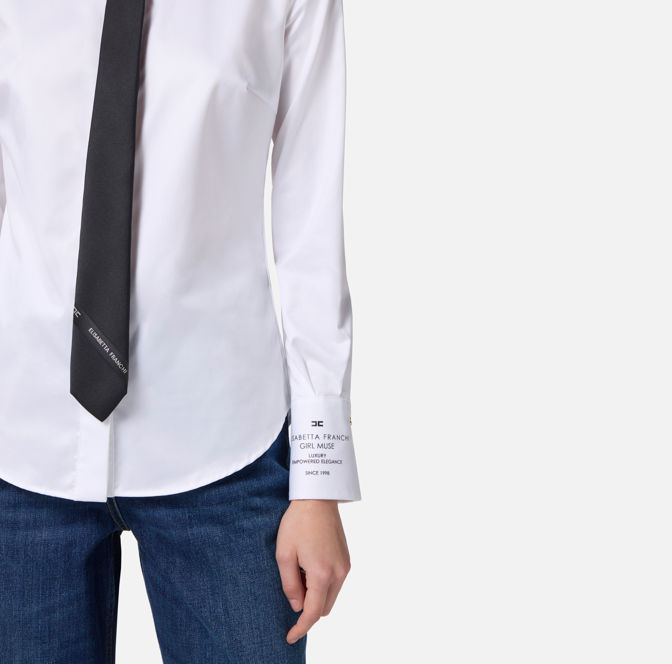 Camicia in popeline di cotone dalla vestibilità aderente. Il capo ha colletto classico impreziosito dal bottone a vista in metallo dorato. Le maniche hanno polsini alti, di cui uno personalizzato dalla stampa di collezione in colore a contrasto.