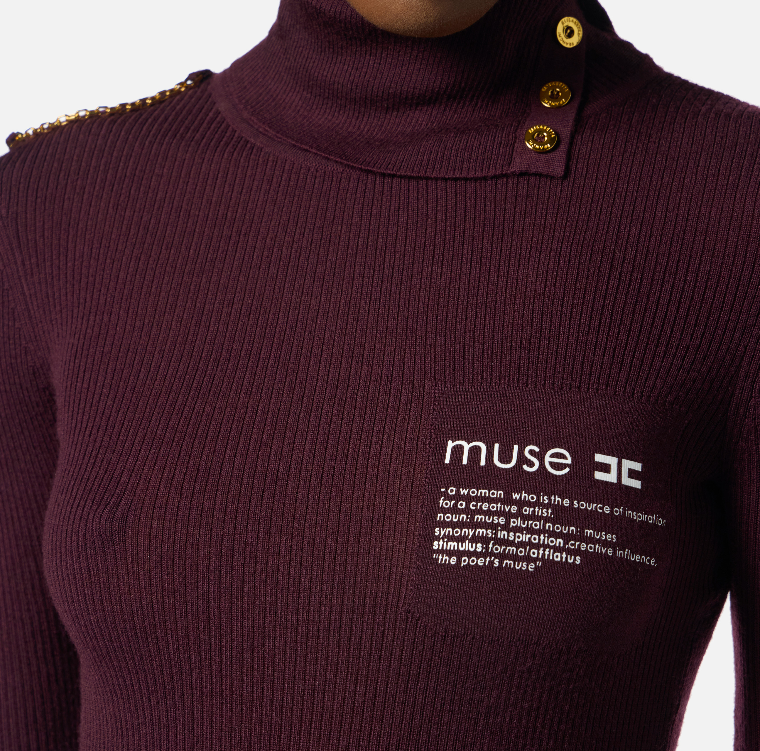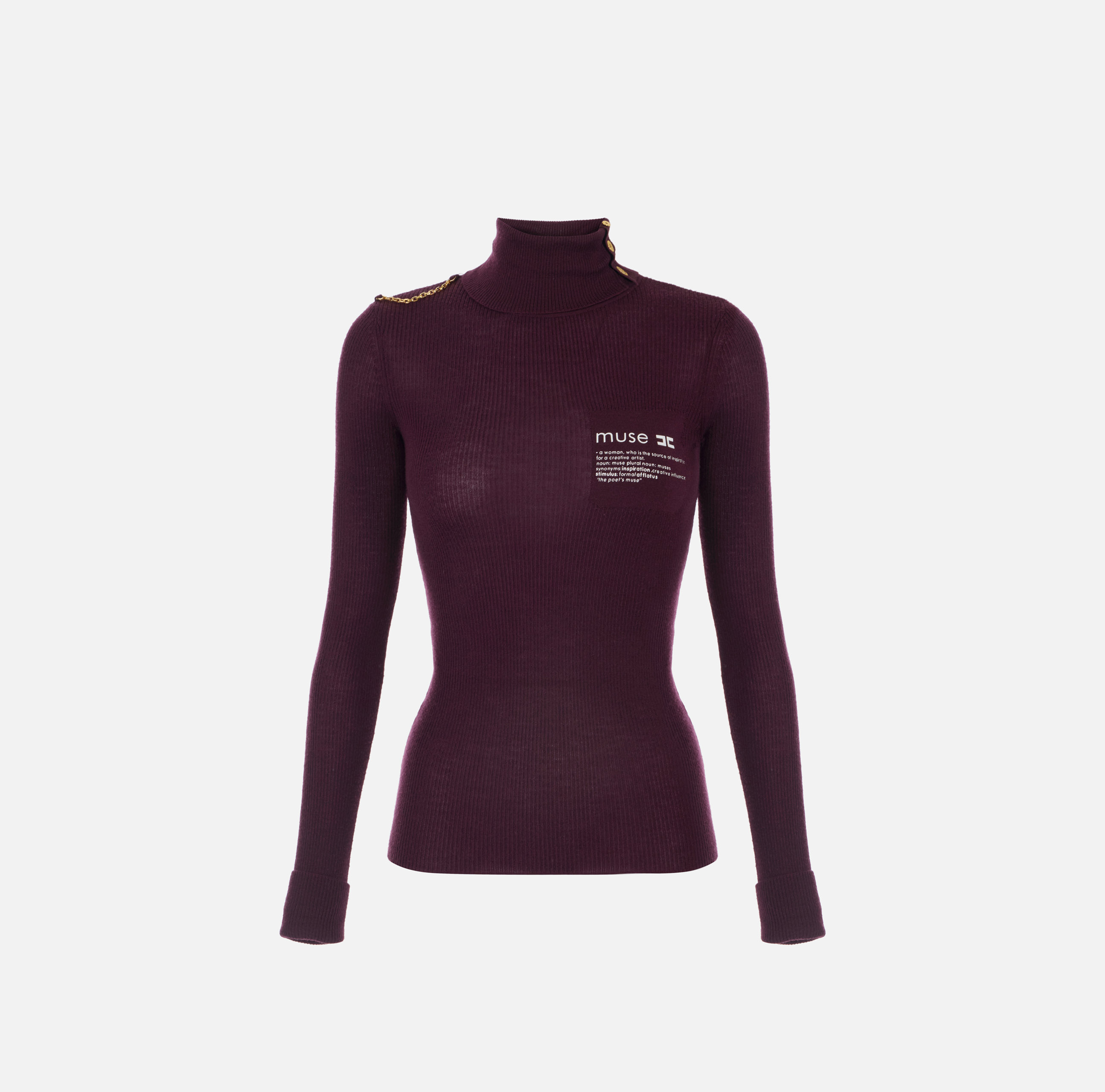 Dolcevita in maglia dalla vestibilità aderente. Ideale come sottogiacca, ha collo dolcevita con apertura laterale e bottoni in metallo dorato, maniche lunghe con risvolto al fondo. Impreziosita dalla stampa con lettering ispirazionale sul davanti e dal luminoso dettaglio in catena su una spalla.