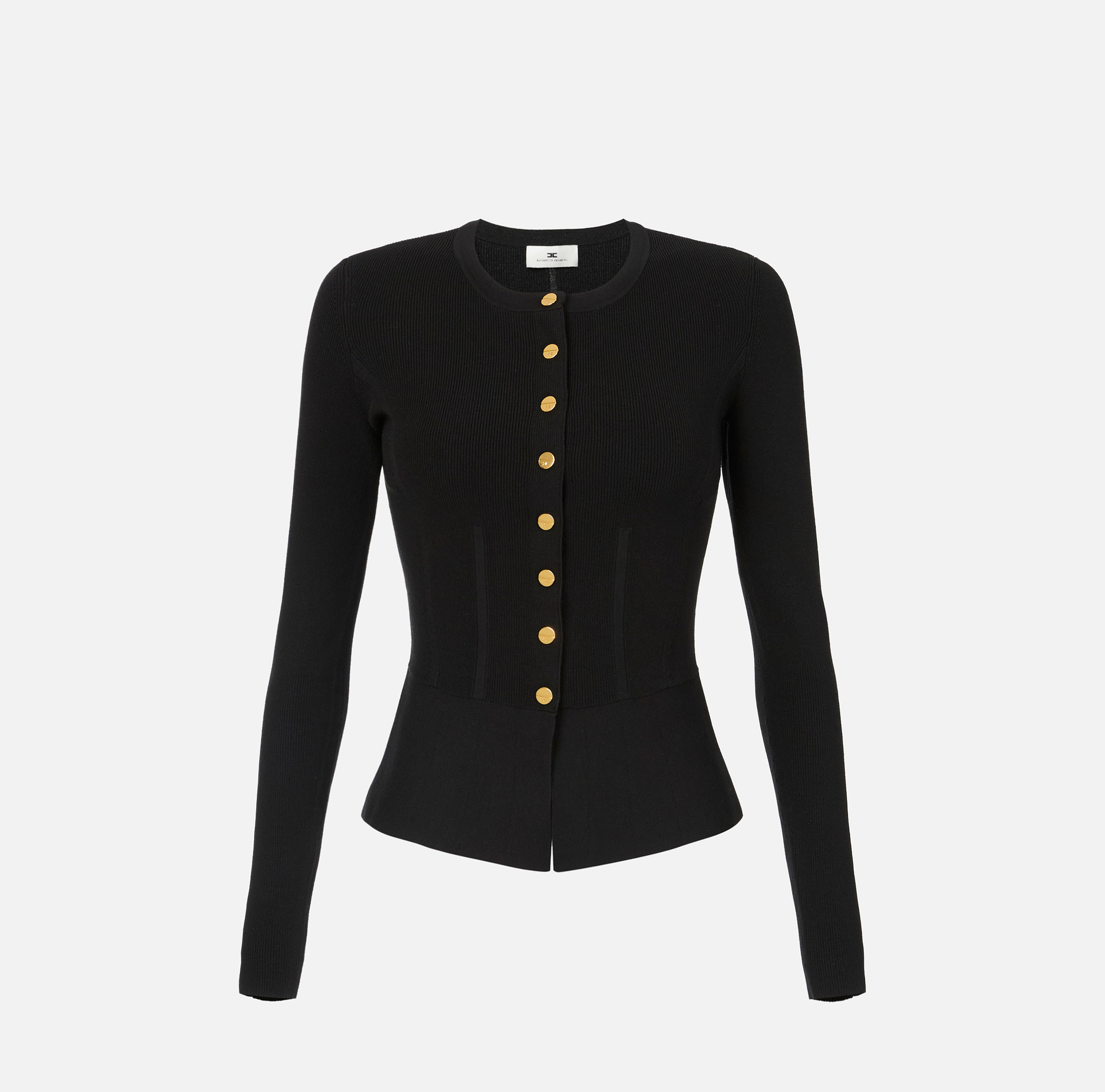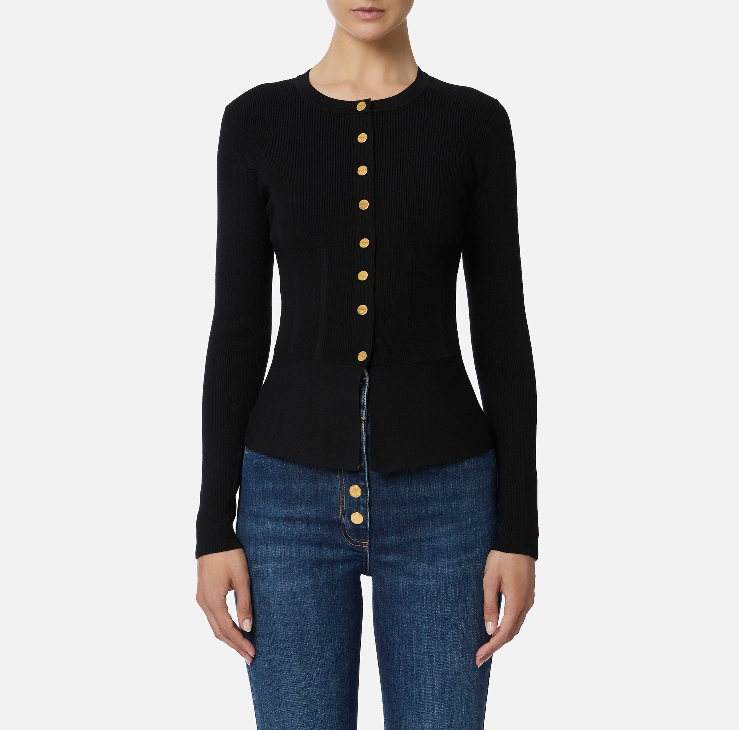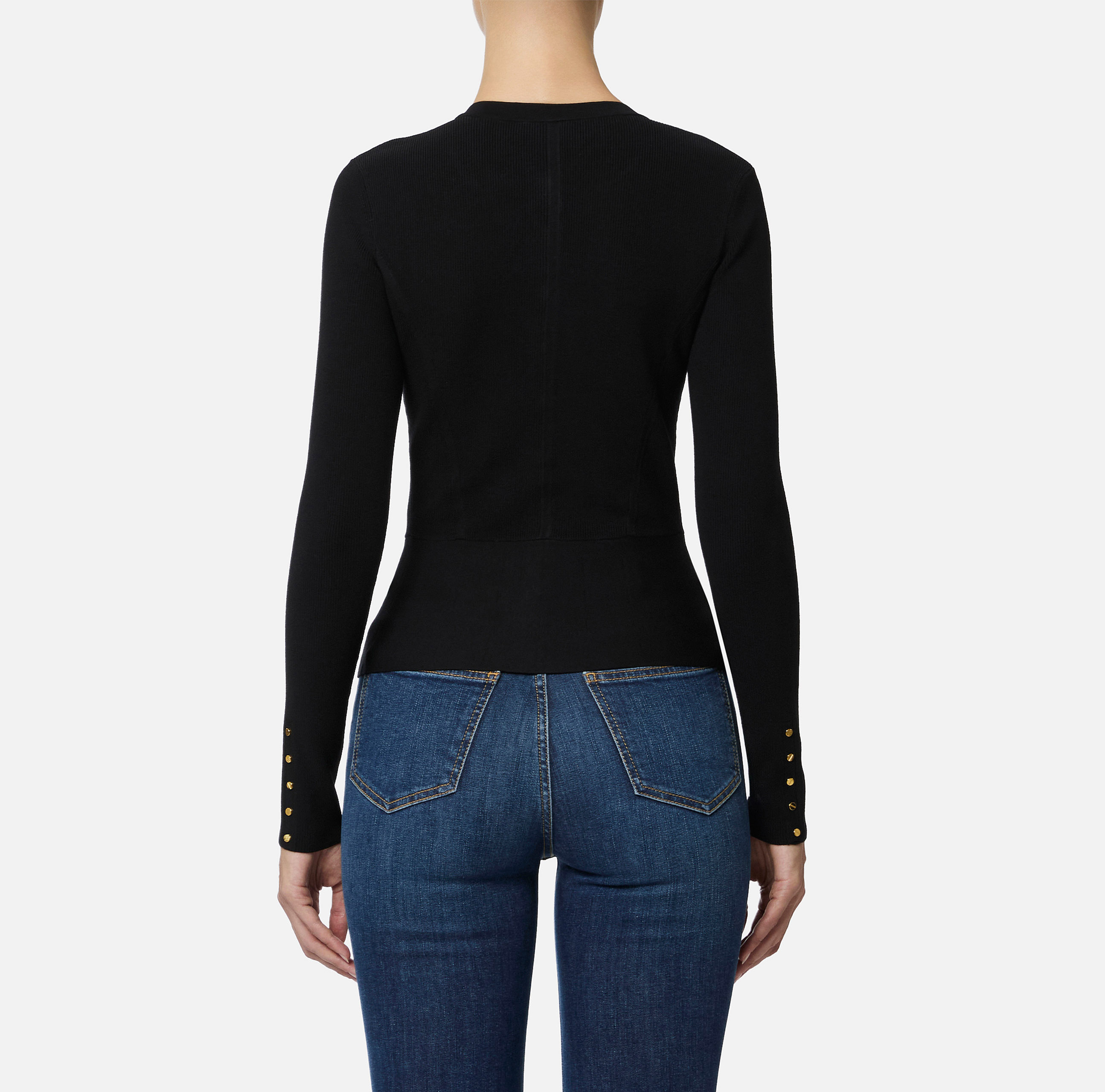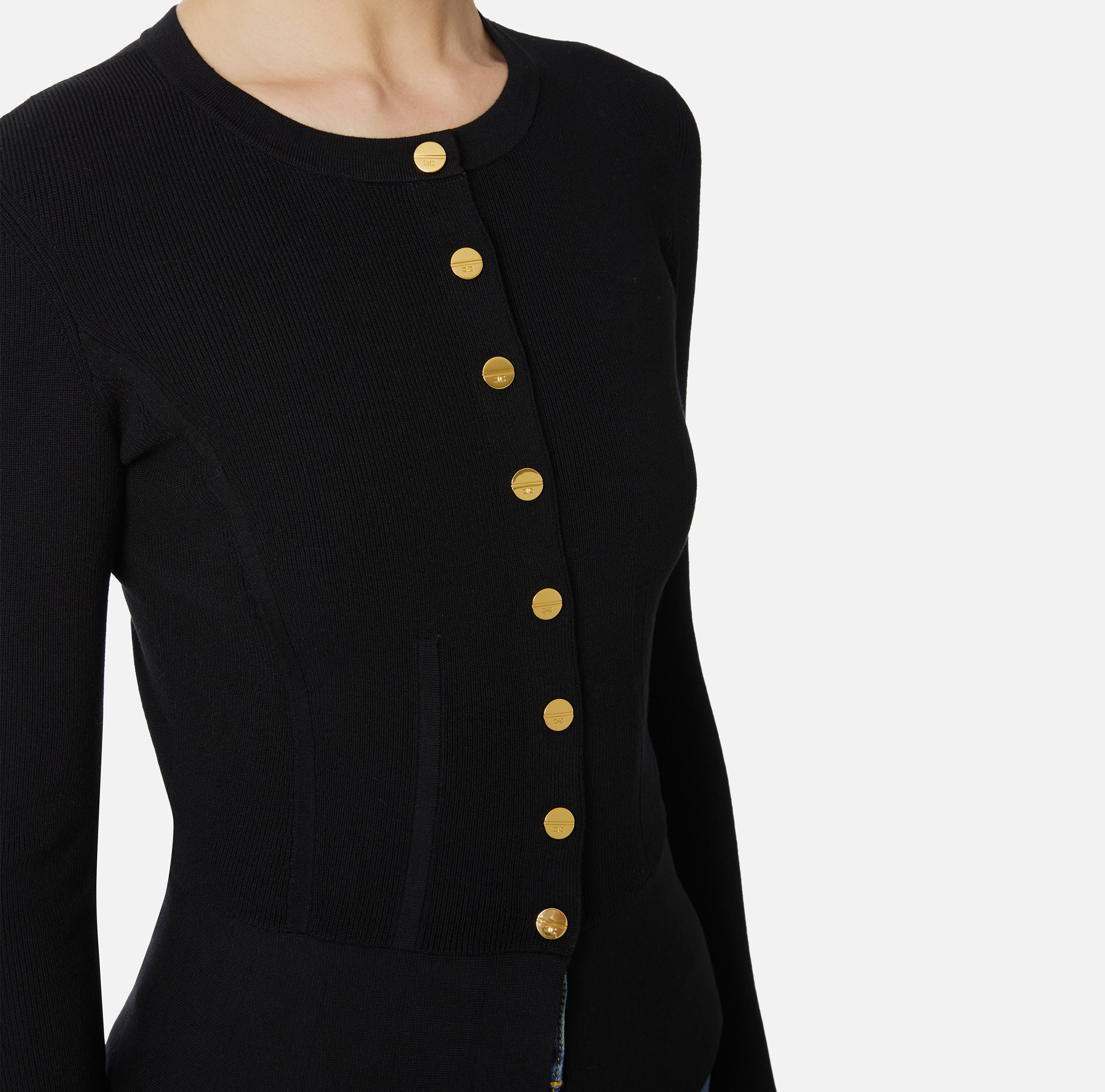 Giacca in maglia dalla vestibilità aderente. Il capo ha spalle strutturate, scollo rotondo e maniche lunghe. Si distingue per i dettagli come le nervature e la baschina al fondo, a donare una linea definita e armoniosa. I bottoni in metallo dorato con logo donano luce.
