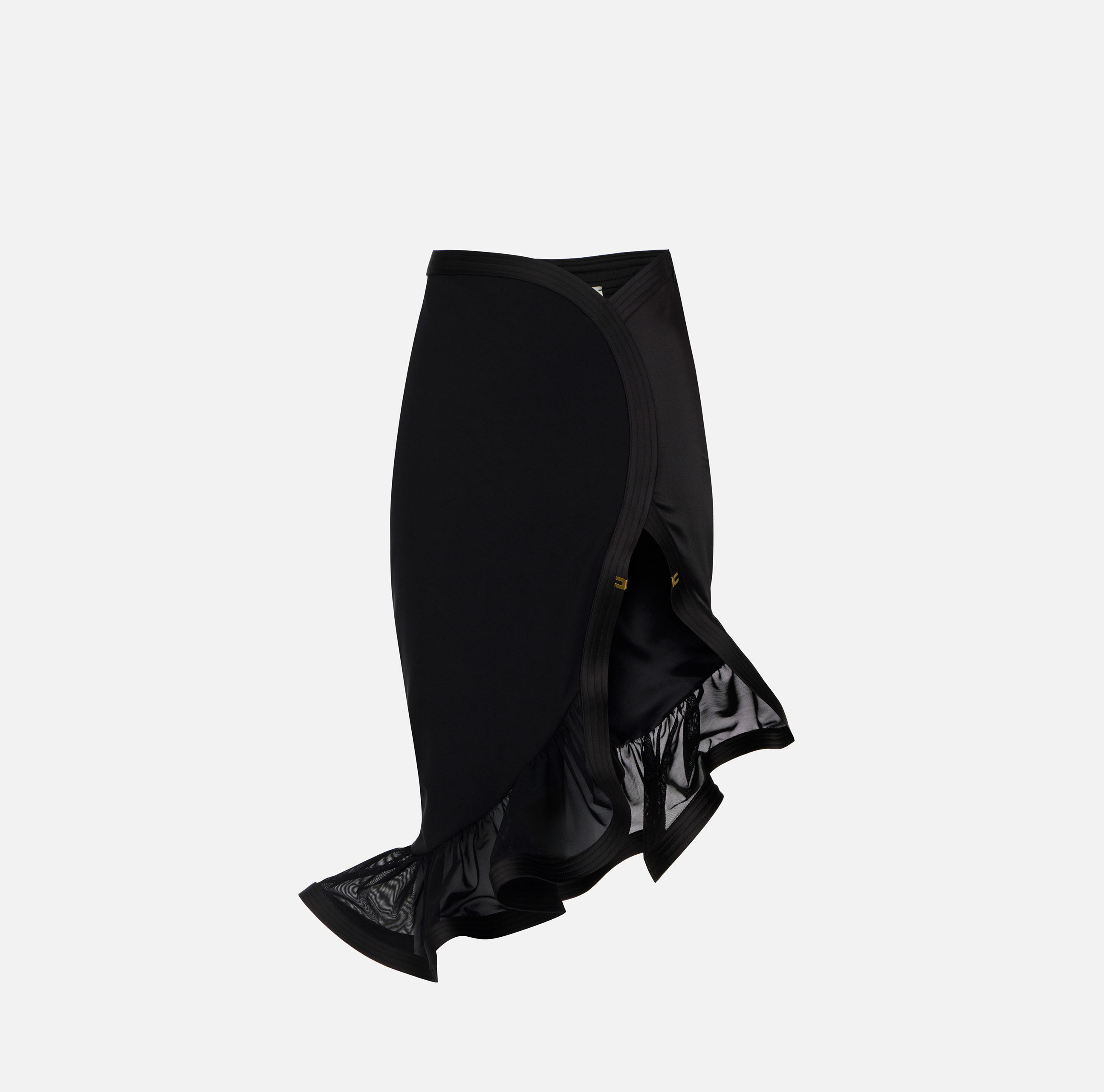 Gonna realizzata in crêpe sul davanti e in raso sul retro. Si distingue per la maxi ruche che decora il fondo, realizzata in tulle per raffinati contrasti materici e sostenuta da una crinolina interna per un volume che rende il capo protagonista. Vestibilità aderente.