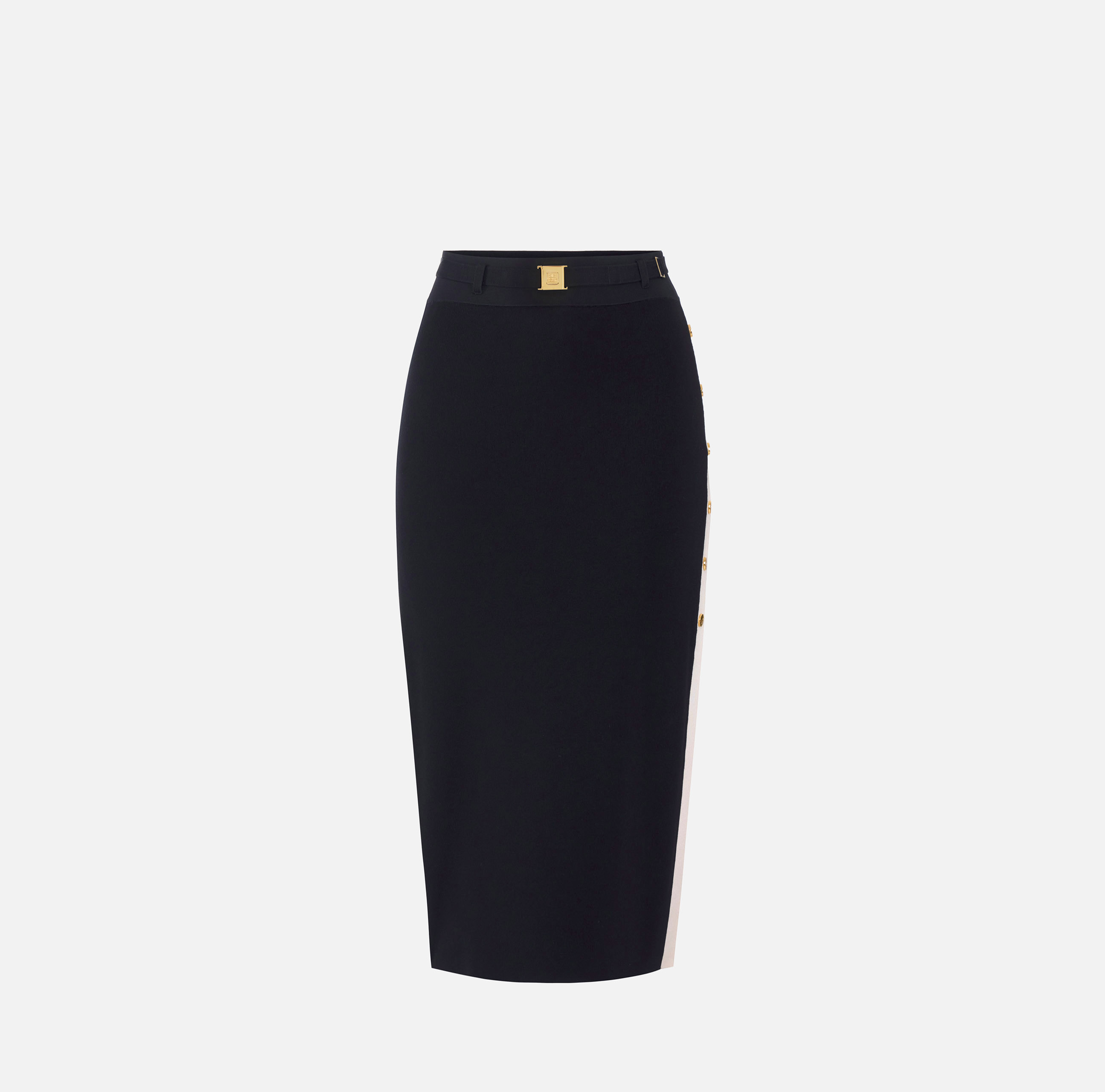 Gonna midi in maglia. Si distingue per le bande in viscosa lucida e per la lavorazione jacquard applicata al logo, presente sullo spacco laterale. I colori a contrasto enfatizzano il design grafico del capo. La cintura in vita ha placca in metallo dorato con logo per un ultimo dettaglio di stile. Vestibilità aderente.
