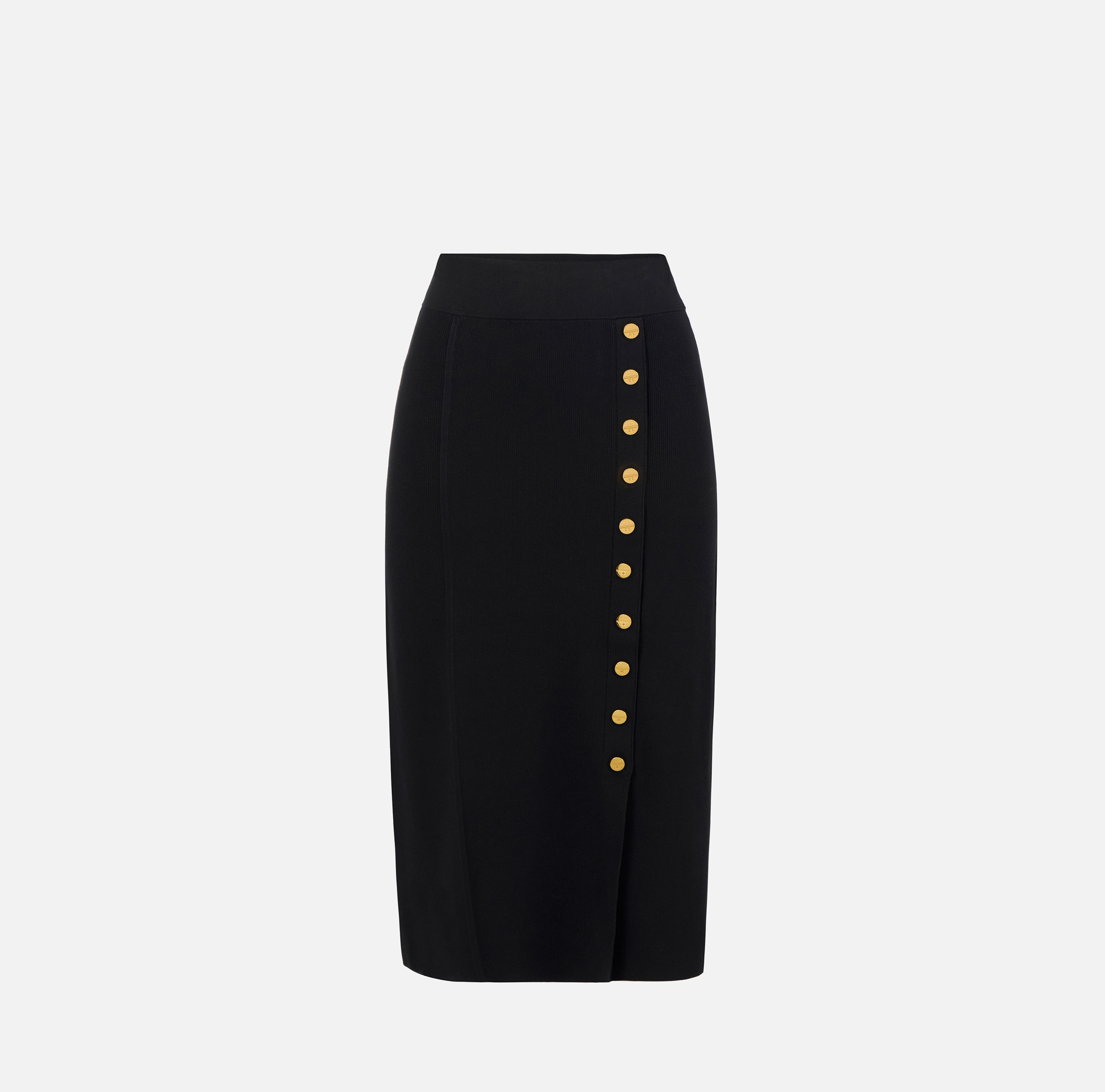 Gonna midi in maglia punto stoffa dalla vestibilità slim. Si distingue per i dettagli che aggiungono definizione, come le nervature in tono e lo spacco al fondo. I bottoni in metallo dorato regalano note luminose al capo.