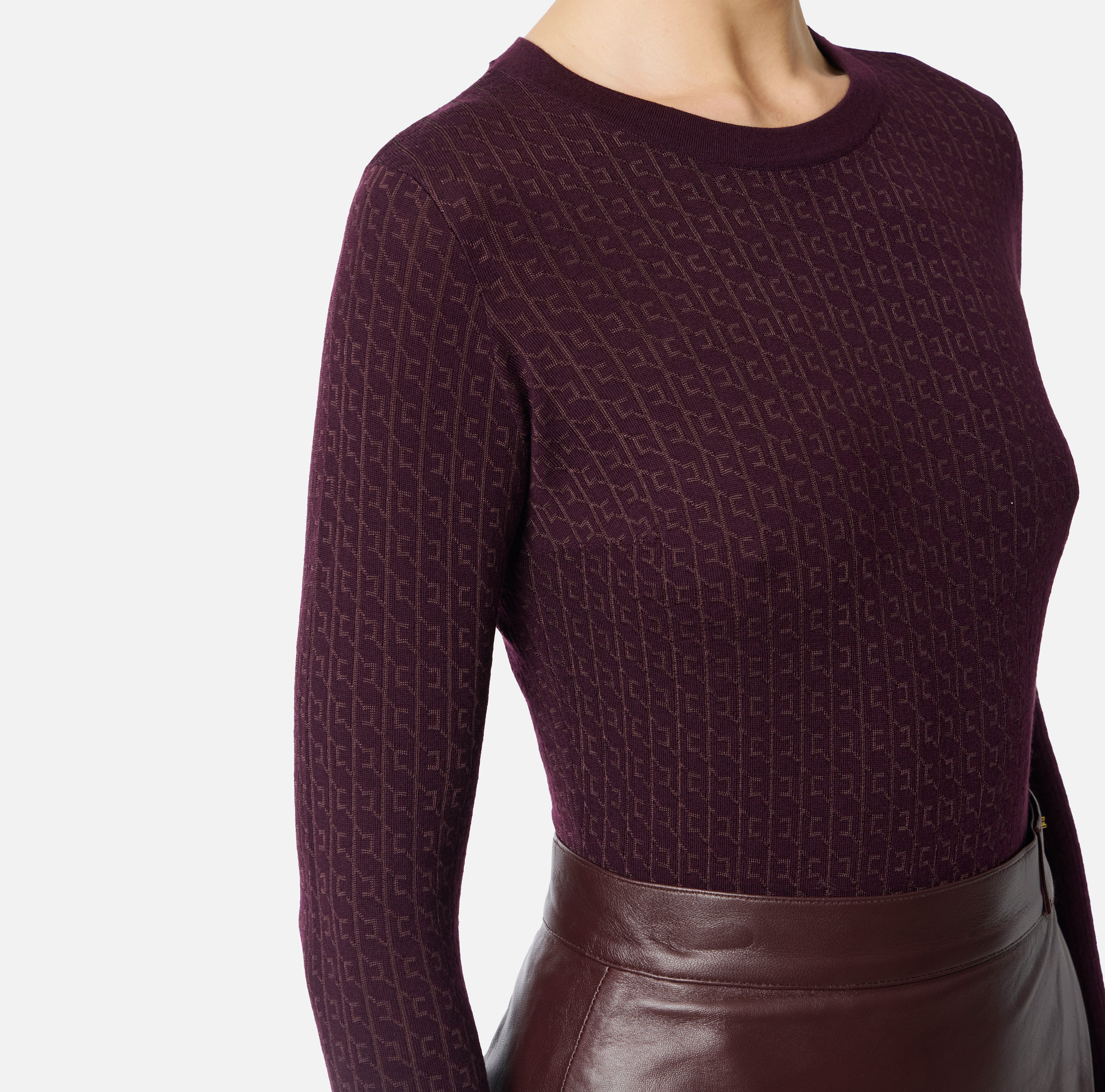 Maglia in lana dalla vestibilità aderente. Ha girocollo con logo intarsiato e si distingue per la trama jacquard con pattern di collezione declinato in micro-logo, in tono per creare studiati effetti di chiaroscuro. I bordi sono rifiniti a costine.