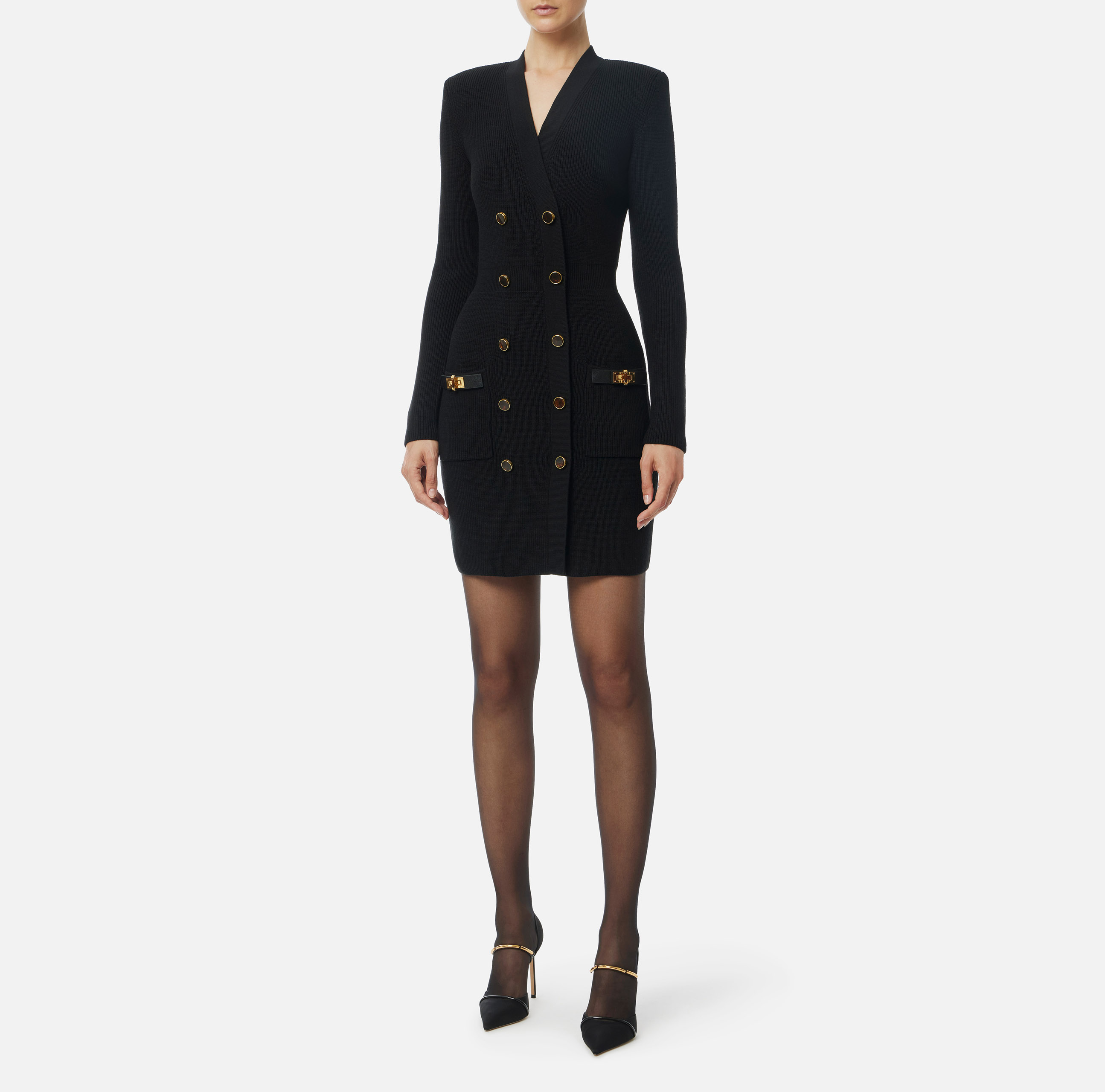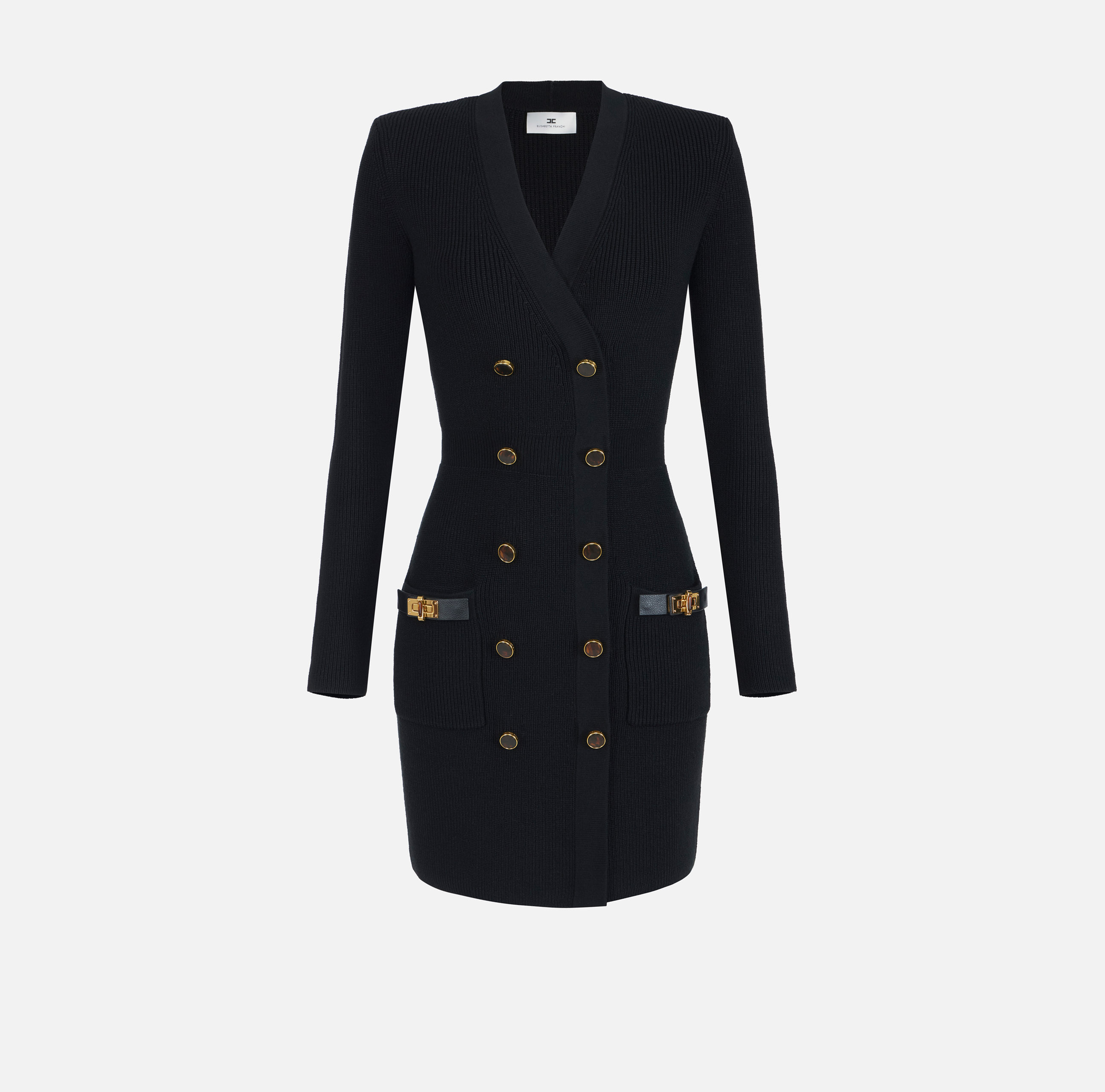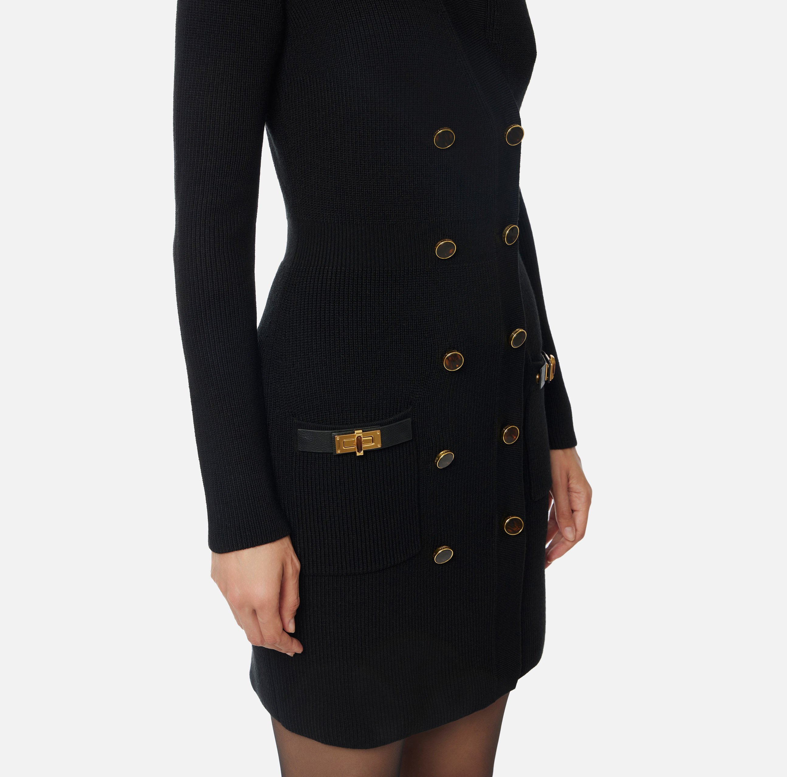 Mini abito robemanteau in maglia dalla vestibilità aderente. Dalla trama ricca e avvolgente, il vestito ha spalle strutturate, doppiopetto e tasche impreziosite dai cinturini con girello decorativo in metallo dorato. I bottoni dalle sfumature ambrate completano il capo.