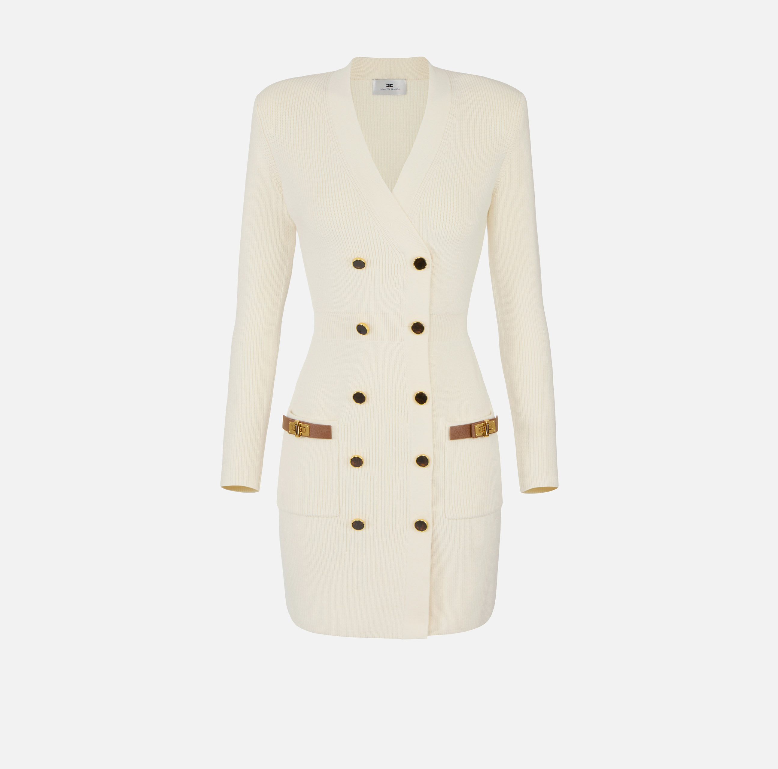 Mini abito robemanteau in maglia dalla vestibilità aderente. Dalla trama ricca e avvolgente, il vestito ha spalle strutturate, doppiopetto e tasche impreziosite dai cinturini con girello decorativo in metallo dorato. I bottoni dalle sfumature ambrate completano il capo.