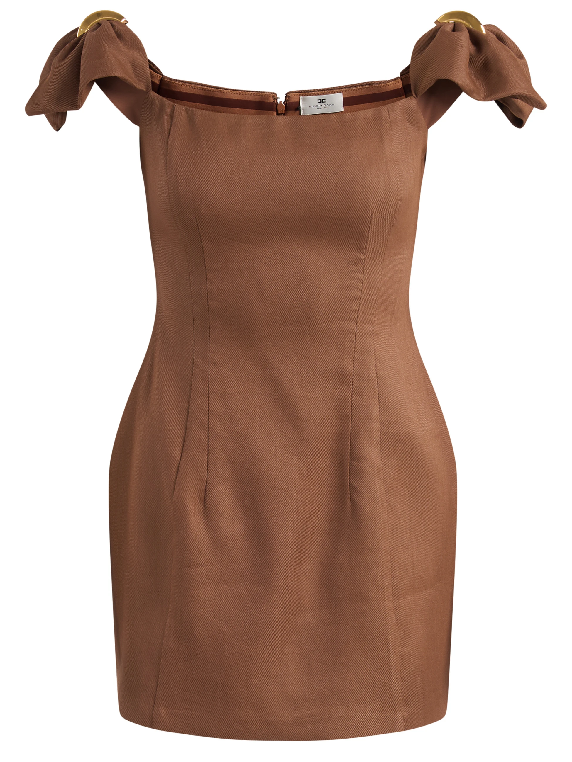 Mini abito in misto lino. Il vestito ha spalle scoperte e costruzione ad anfora per una silhouette definita. Le maniche sono impreziosite da accessori in metallo dorato che ricreano la forma di un fiocco, aggiungendo un raffinato dettaglio di stile. Vestibilità regular.