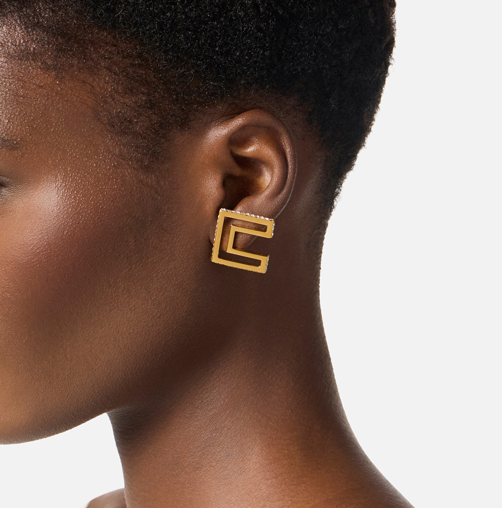 Orecchini realizzati in metallo con finitura dorata. Dal design essenziale che ricrea la forma del logo, hanno perimetro esterno impreziosito da luminosi strass.