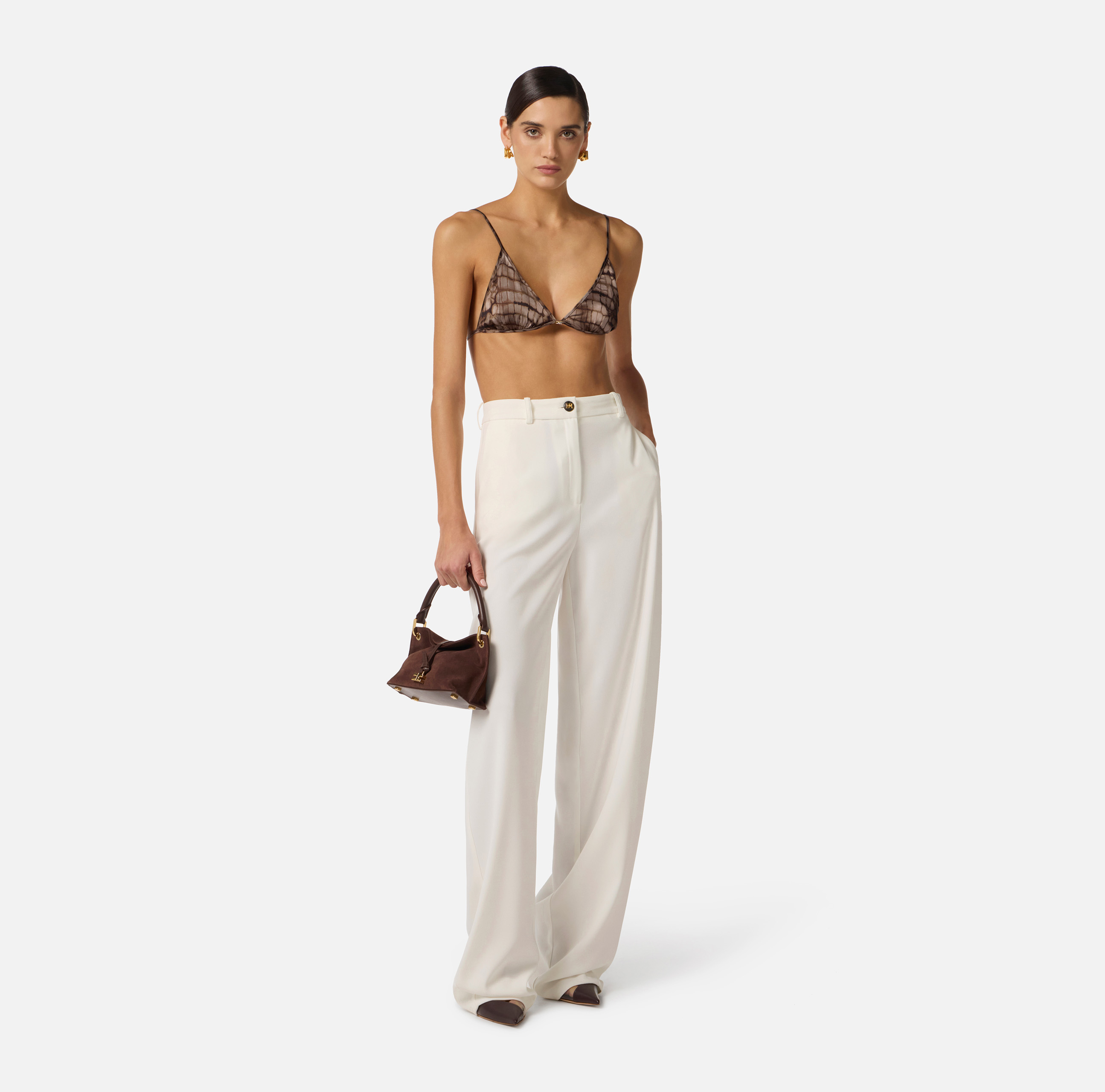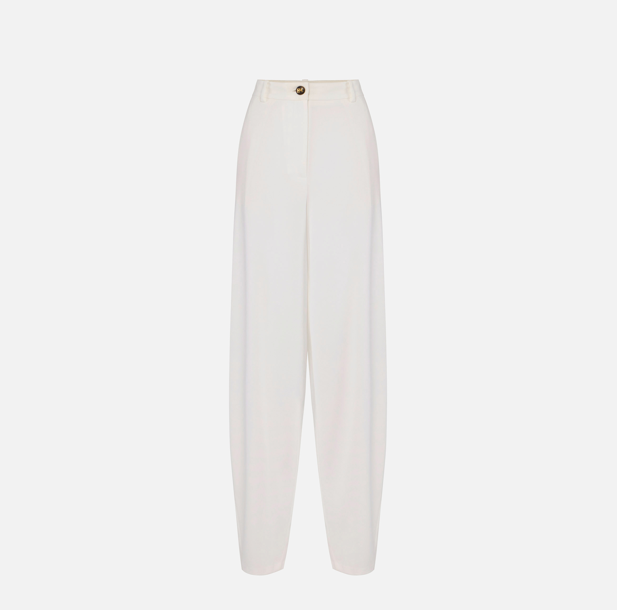 Pantaloni in crêpe leggero. Dal volume protagonista, hanno tasche alla francese e patte applicate sul retro. Il bottone con logo è il dettaglio di stile. Vestibilità over.