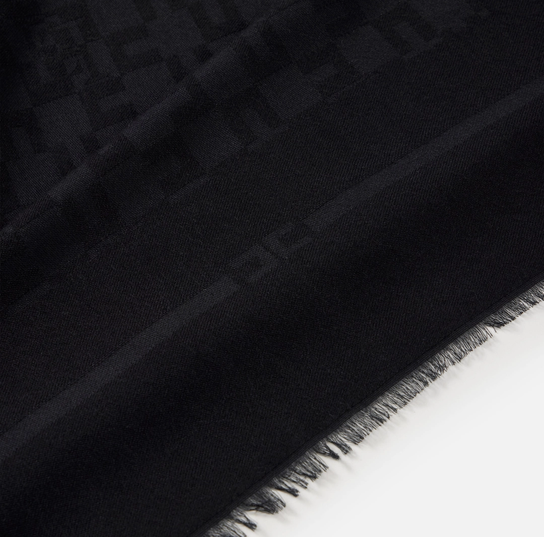 Sciarpa quadrata caratterizzata dal pattern all-over con logo. Cornice in tinta unita e in tono, con logo e bordi sfrangiati a donare movimento.