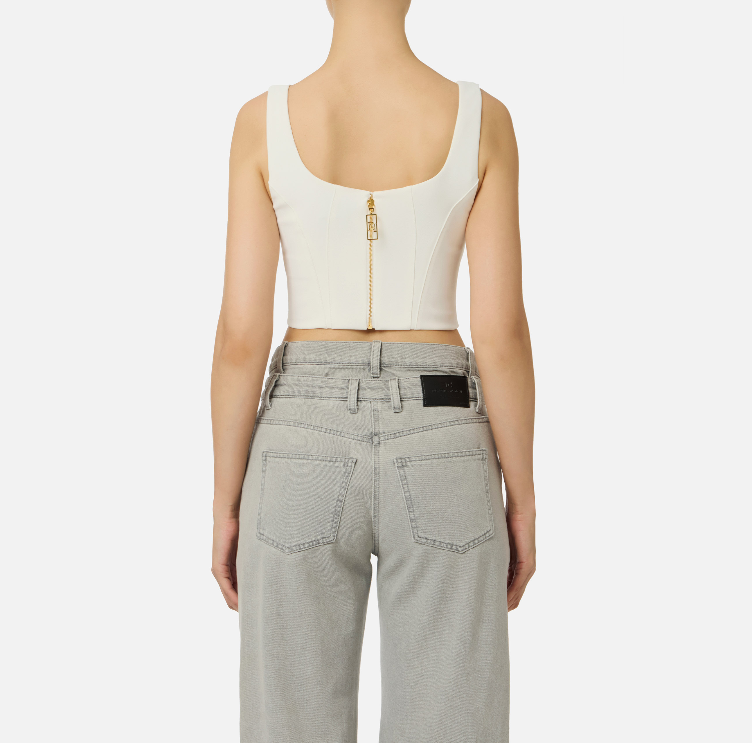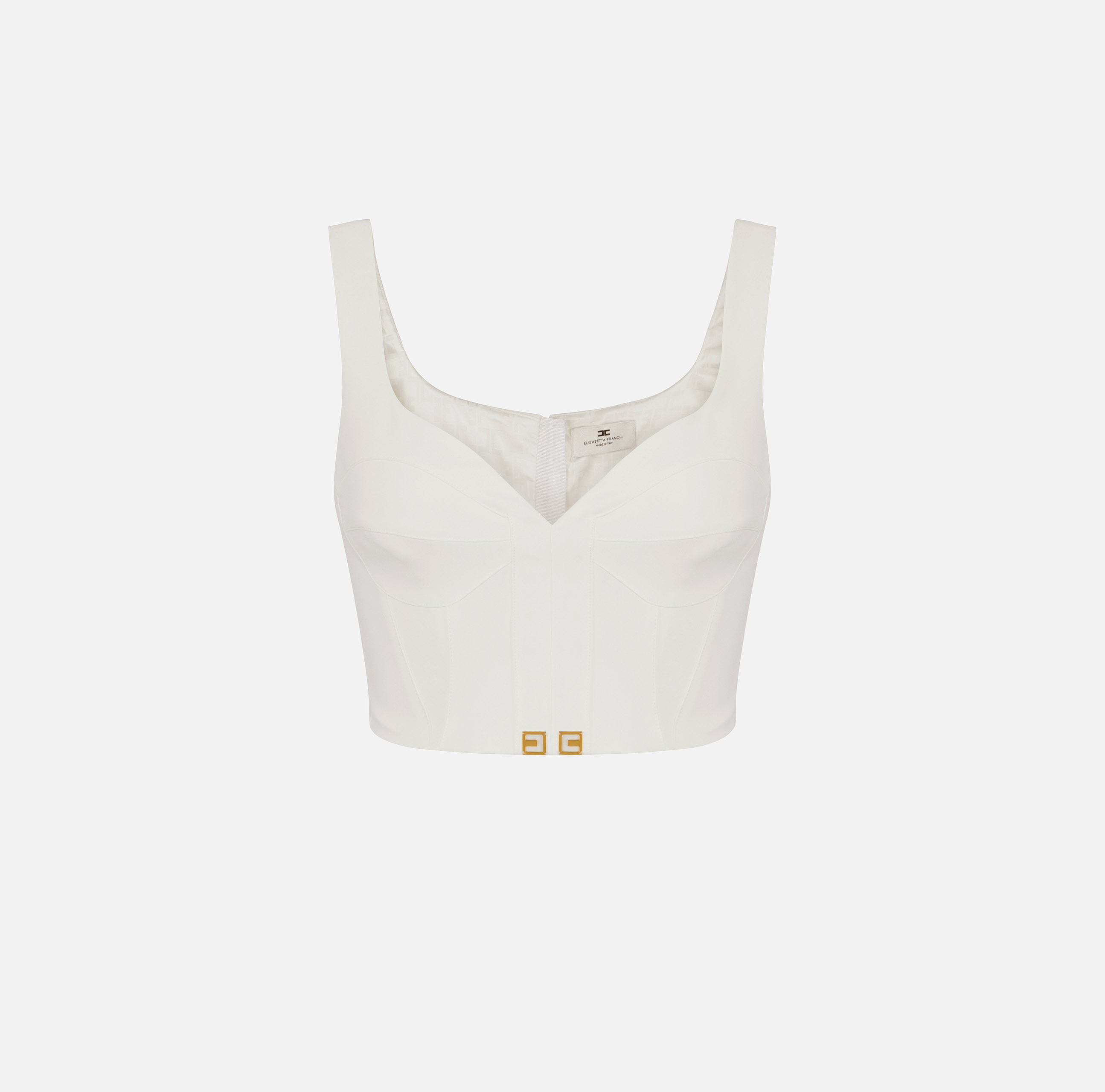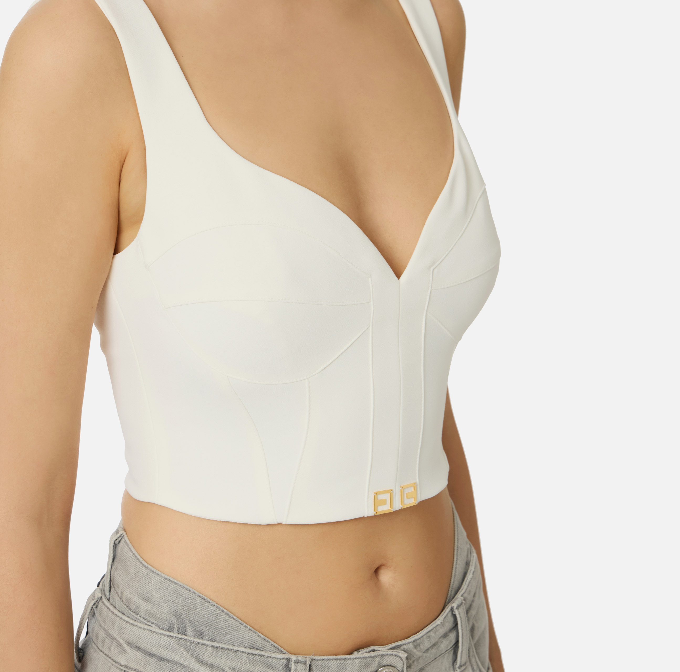 Top in crêpe leggero dalla vestibilità aderente. Con scollo a cuore, è definito dai tagli di ispirazione bustier che donano struttura a coppe e fianchi. Un doppio dettaglio con logo aggiunge una nota luminosa.