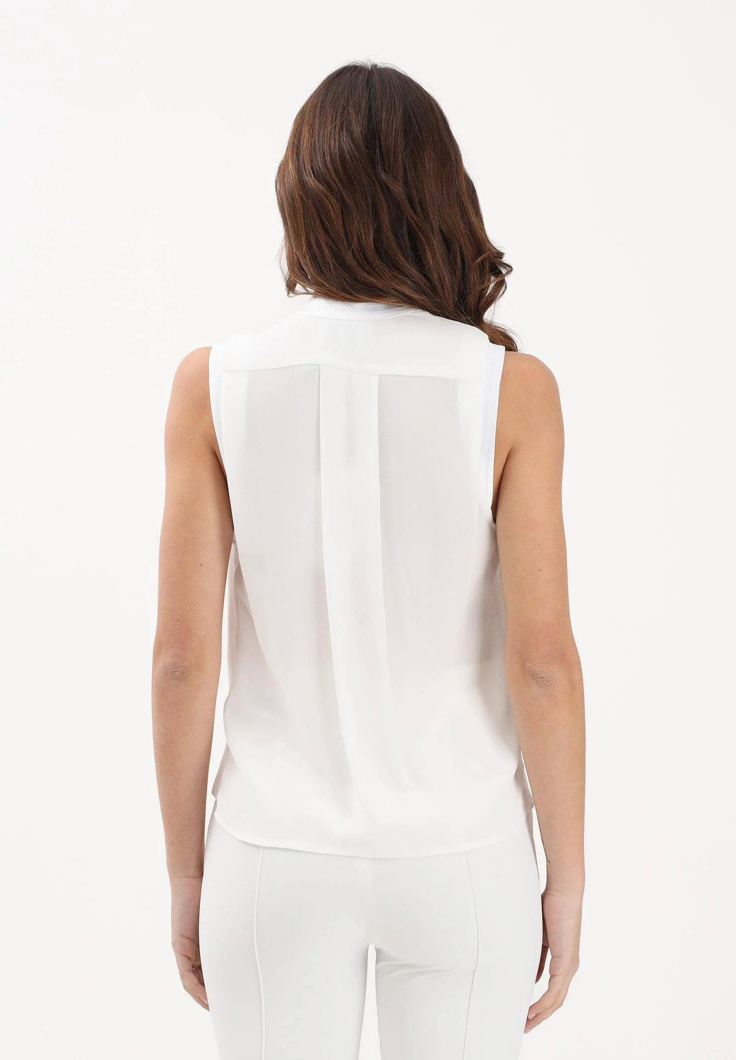 Top in georgette di viscosa, smanicato e rifinito con dettagli in raso. Ha collo illuminato da bottoni in metallo dorato con apertura che cade morbida sul davanti. Vestibilità regular.