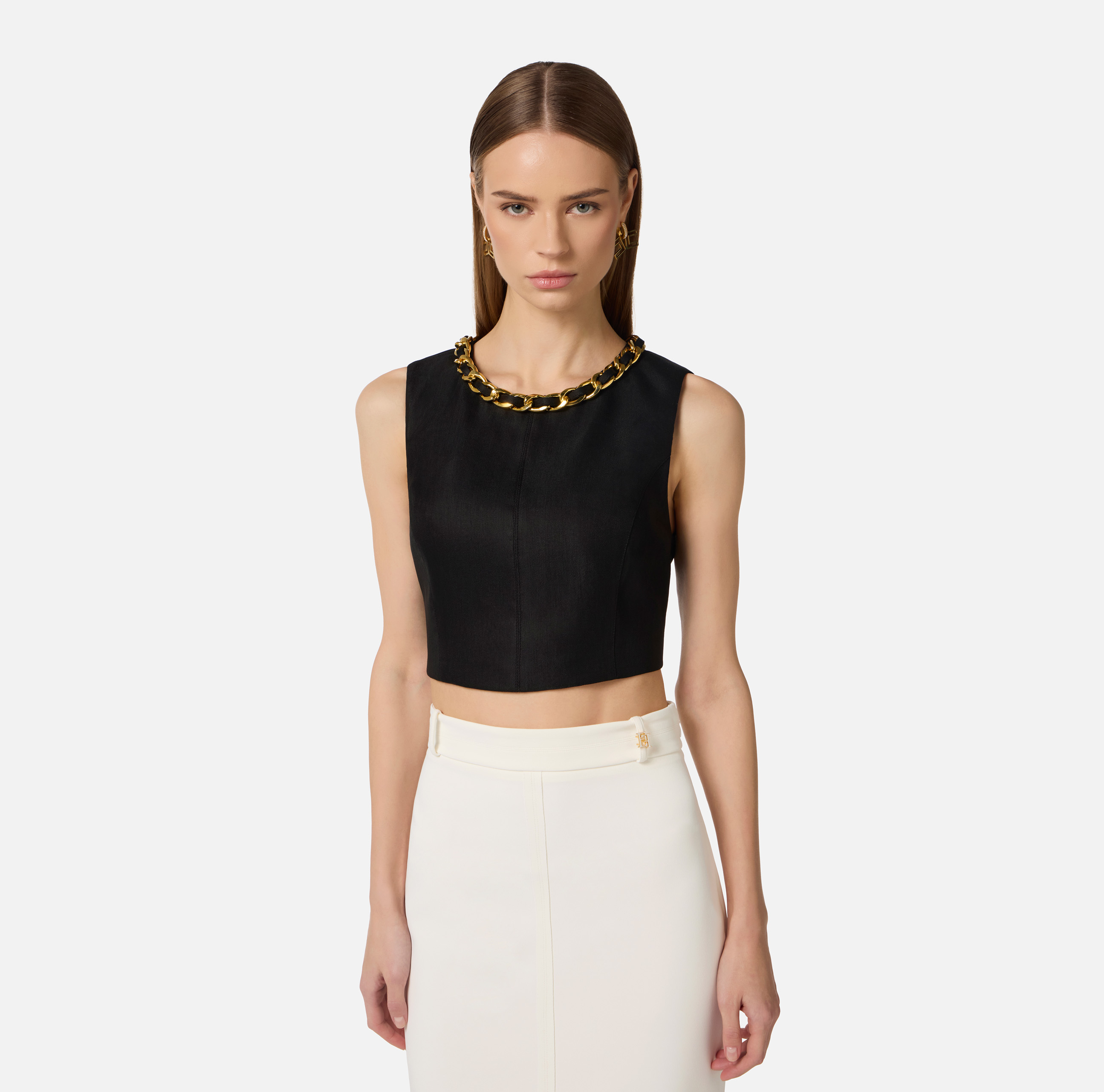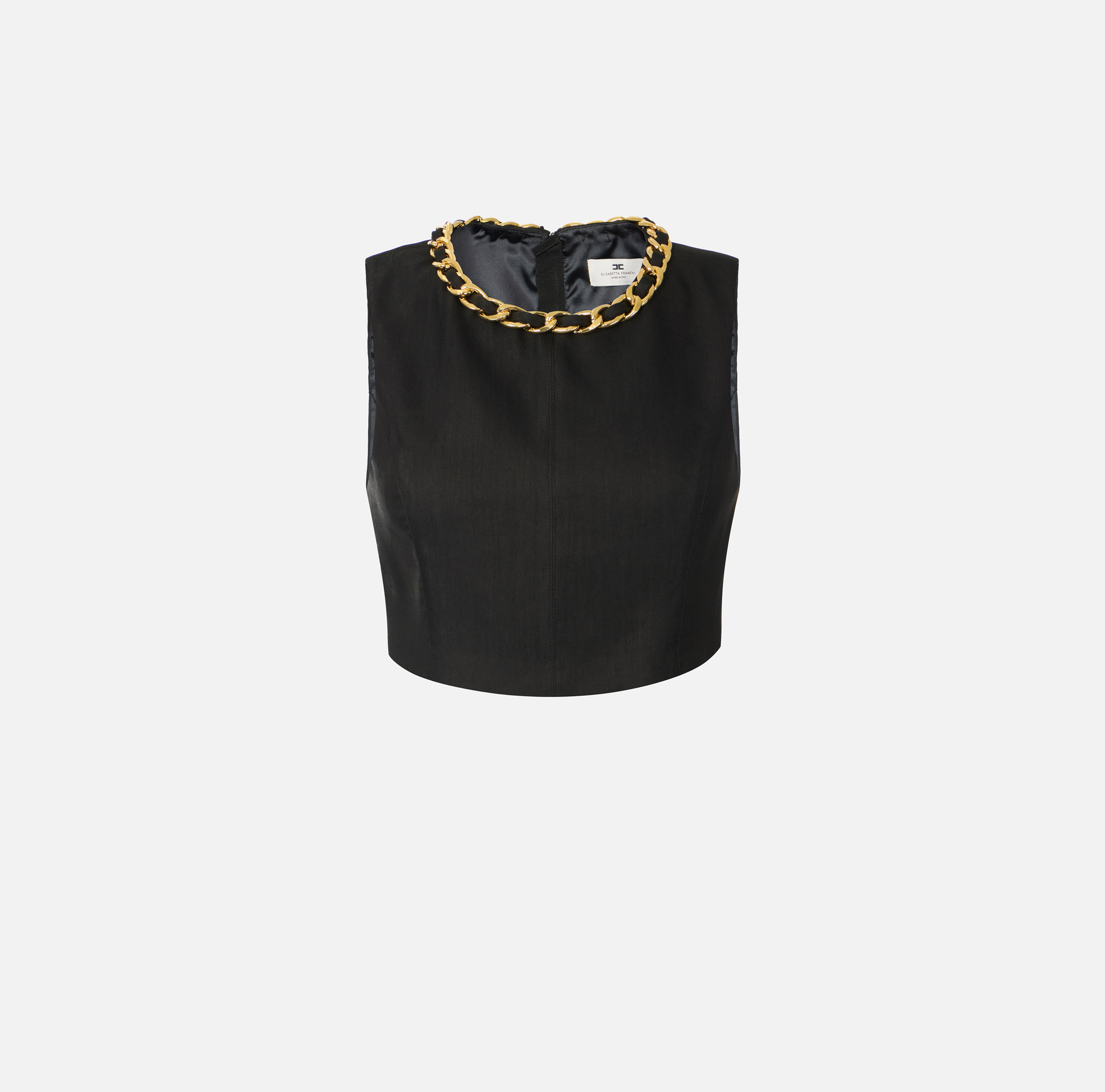 Top smanicato in misto lino con taglio crop. È caratterizzato dalla catena in metallo dorato che illumina lo scollo, per una nota di luce. Vestibilità regular.