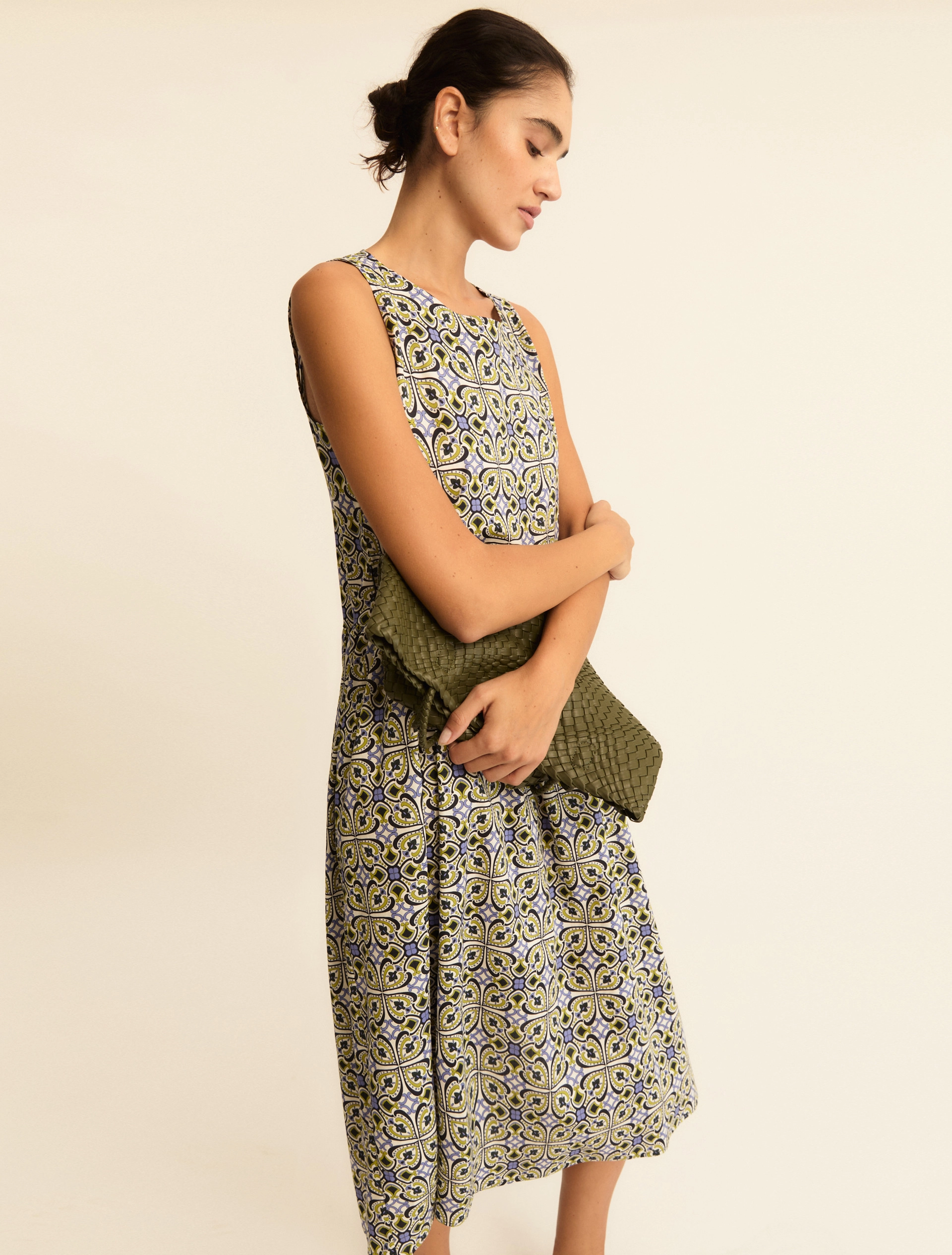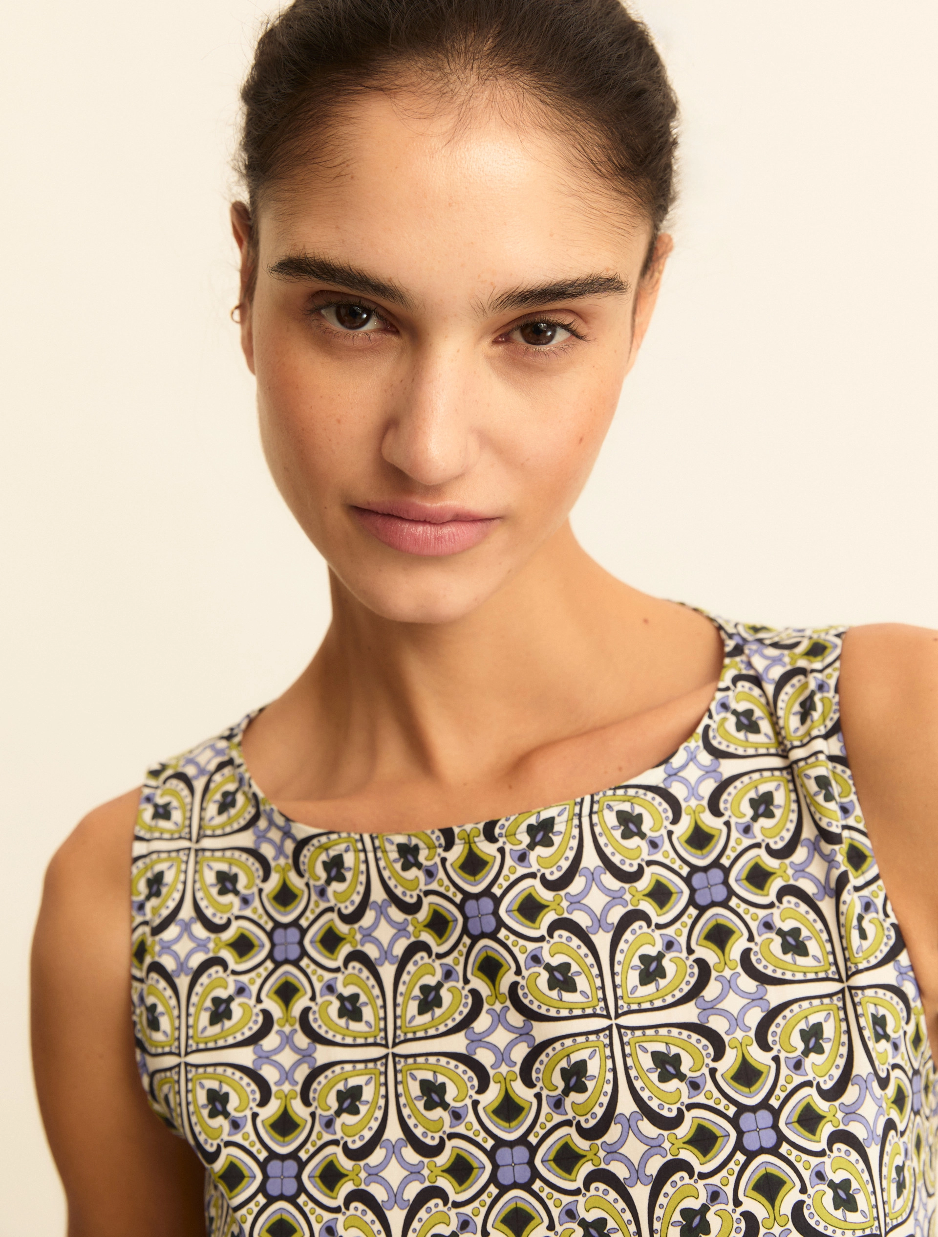 Abito in fresco popeline di cotone, con stampa vibrante per una nota colorata alle tue giornate. La cintura mette in evidenza i volumi, con top più aderente e gonna voluminosa.