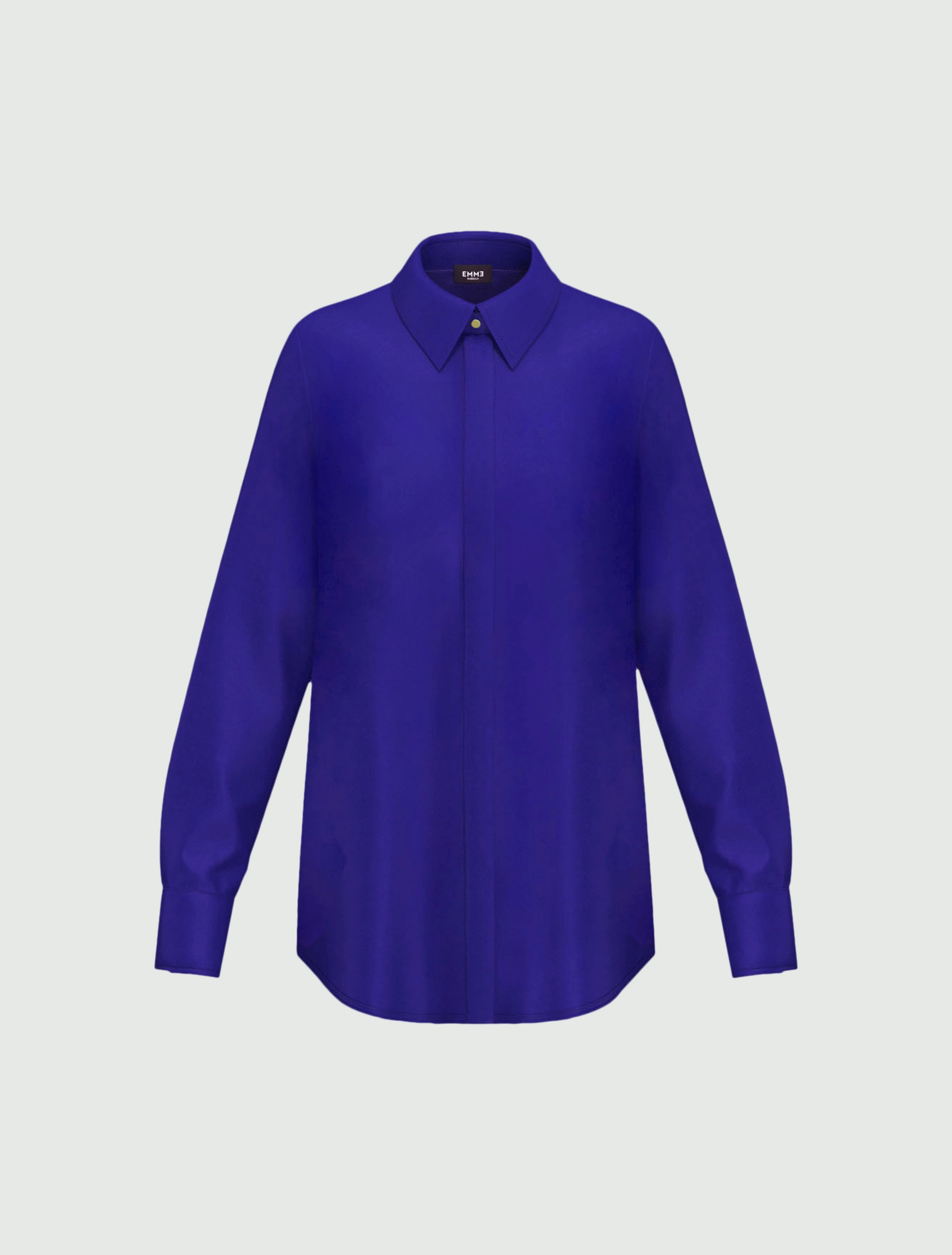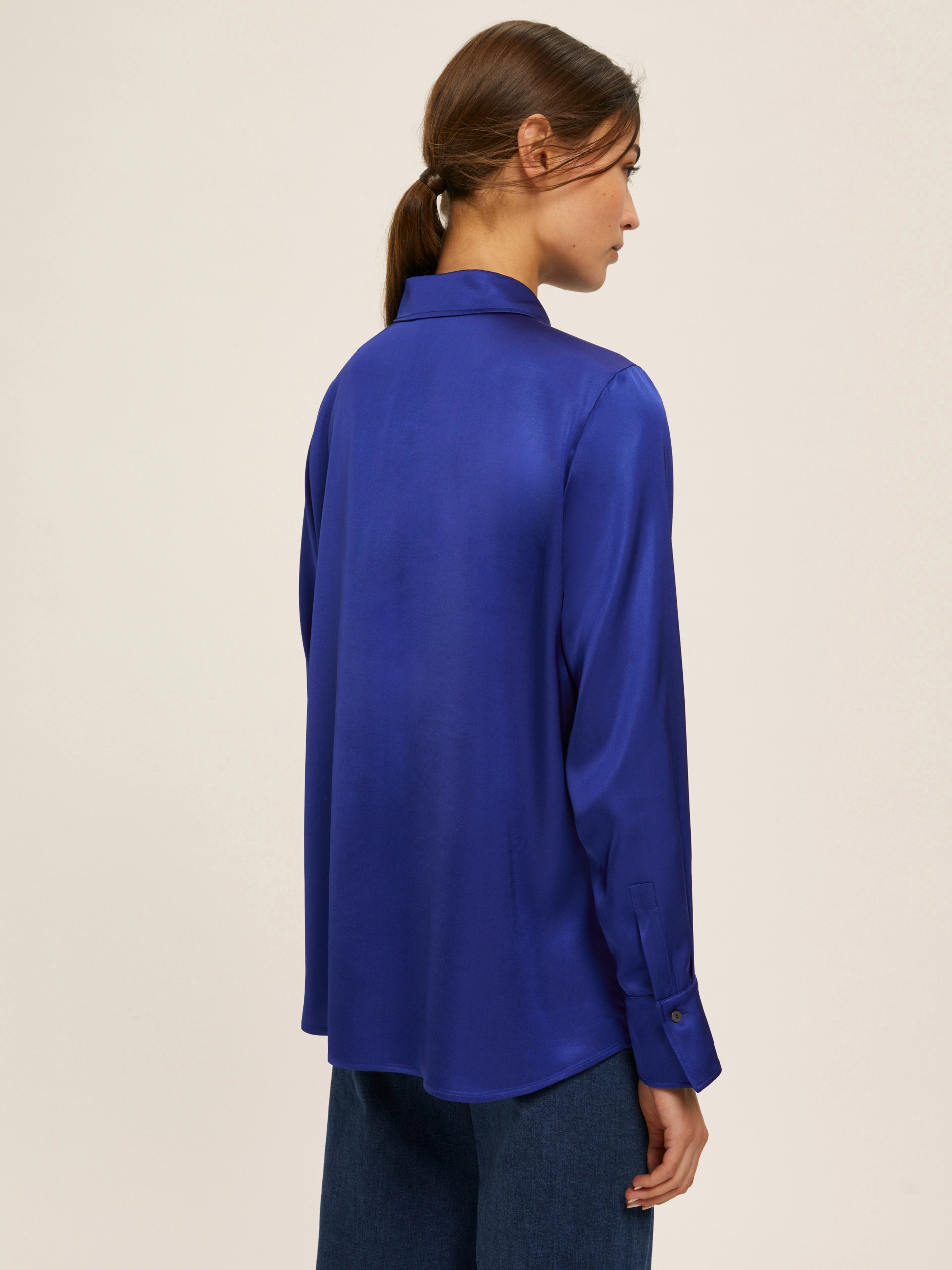 Nuance vibranti e raso lucente definiscono questa camicia dalla linea femminile. Il bottone gioiello aggiunge una nota scintillante, perfetta da completare con i denim preferiti o con un completo sartoriale.