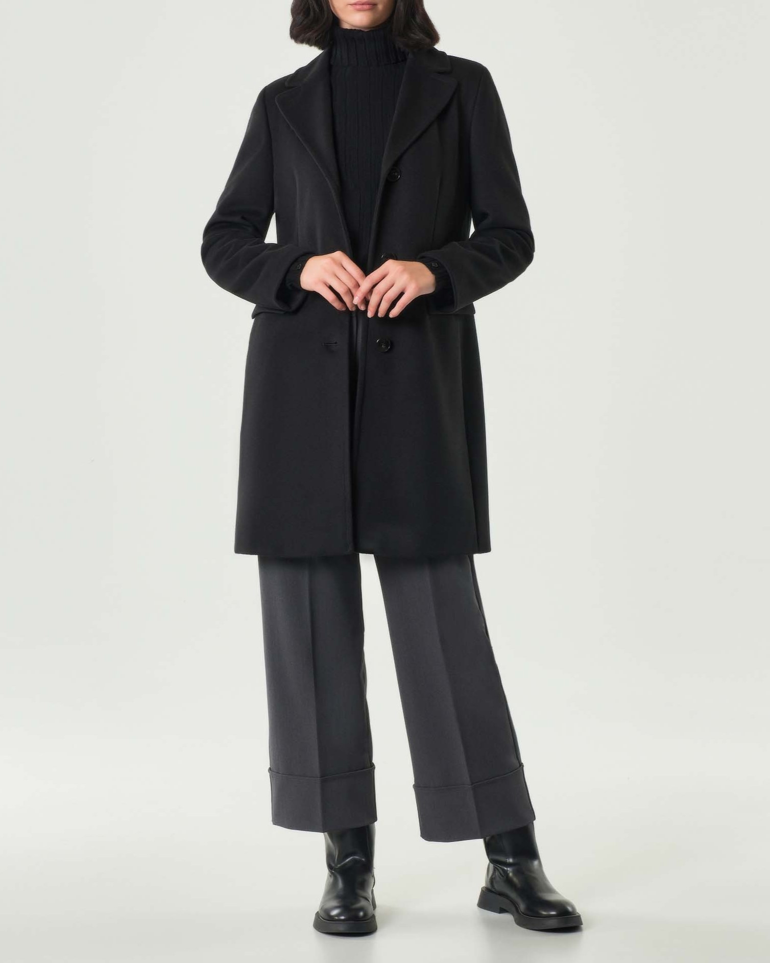 Cappotto "Acerbi" nero dal design elegante con revers classico e chiusura a bottoni. Modello lungo con tasche a pattina e linea femminile. Realizzato in jersey panno soft per un look sofisticato e confortevole.