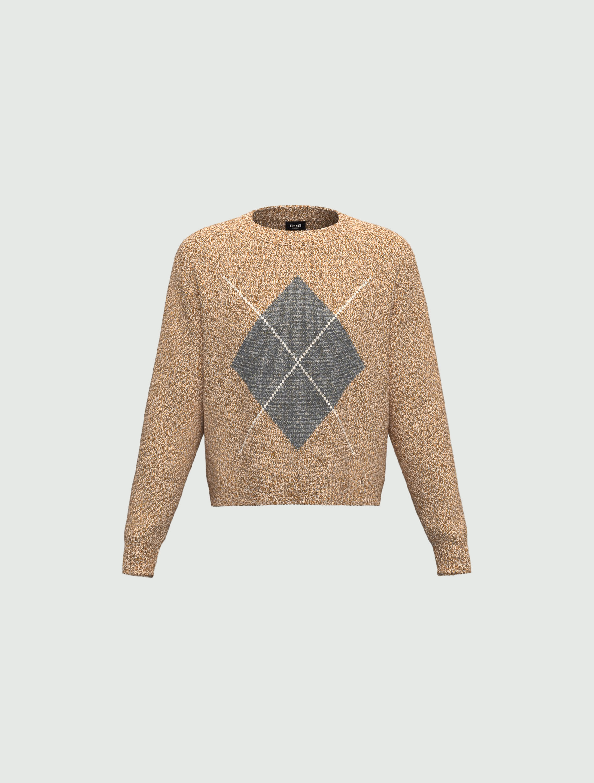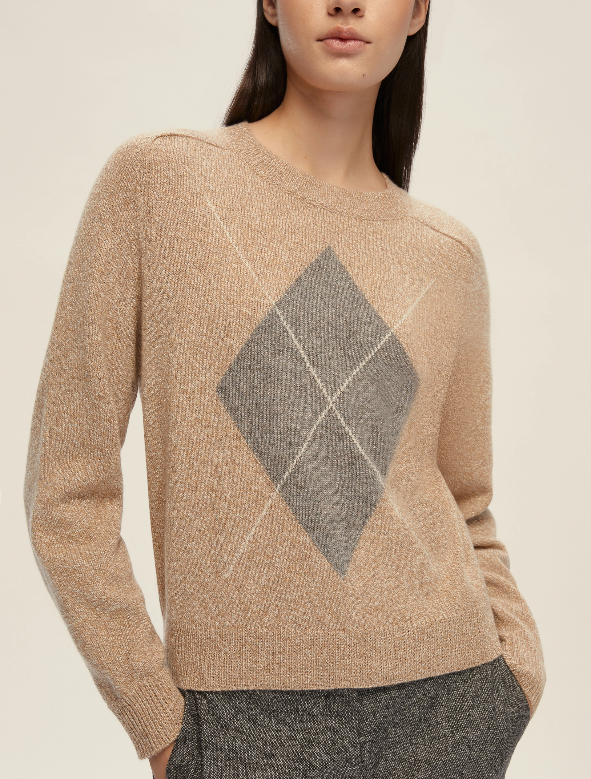 Il bagliore del lurex reinterpreta il classico disegno a rombo di questa maglia in chiave luminosa e grafica. Le linee sono morbide, perfette da accostare ai pantaloni in flanella o al denim preferito nelle occasioni più rilassate.