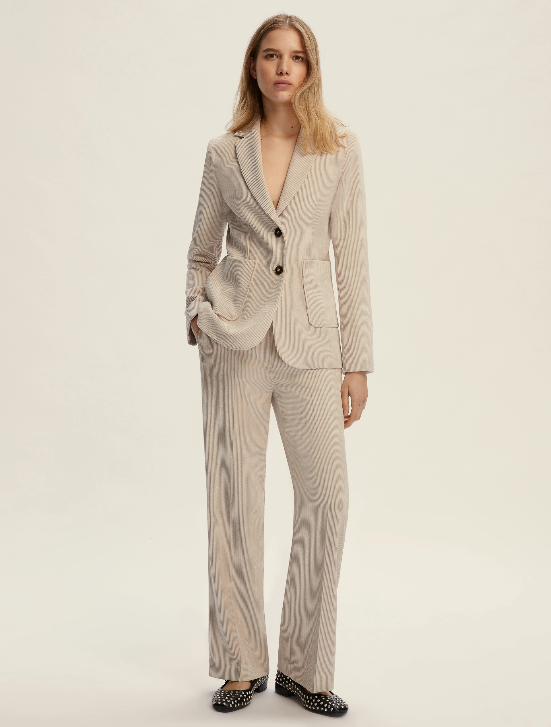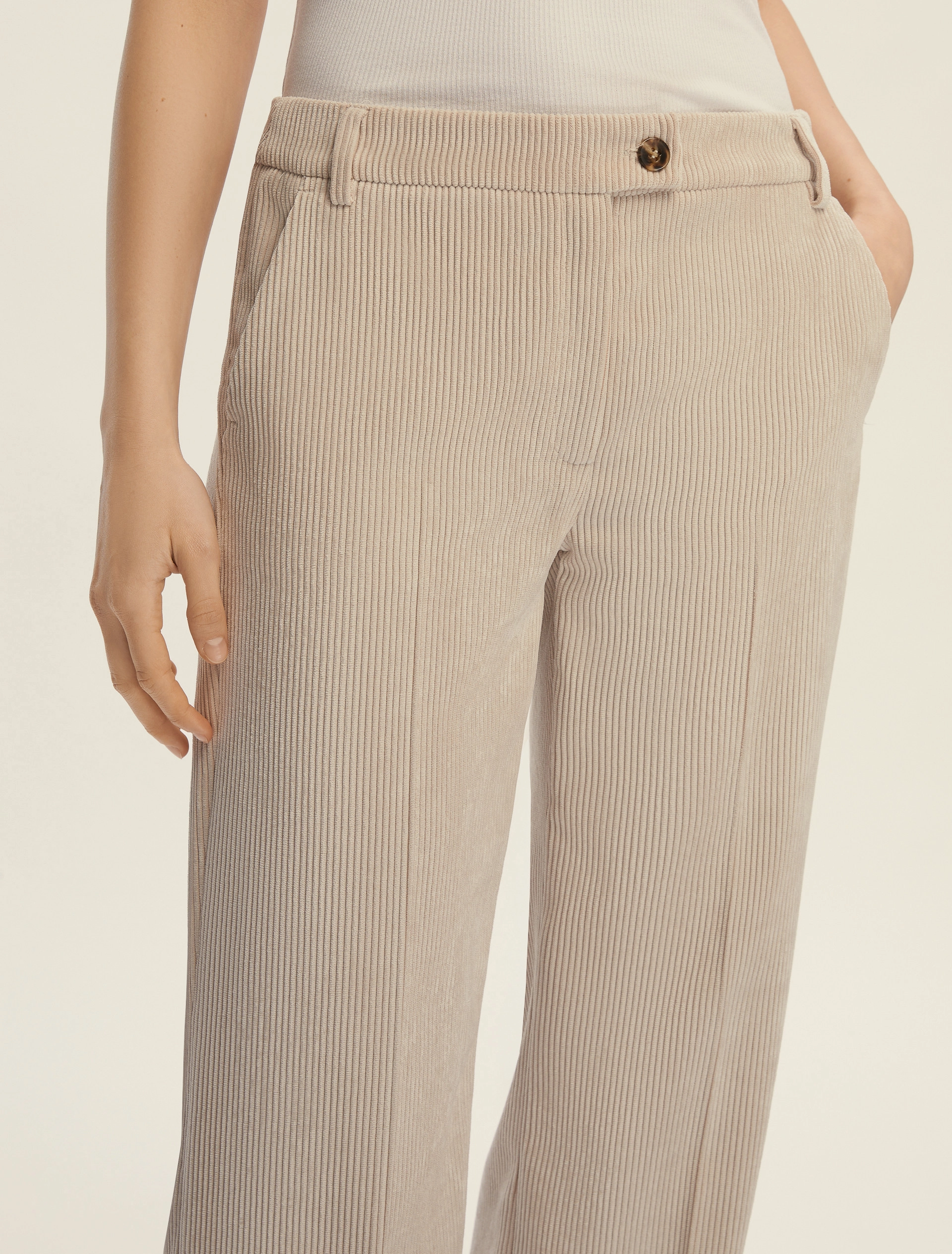 Morbido velluto e linee pulite definiscono questo pantalone in velluto stretch a coste. I piccoli dettagli sartoriali della costruzione vengono addolciti dal fascino seventy del tessuto.