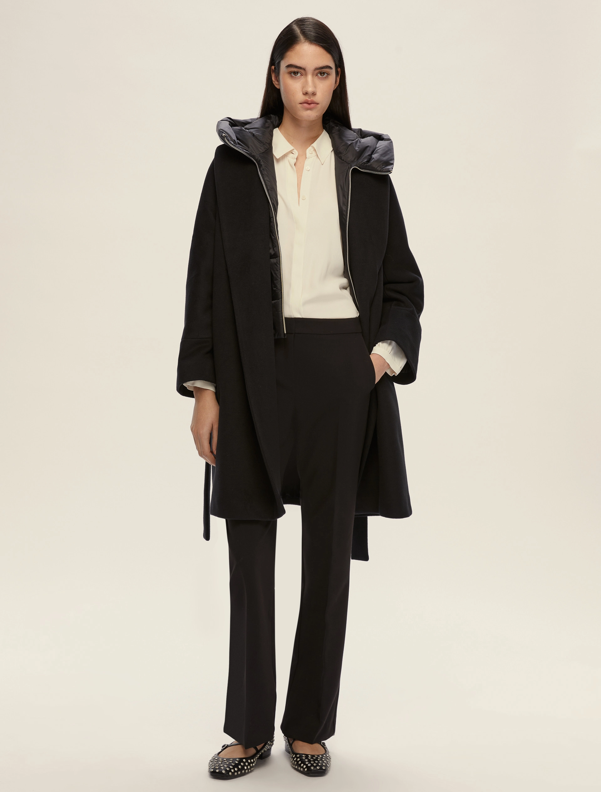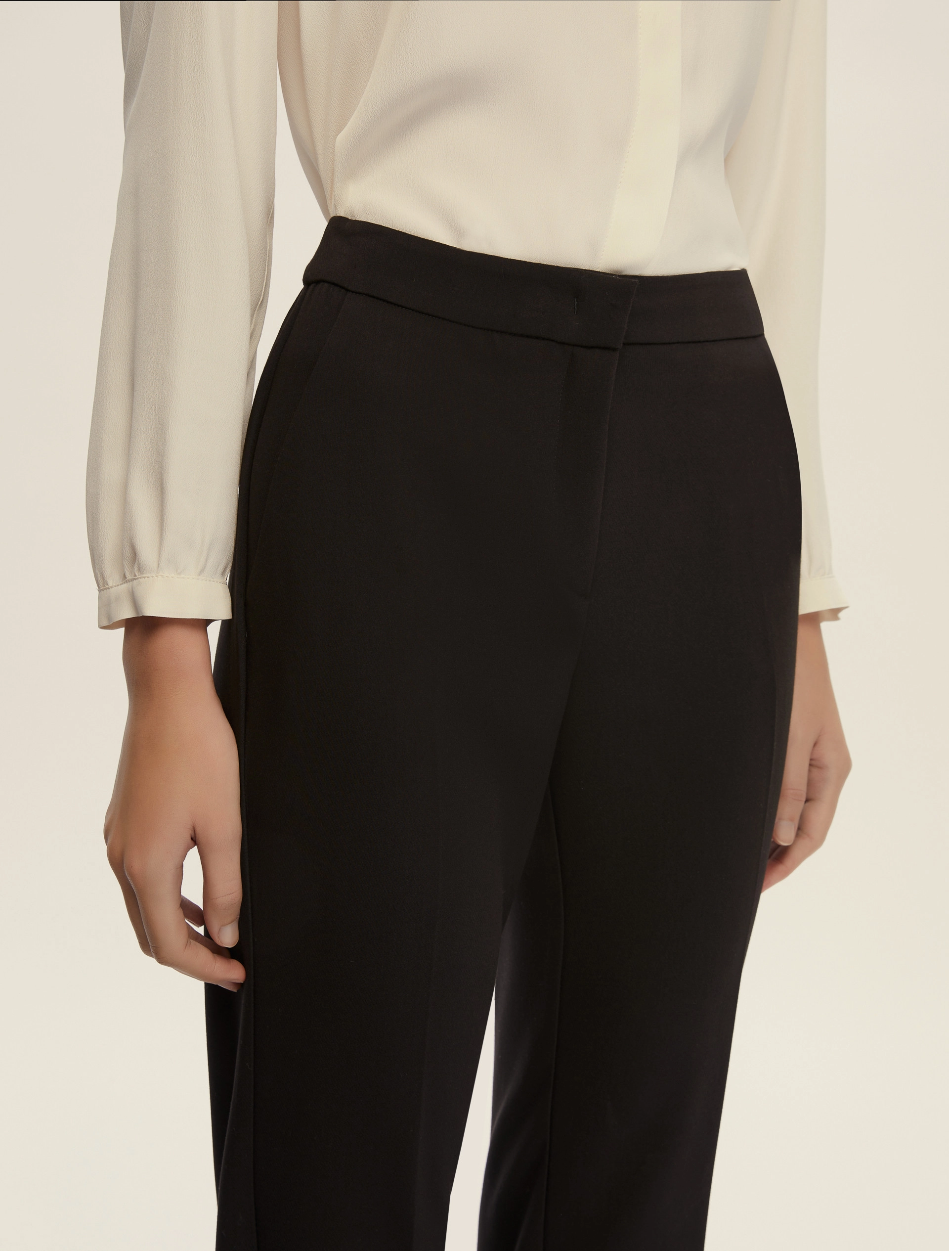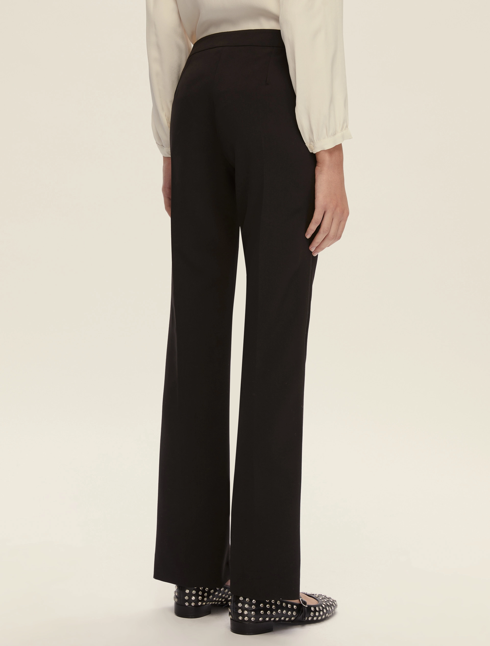 Il nuovo basico ha una marcia in più: questo pantalone scolpisce la silhouette con una linea aderente che si apre in un flare misurato. Versatile e con dettagli tailoring, si abbina armoniosamente alle camicie in seta, ai cappotti o ad una maglia boxy che crea volume a contrasto.