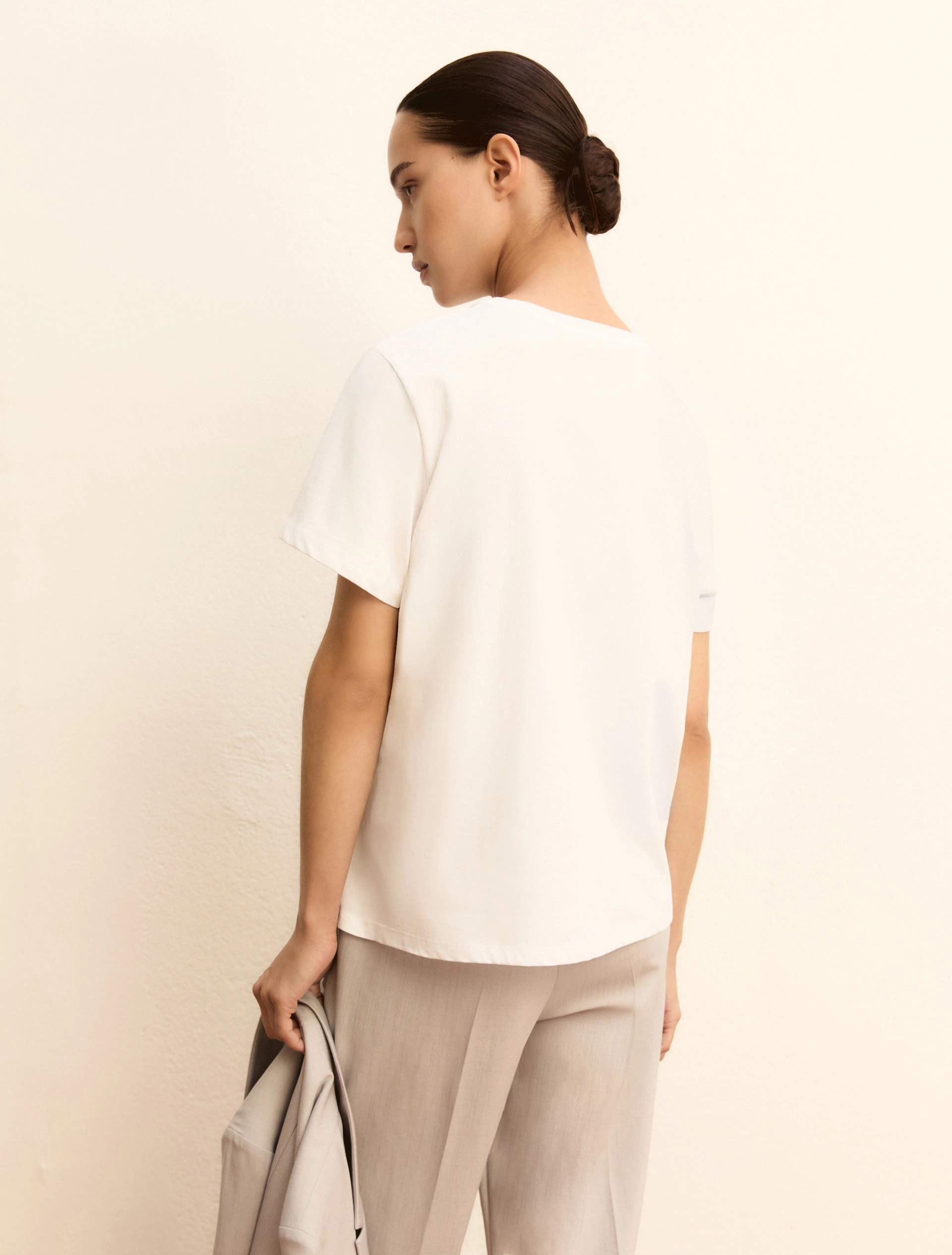 Pilastro del guardaroba estivo, la t-shirt in puro cotone è decorata da una stampa fantasia sul davanti. Perfetta sotto un blazer morbido, si abbina ai pantaloni fluidi di collezione o ai denim preferiti.