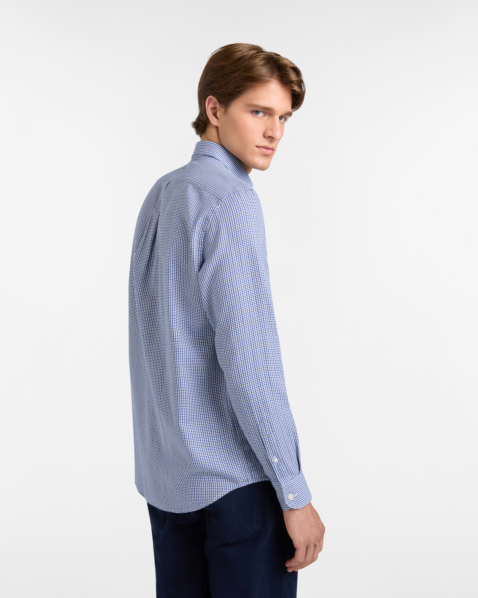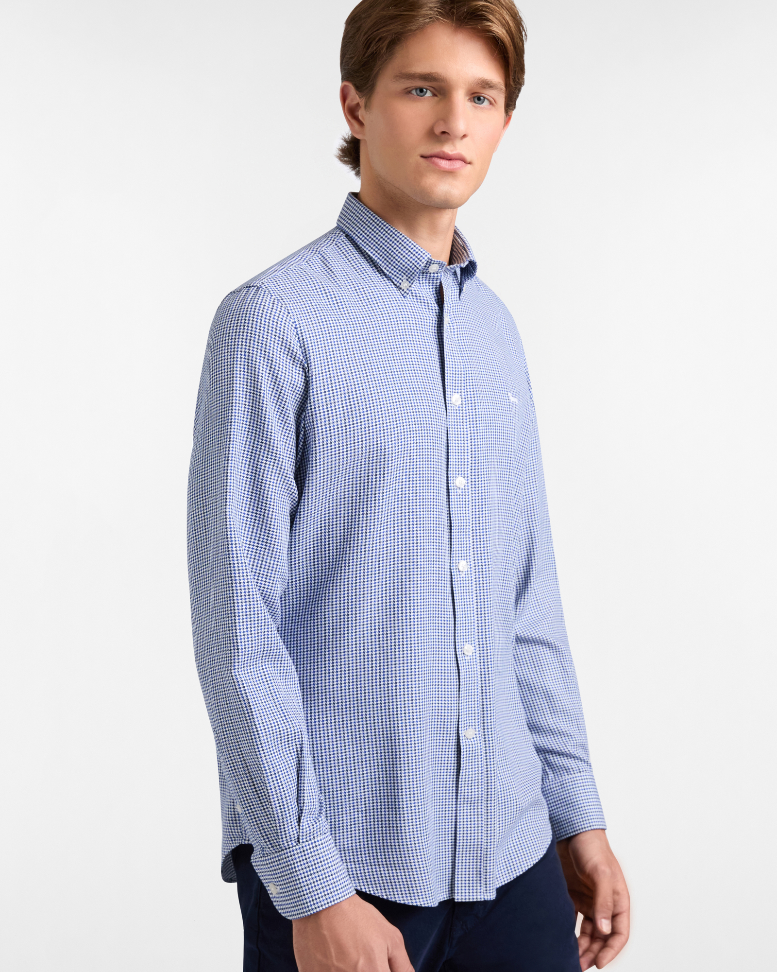 Contraddistinta da un raffinato micro motivo pied-de-poule all over, questa camicia da uomo in puro cotone armaturato è perfetta per accompagnarvi con disinvoltura durante i vostri impegni del tempo libero. Il capo, presentato in una confortevole vestibilità regular, è caratterizzato inoltre da un pratico collo con bottoncini, mentre sul davanti figura l'iconico bassotto ricamato a contrasto sul petto, firma inconfondibile di Harmont & Blaine.