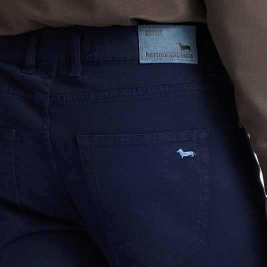HARMONT & BLAINE PANTALONE MODELLO 5 TASHE NARROW FIT UOMO-Realizzati in comoda e resistente gabardine di cotone stretch tinto in capo, i pantaloni cinque tasche da uomo firmati Harmont & Blaine vi accompagneranno con disinvoltura durante tutta la giornata. Il modello, dotato di chiusura con zip nascosta e bottone, si caratterizza per gli elementi personalizzati tipici del brand, come il rivetto bassotto in corrispondenza del quinto taschino, il bassotto ricamato a contrasto su una delle due tasche posteriori applicate e la salpa logata sul retro. Il modello si presenta in una vestibilità narrow, perfetta per chi preferisce un fit un po' più aderente.