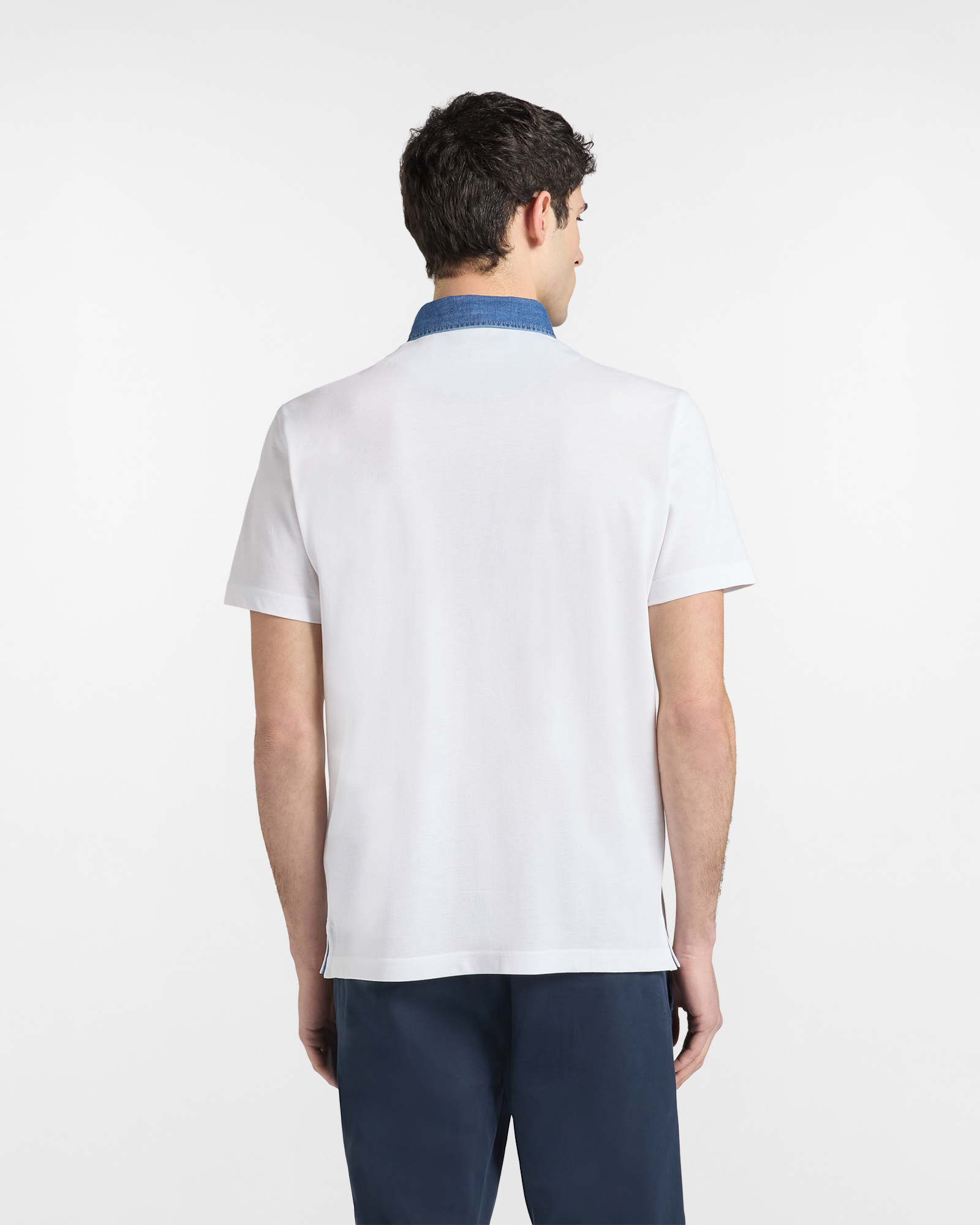 Capo iconico e simbolo della creatività di Harmont & Blaine, la polo Vietri a maniche corte da uomo in piquet di cotone mercerizzato, è caratterizzata da un collo realizzato con tessuto a contrasto, in questo modello il colletto è in denim. Il capo, proposto in una confortevole vestibilità regular, si caratterizza per il cannoncino con primo bottone visibile e per l'immancabile ricamo del bassotto a contrasto lato cuore. Vestibilità regular.